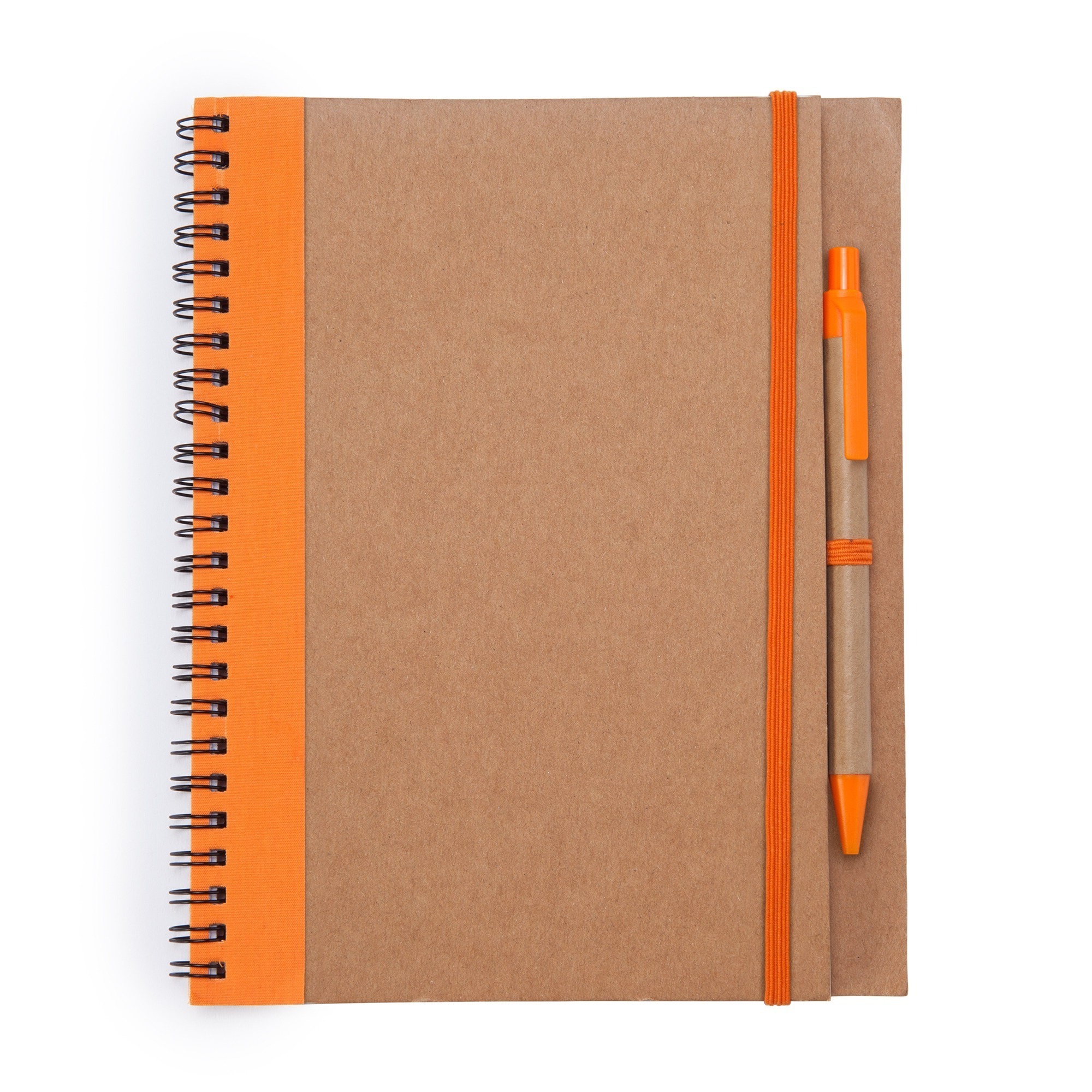 Quaderno rilegato a spirale con copertina rigida in cartone riciclato. Include una penna abbinata con inchiostro blu. 60 pagine.