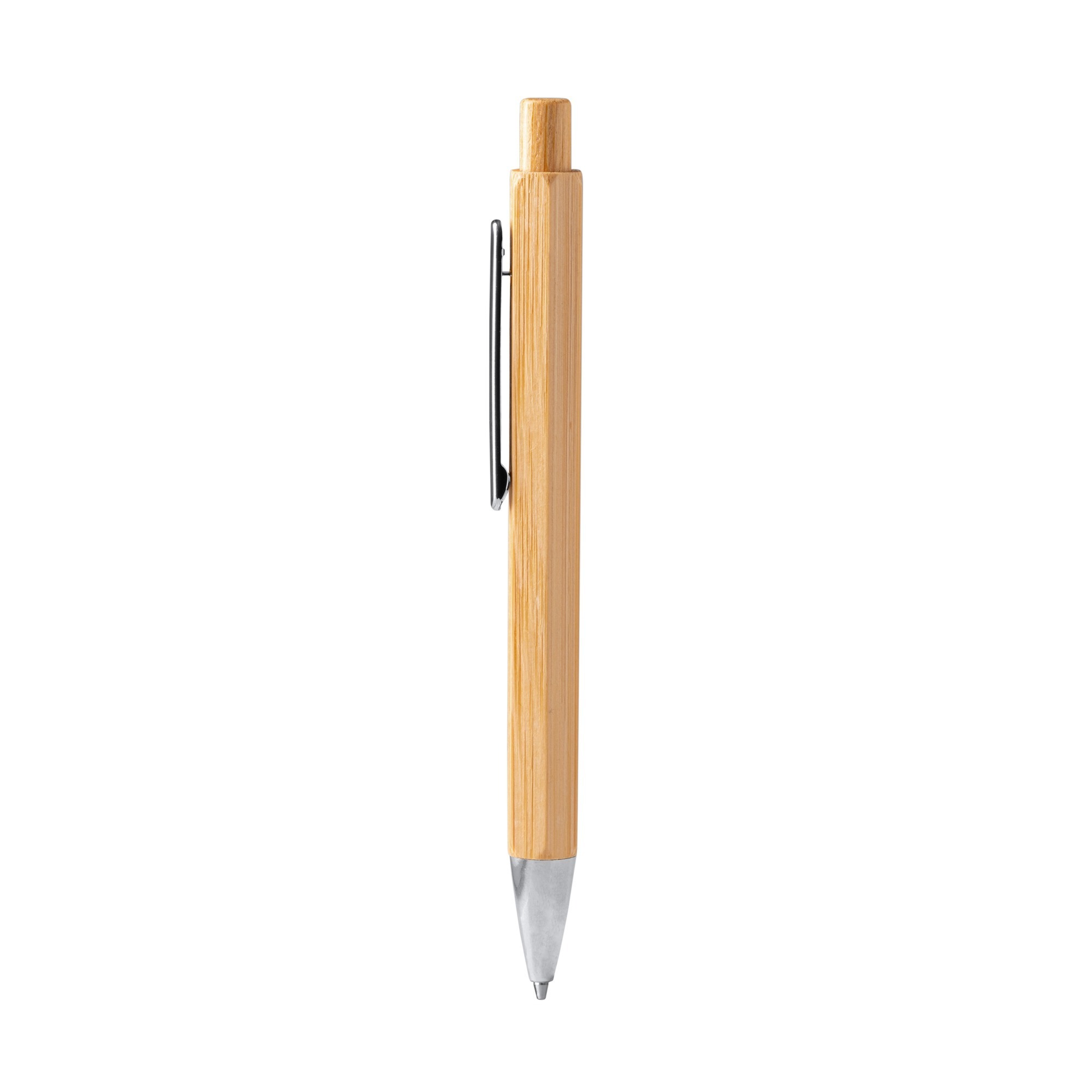 Penna esagonale con corpo in metallo e pulsante in bambรน. Dettagli cromati. Inchiostro blu.