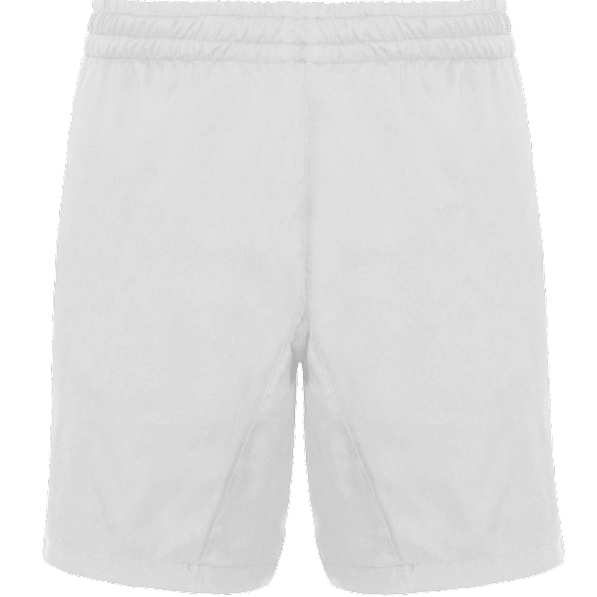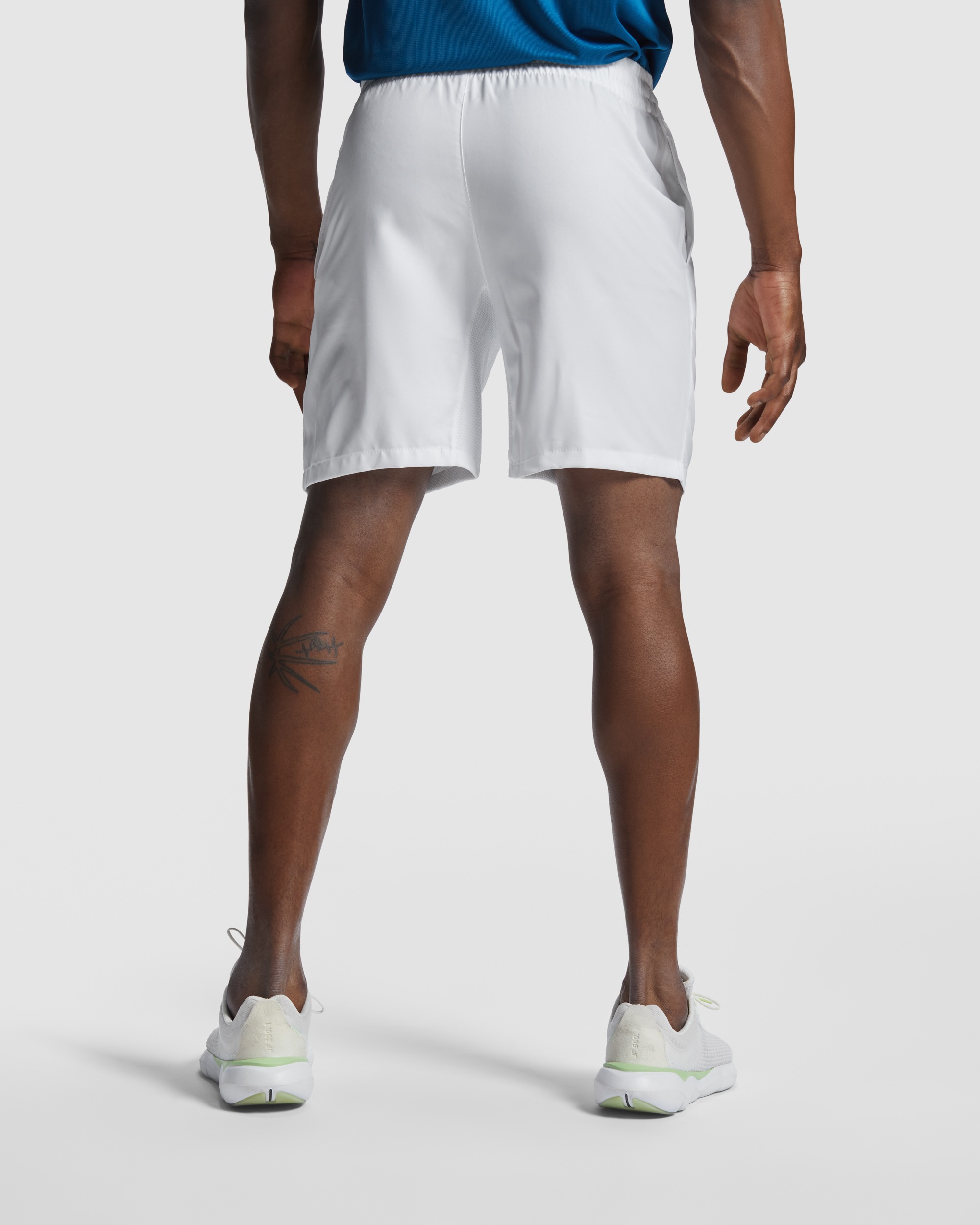 Pantaloncini sportivi con tasche laterali. Girovita elastico con cordoncino per regolazione. Tessuto leggero e traspirante con interno in maglia di microfibra.