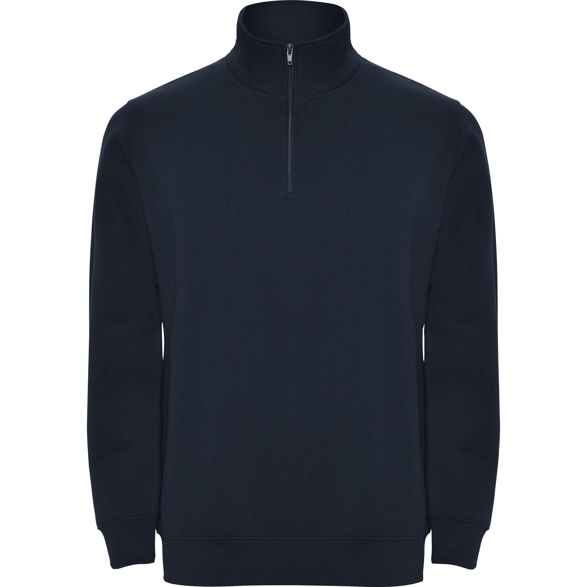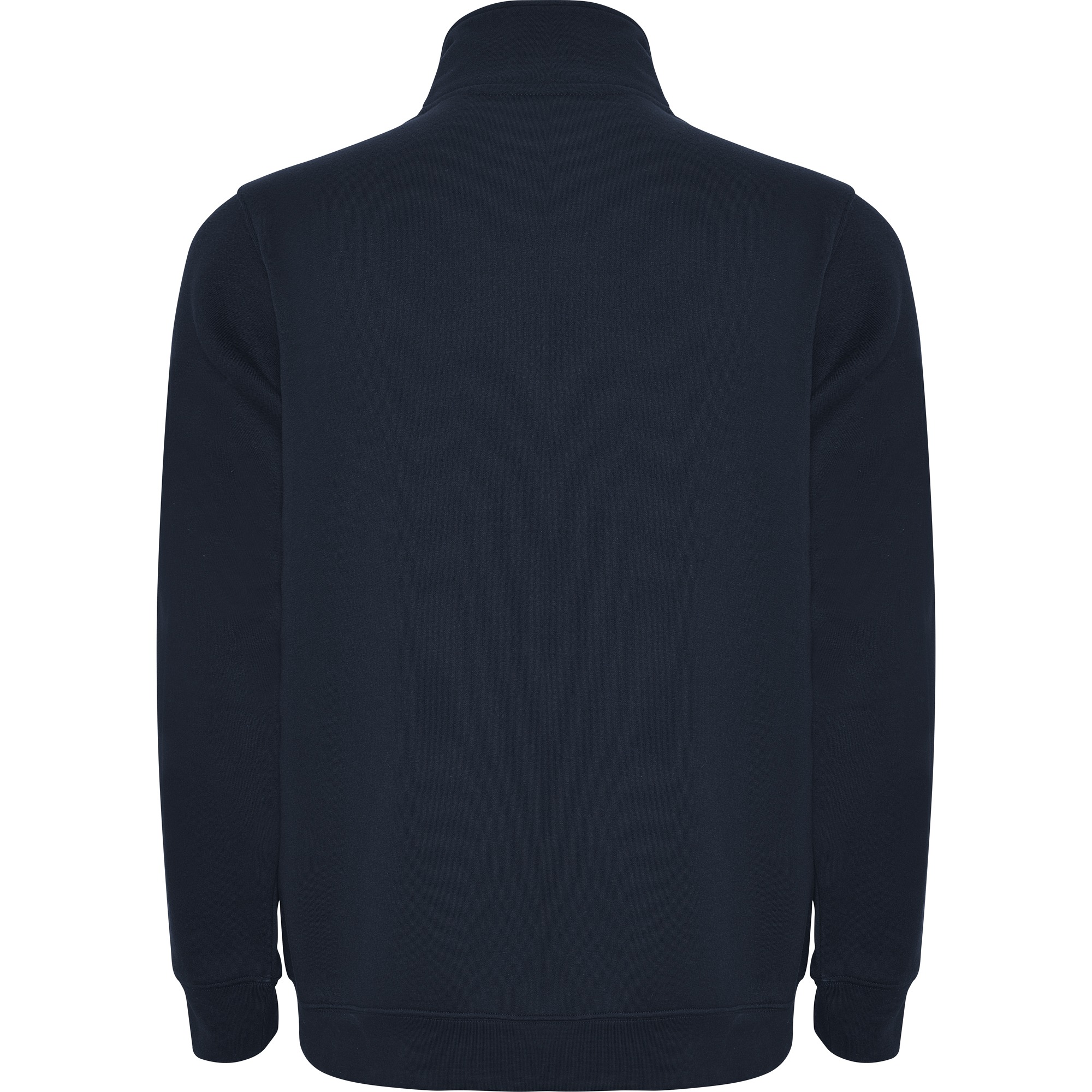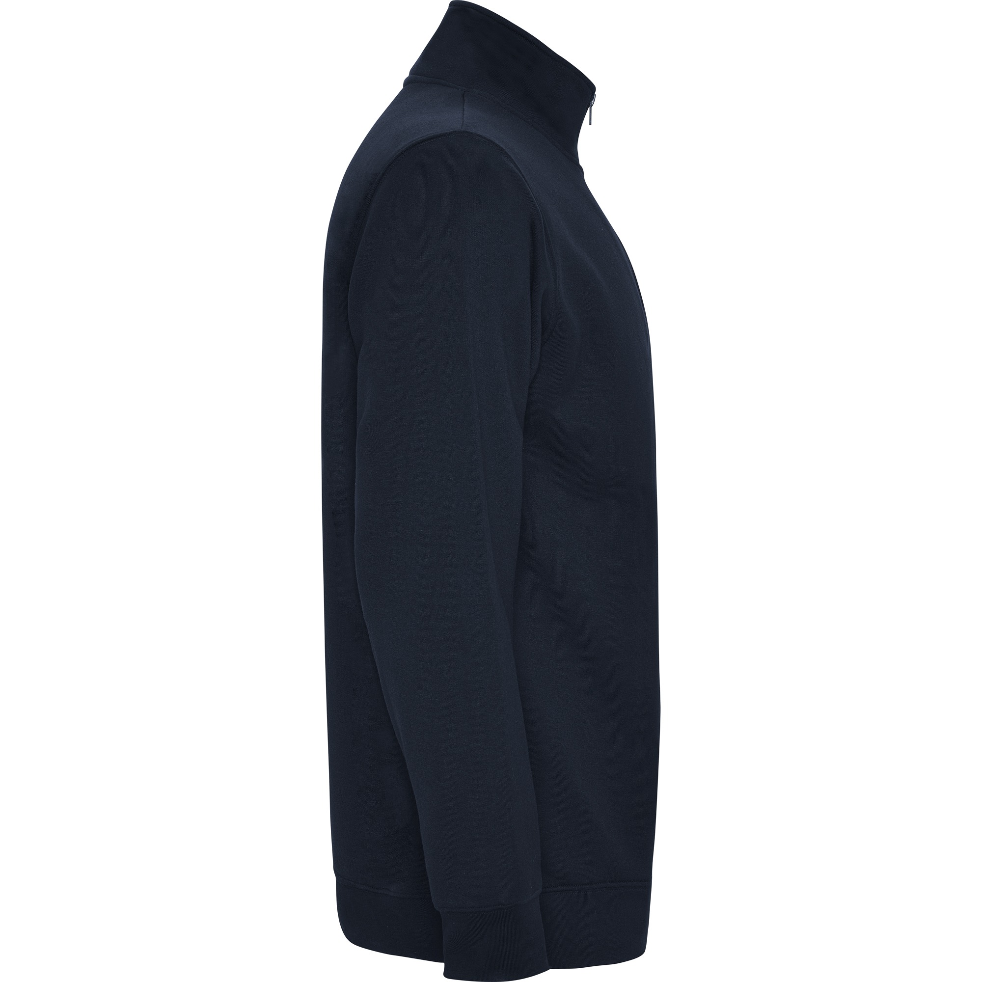 Felpa con mezza cerniera in tinta e collo alto. Parte interna del colletto nello stesso colore. Copri cuciture rinforzate all’interno del collo. Costine 1×1 nei polsini e nel girovita.