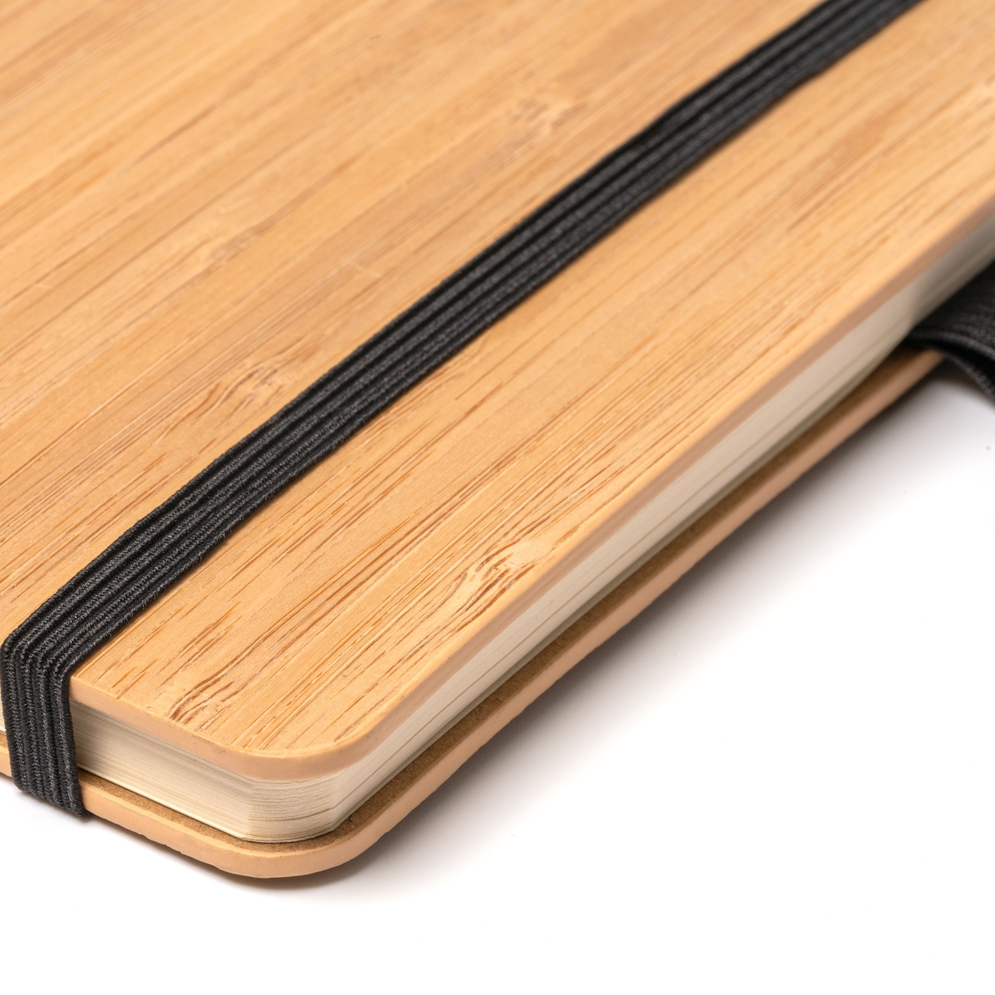 Quaderno A5 con copertina in bambรน e sughero. Portapenne. Segnapagina ed elastico. 80 fogli a righe.