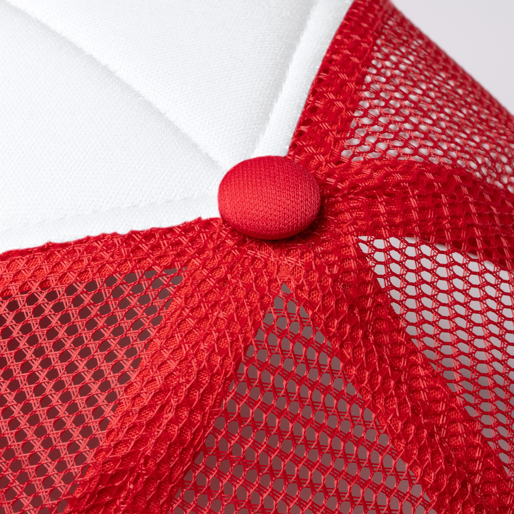 Berretto a 5 sezioni in poliestere con frontalino imbottito di colore bianco. Retro a rete e chiusura regolabile.