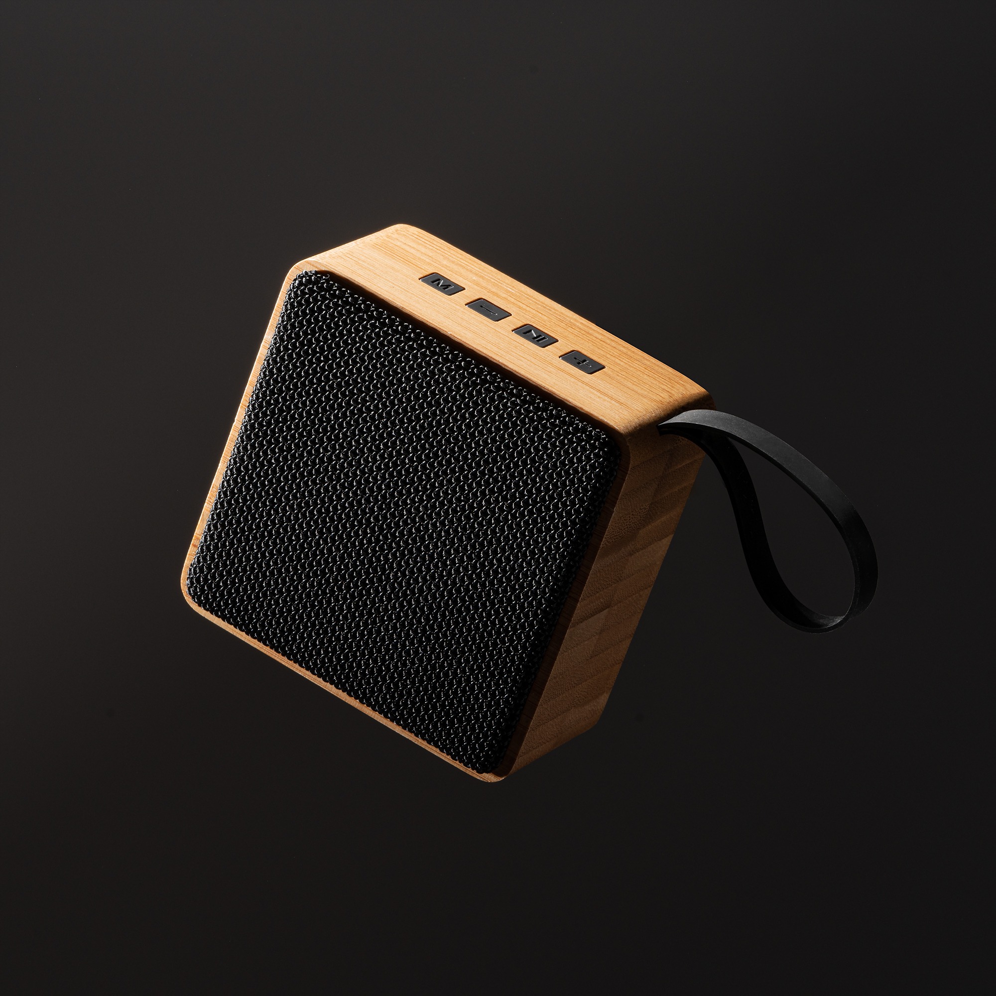 Cassa wireless con struttura principale in bambรน e tessuto RPET. Uscita da 3W e batteria ricaricabile. Connessione di tipo C. Cavo incluso. Confezione in scatola dal design ecologico.