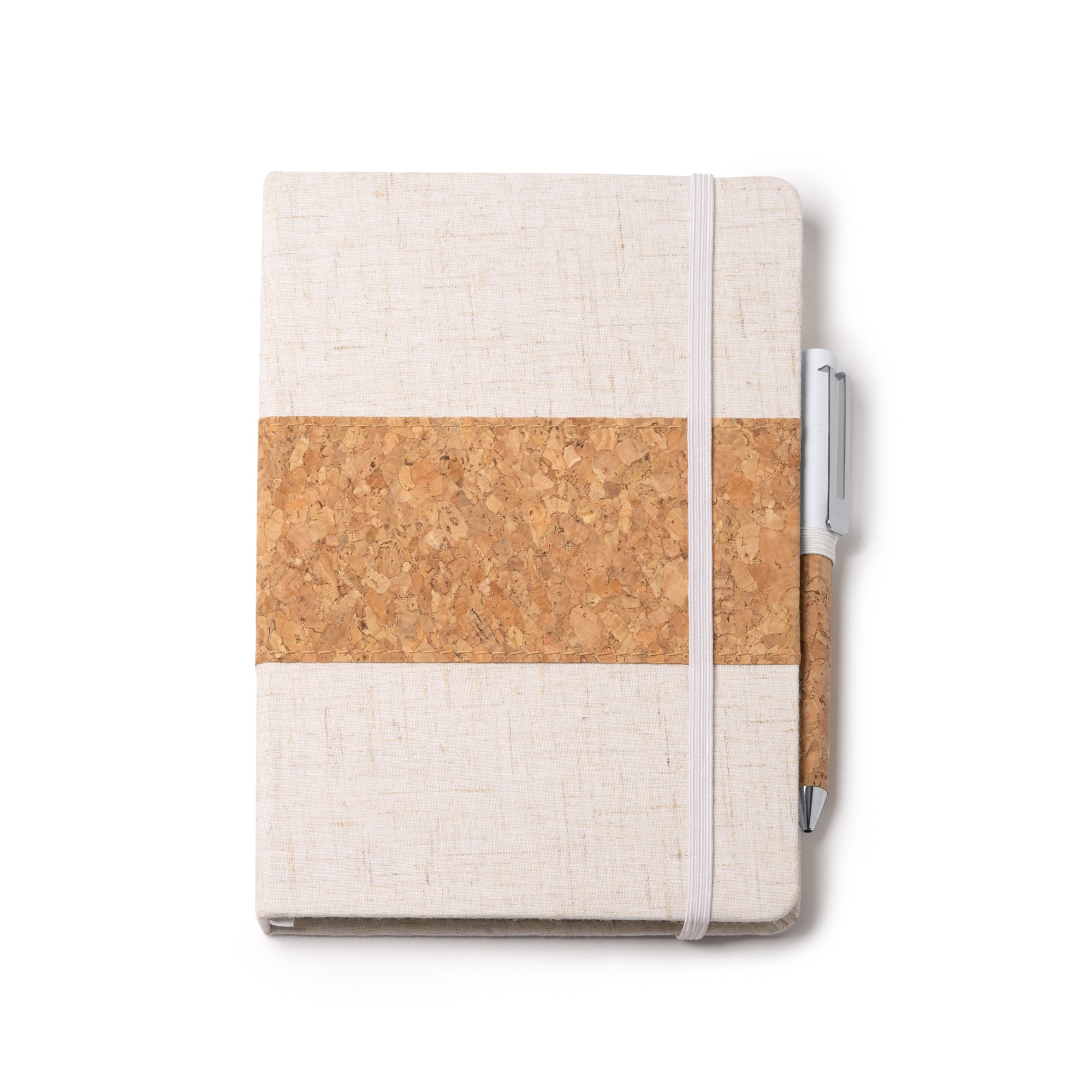 Quaderno A5 e set di penne contenuti in un astuccio di cartone kraft. Quaderno con copertina rigida in cotone e sughero con 80 fogli a righe. Penna a sfera metallica con impugnatura in sughero. Inchiostro blu.