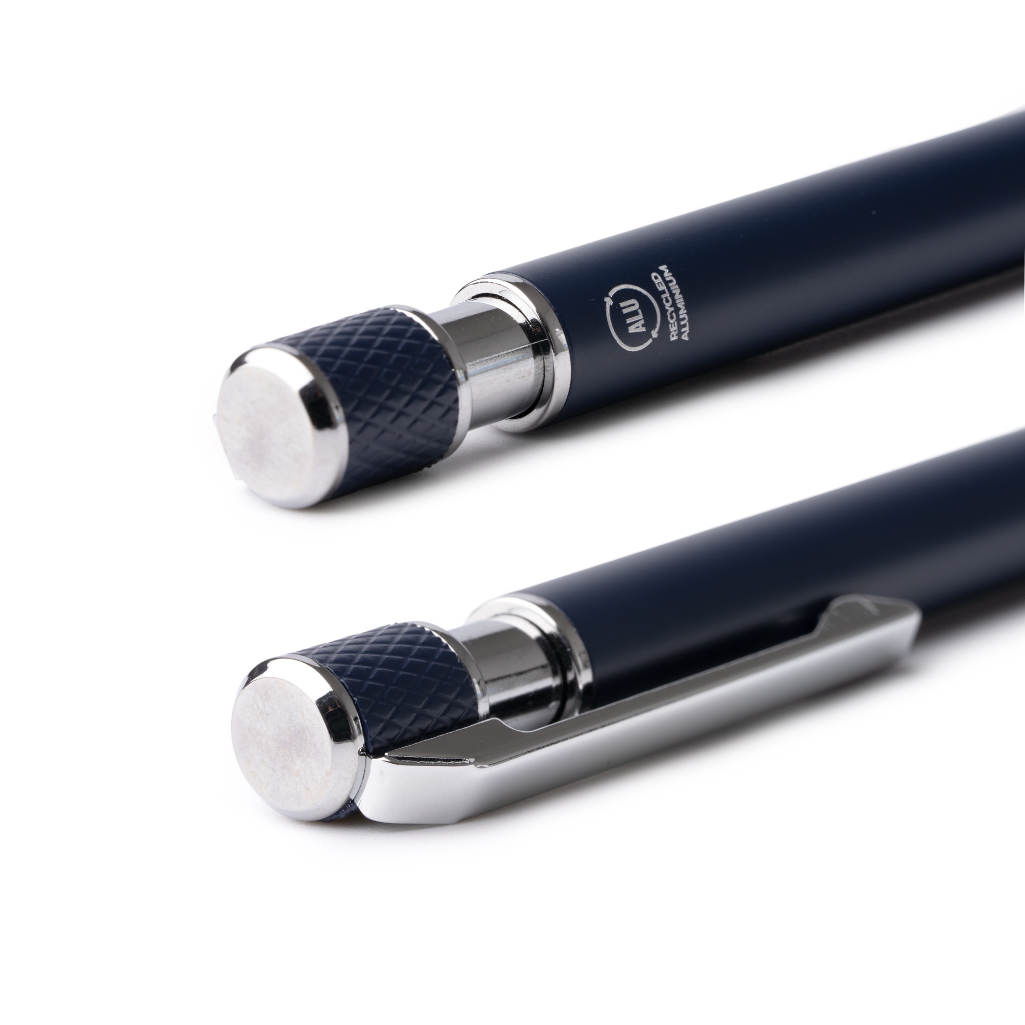 Penna in alluminio riciclato con finitura opaca liscia e dettagli argentati. Impugnatura e pulsante testurizzati. Inchiostro blu.