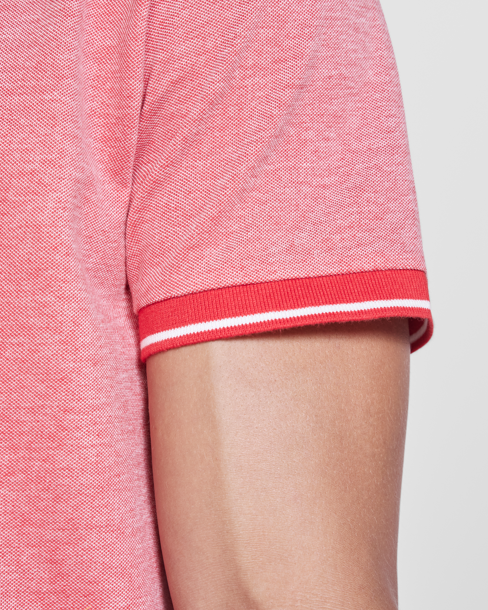 Polo manica corta. Colletto e giromaniche in tinta unita con costina 1×1 e dettaglio decorativo in contrasto. Chiusura con nastro decorativo in contrasto 3 bottoni. Giromanica con dettagli in contrasto. Girovita con aperture laterali e nastro decorativo. La parte posteriore รจ leggermente piรน lunga della parte frontale.
