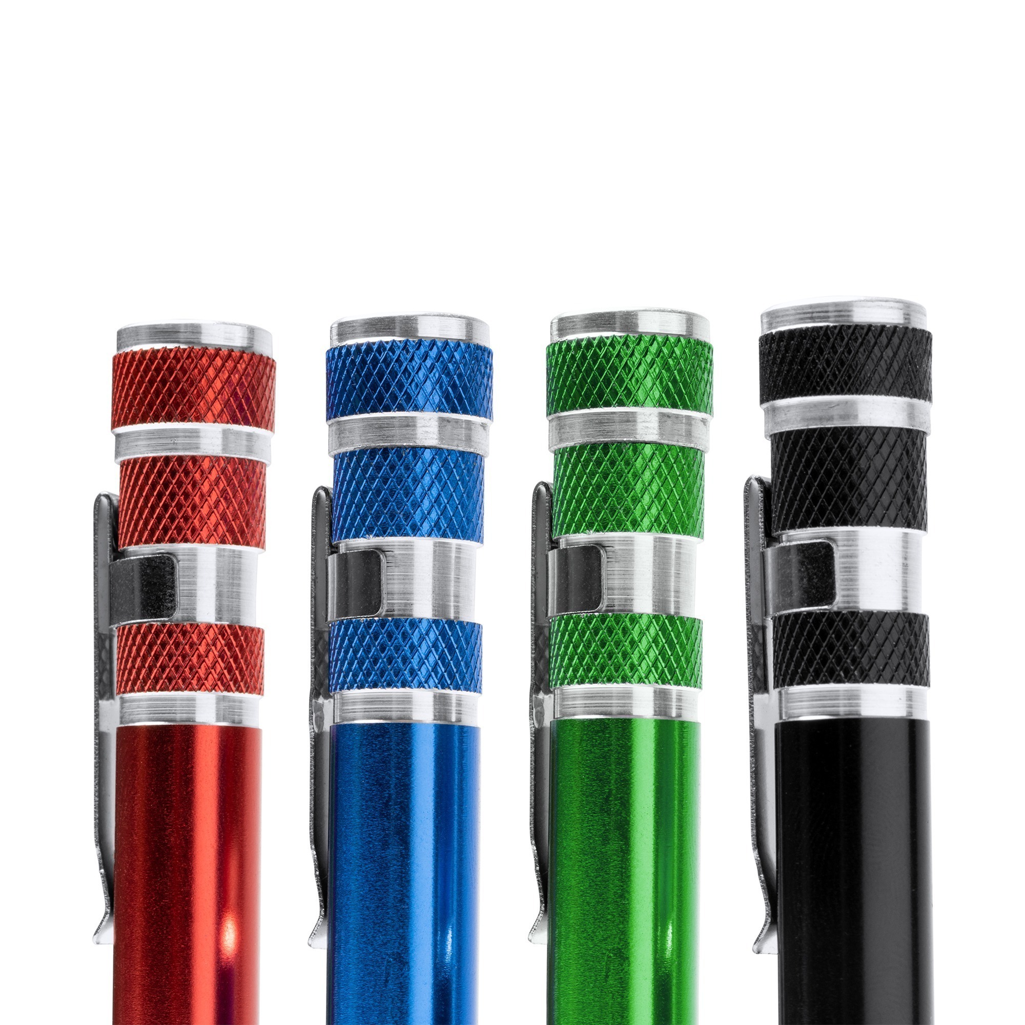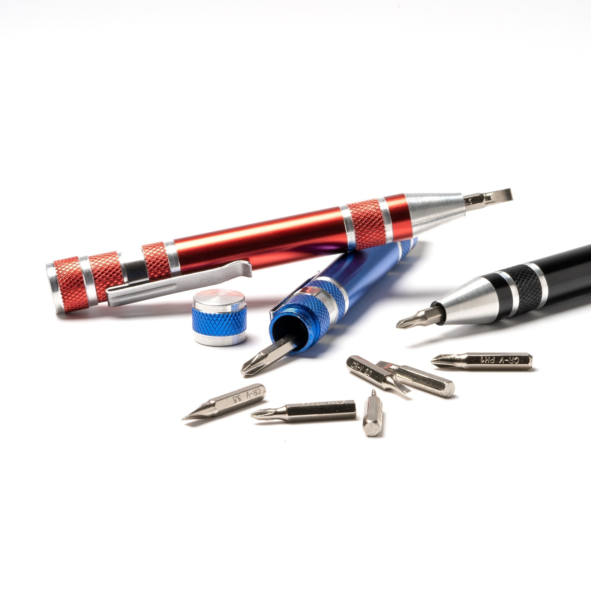 Utensile multiuso in alluminio a forma di penna. 8 teste di cacciavite, a stella e piatte, incluse.