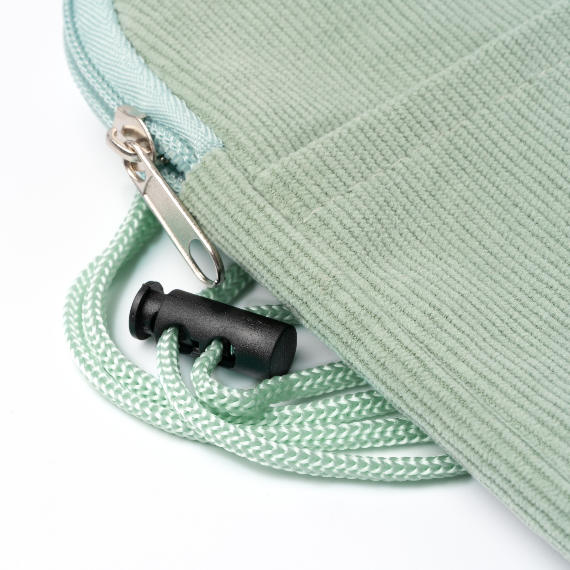 Porta cellulare realizzato in velluto a coste. Scomparto principale con chiusura a zip in tinta. Tasca esterna. Include una tracolla abbinata.