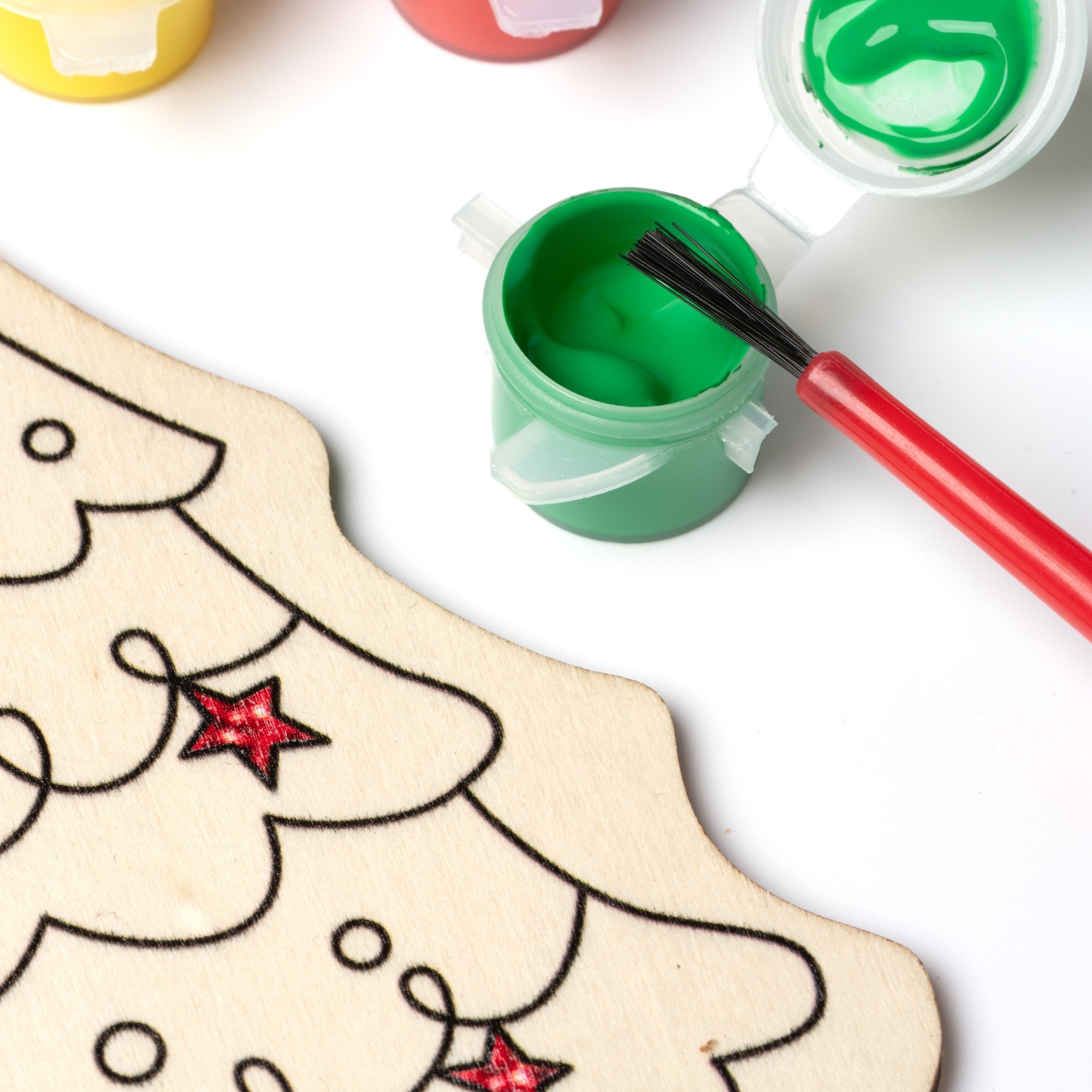 Set da colorare con disegno natalizio in legno, comprensivo di pennelli a tre colori. Ideale per i bambini per esplorare la loro creativitร durante le festivitร .