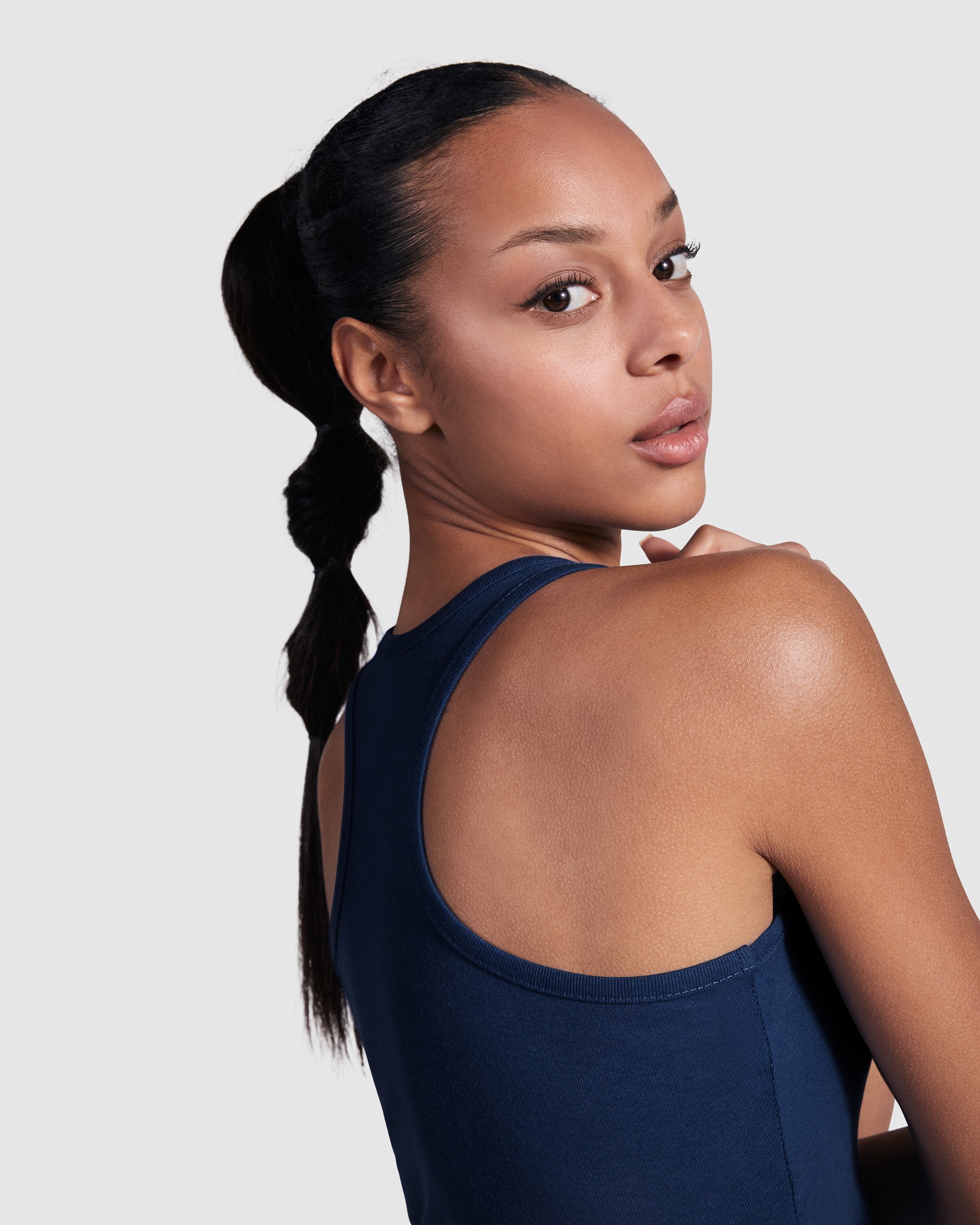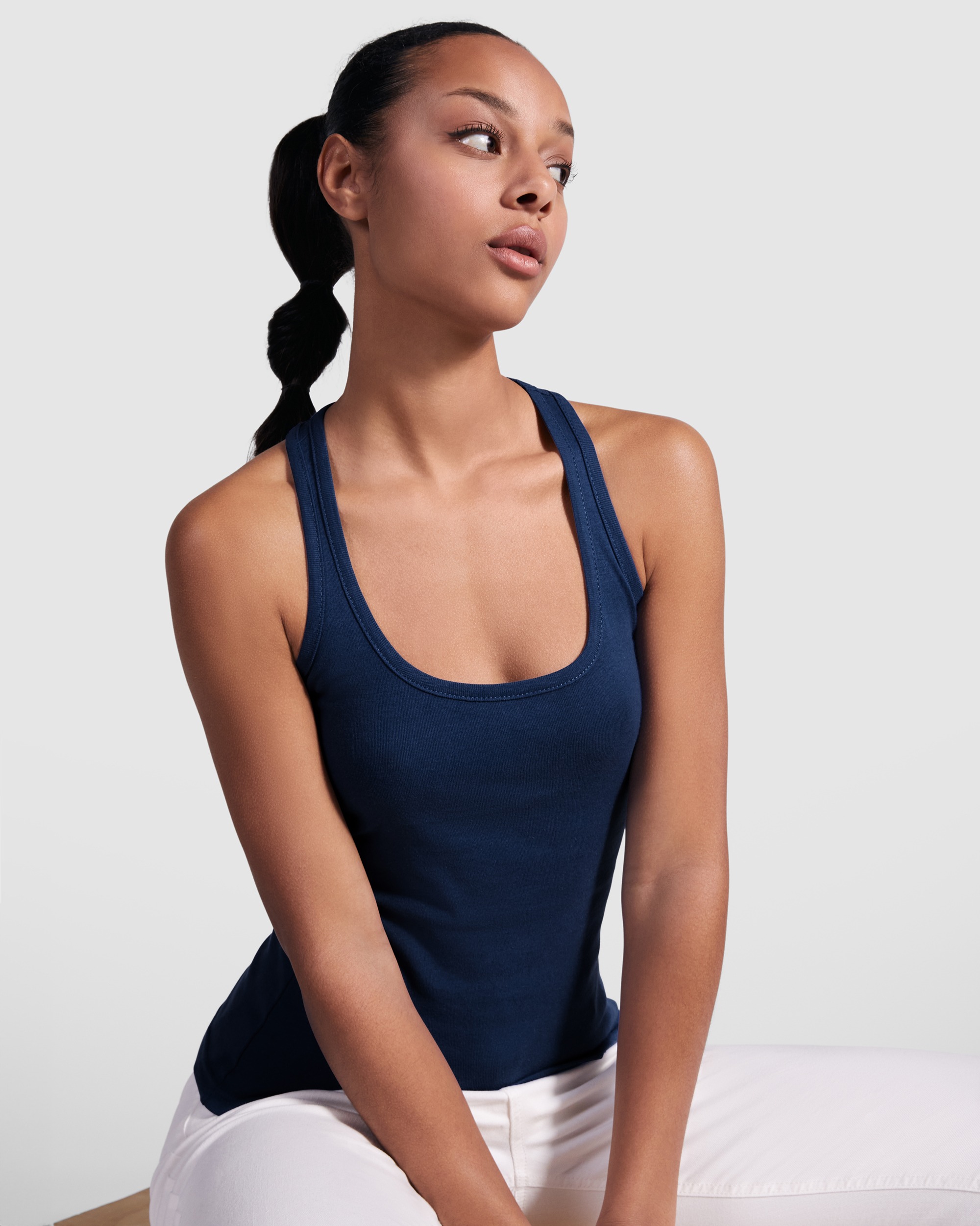 Canotta aderente. Giromanica e scollatura orlata, Spalline sul retro stile vogatore. Cuciture laterali.