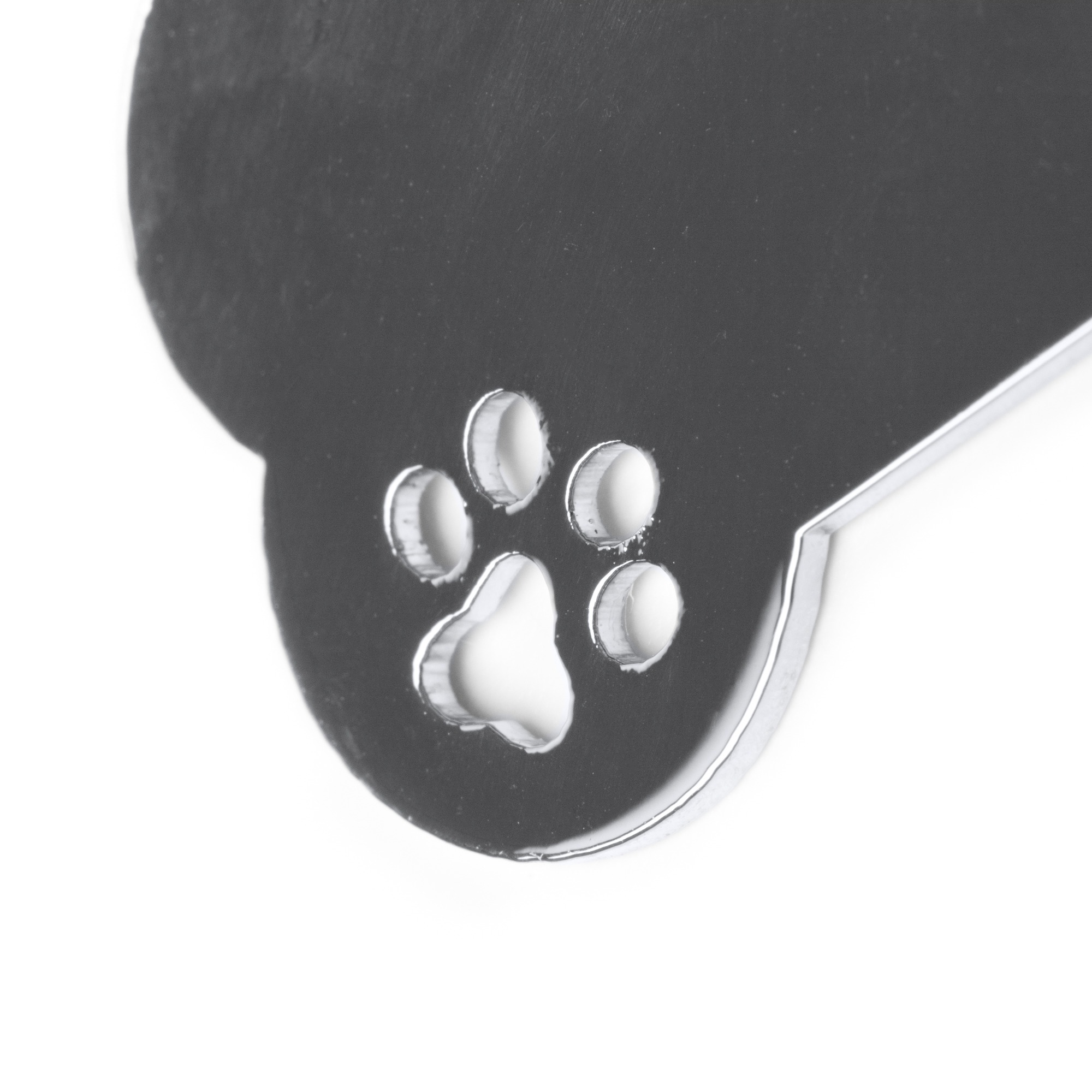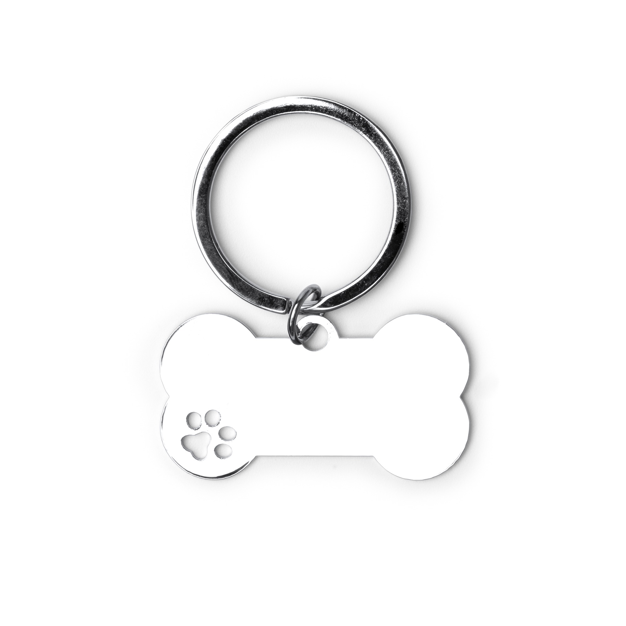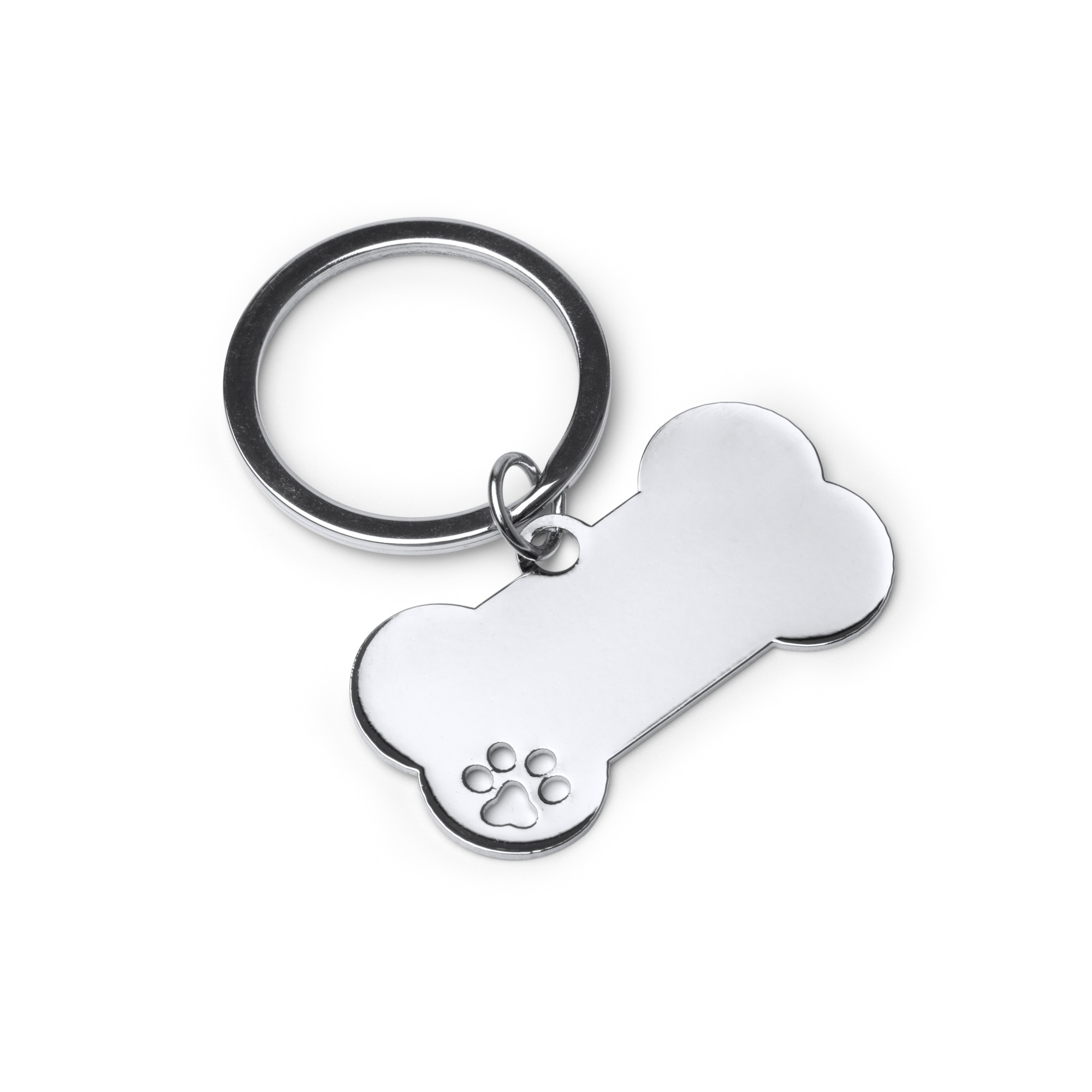 Portachiavi in metallo 201 con motivo a forma di osso. Presenta un dettaglio a forma di zampa sul lato.