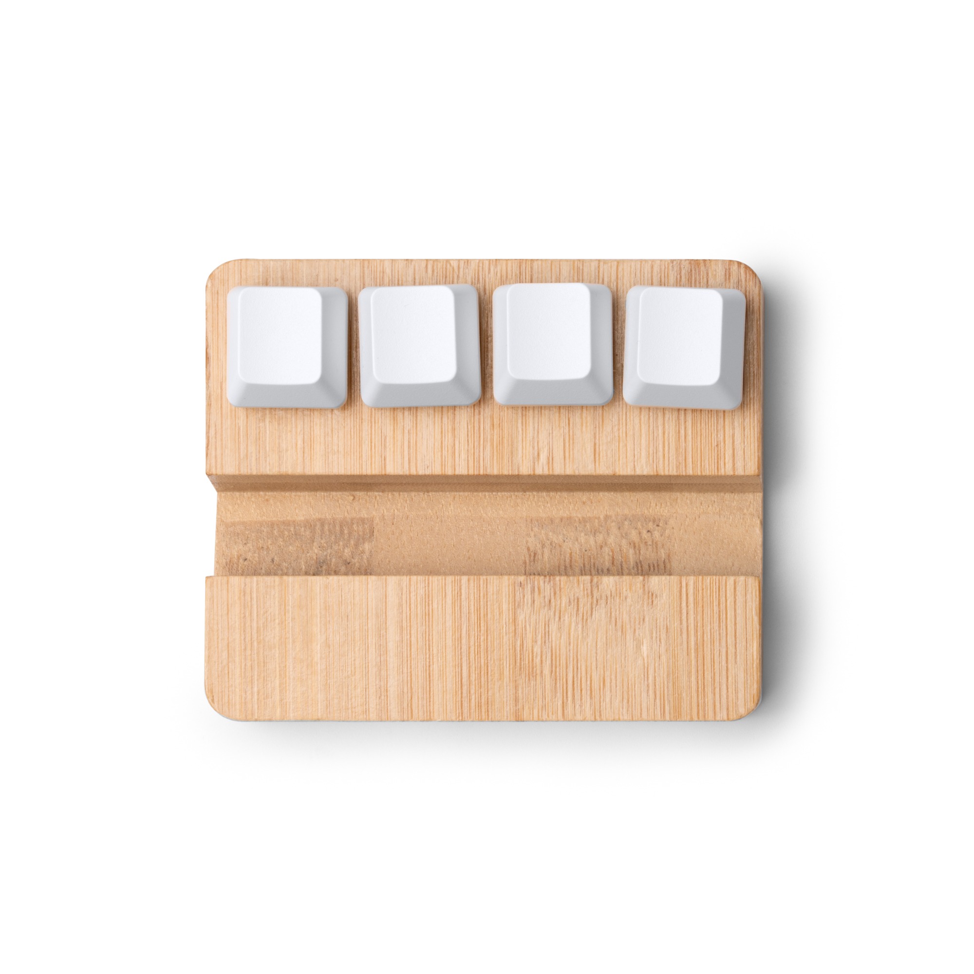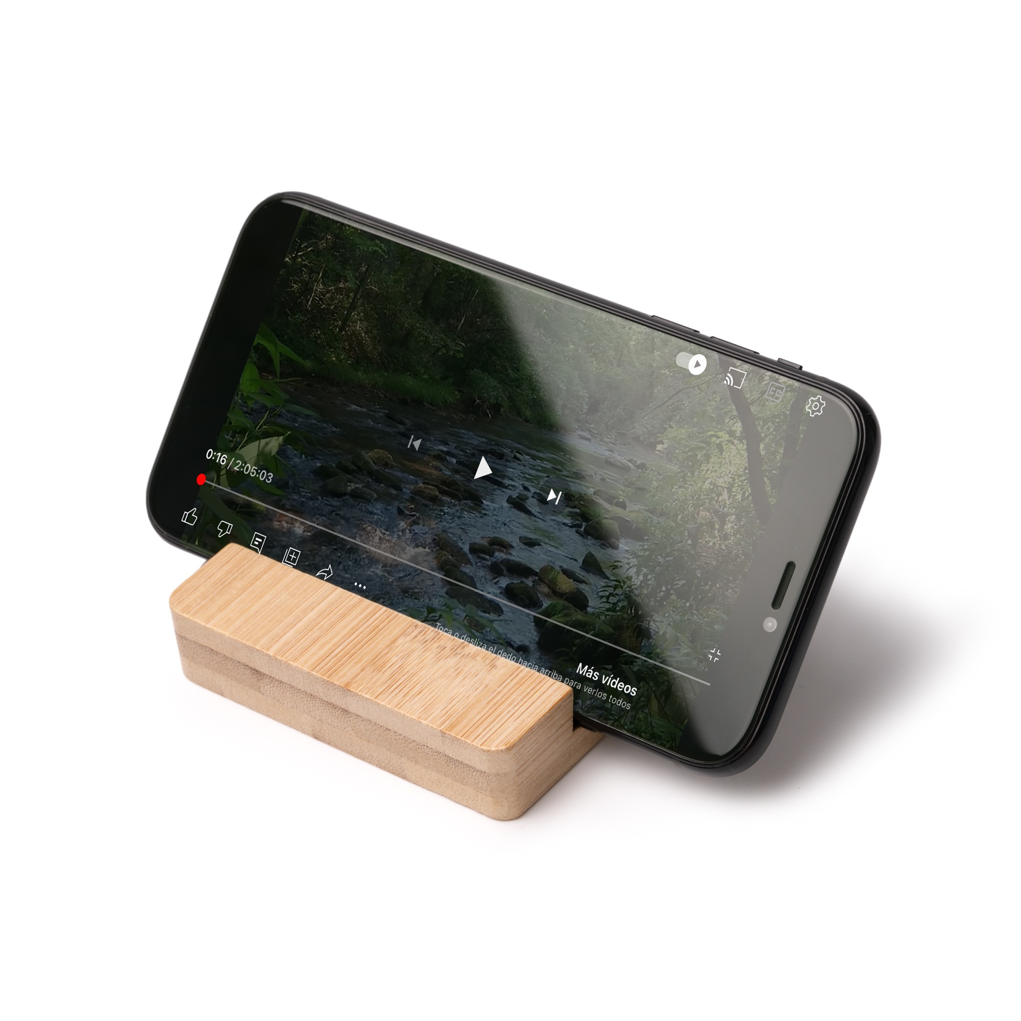 Supporto per smartphone in bambรน con funzione antistress. Il suo design presenta quattro tasti che รจ possibile premere e utilizzare come antistress.