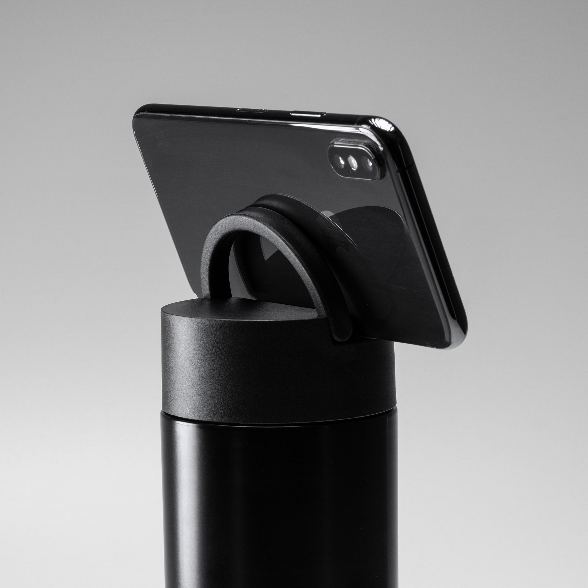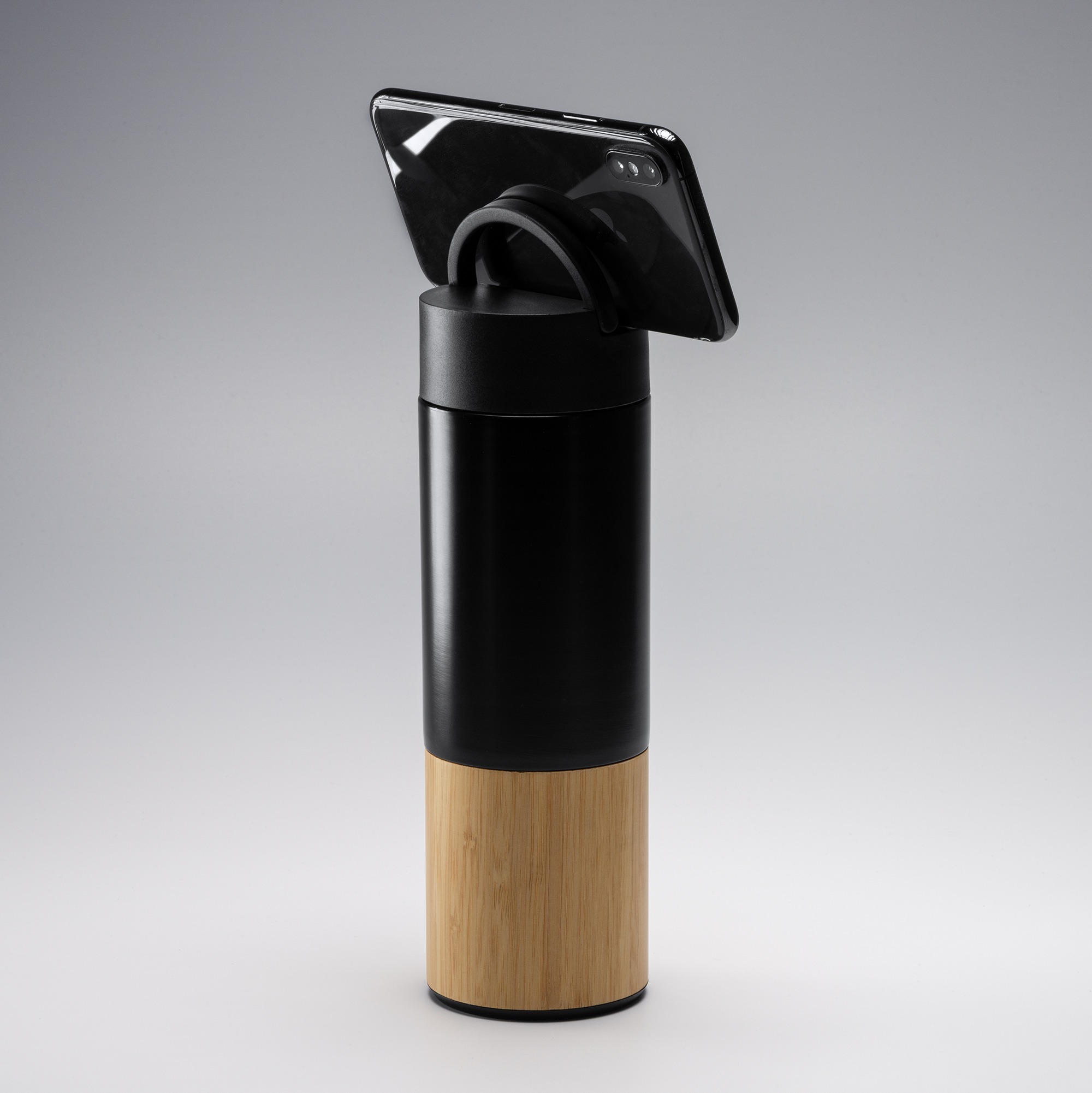Bottiglia termica a doppia parete in acciaio inox 304 con dettaglio in bambรน. Bottiglia ideale per mantenere le bevande fredde e calde. Coperchio con funzione di supporto dell’impugnatura, ideale per gli smartphone. Capacitร 450 ml.