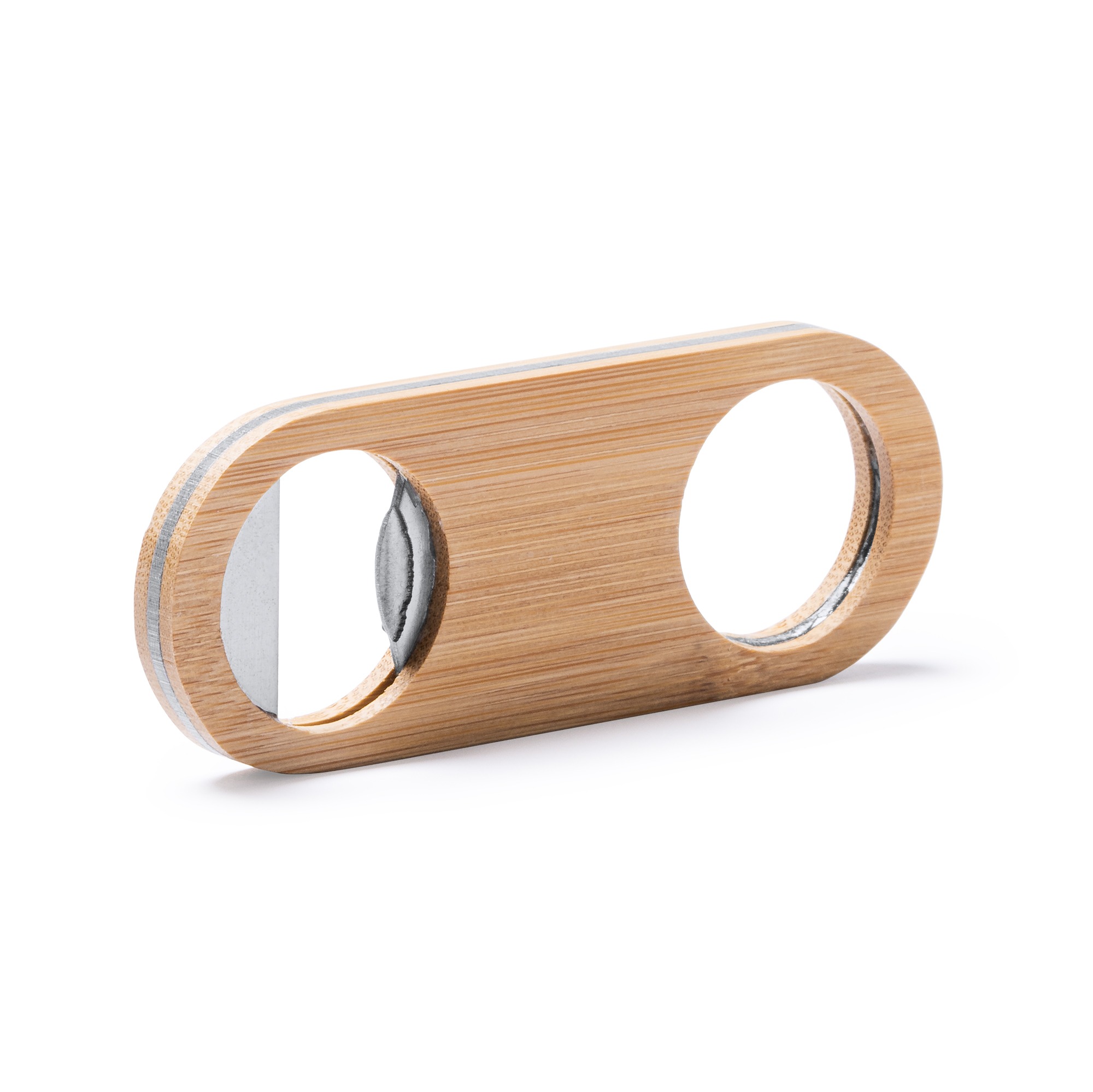 Apriscatole dal design compatto realizzato in bambรน con interno in acciaio inox e parte superiore pressofusa per essere appeso.
