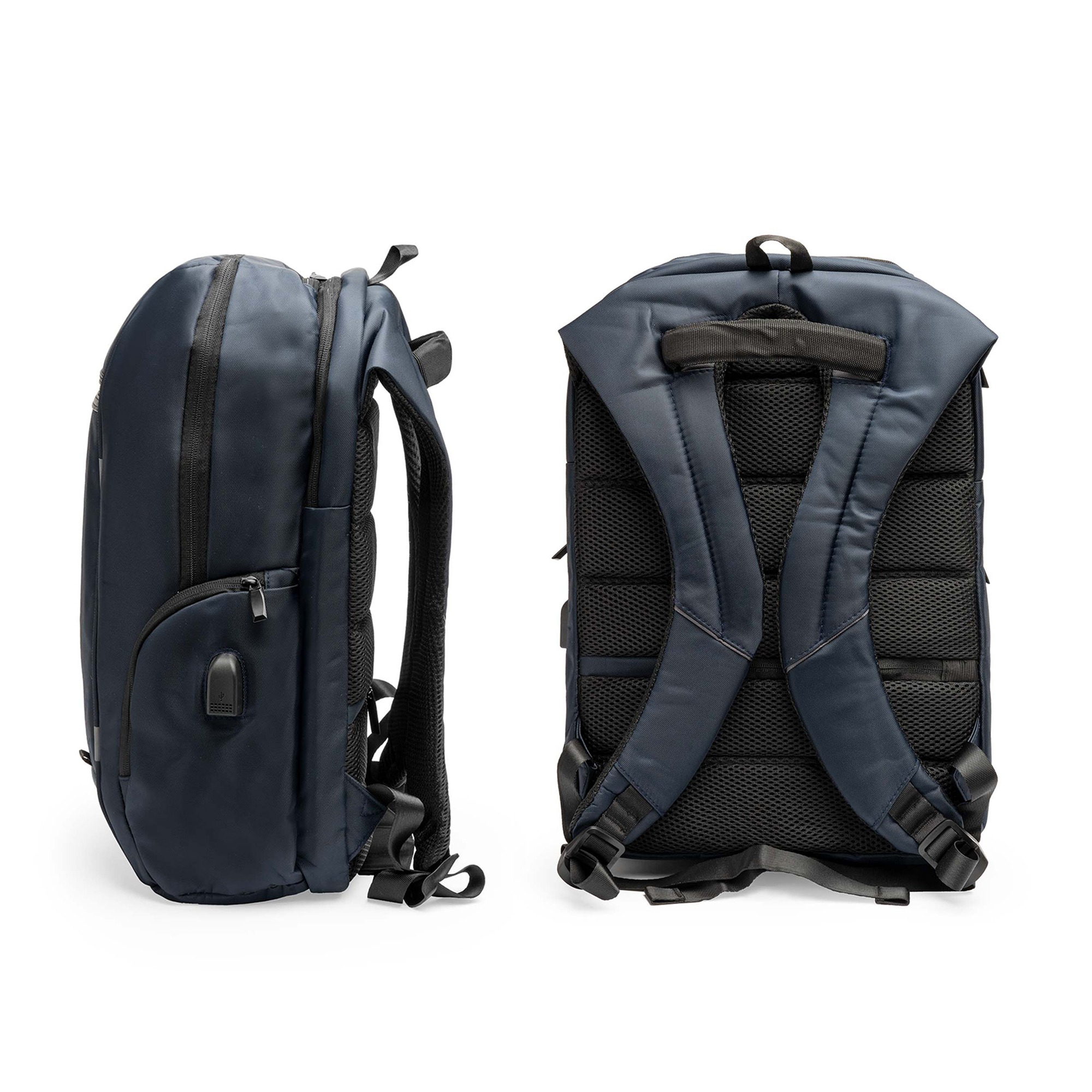 Zaino in nylon. Tasca interna imbottita ideale per il computer portatile (17″). Spallacci e schiena imbottiti. Scomparto con uscita USB per collegare un power bank (non incluso). Include un cavo micro USB.