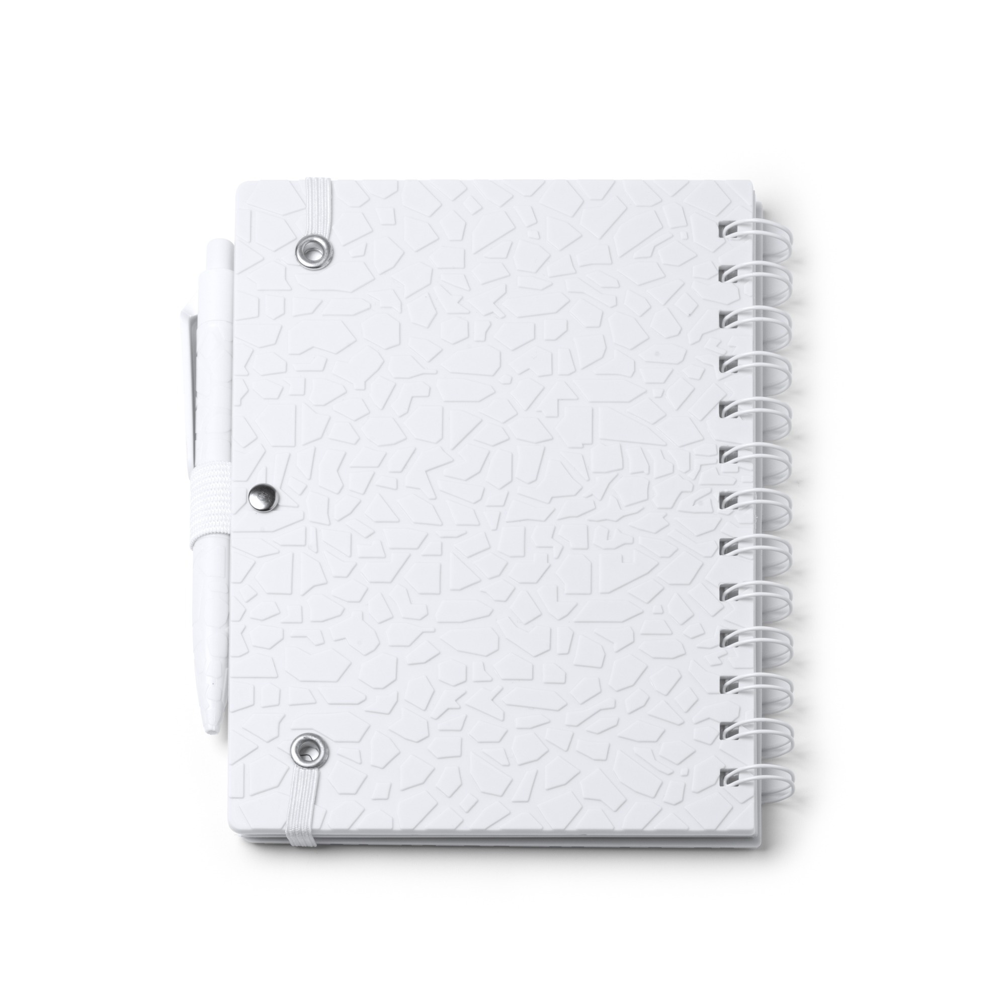 Quaderno A5 realizzato con estratti di pietra. Copertina rigida e doppie molle. Penna a sfera e portapenne abbinati. Inchiostro blu. 70 fogli a righe.