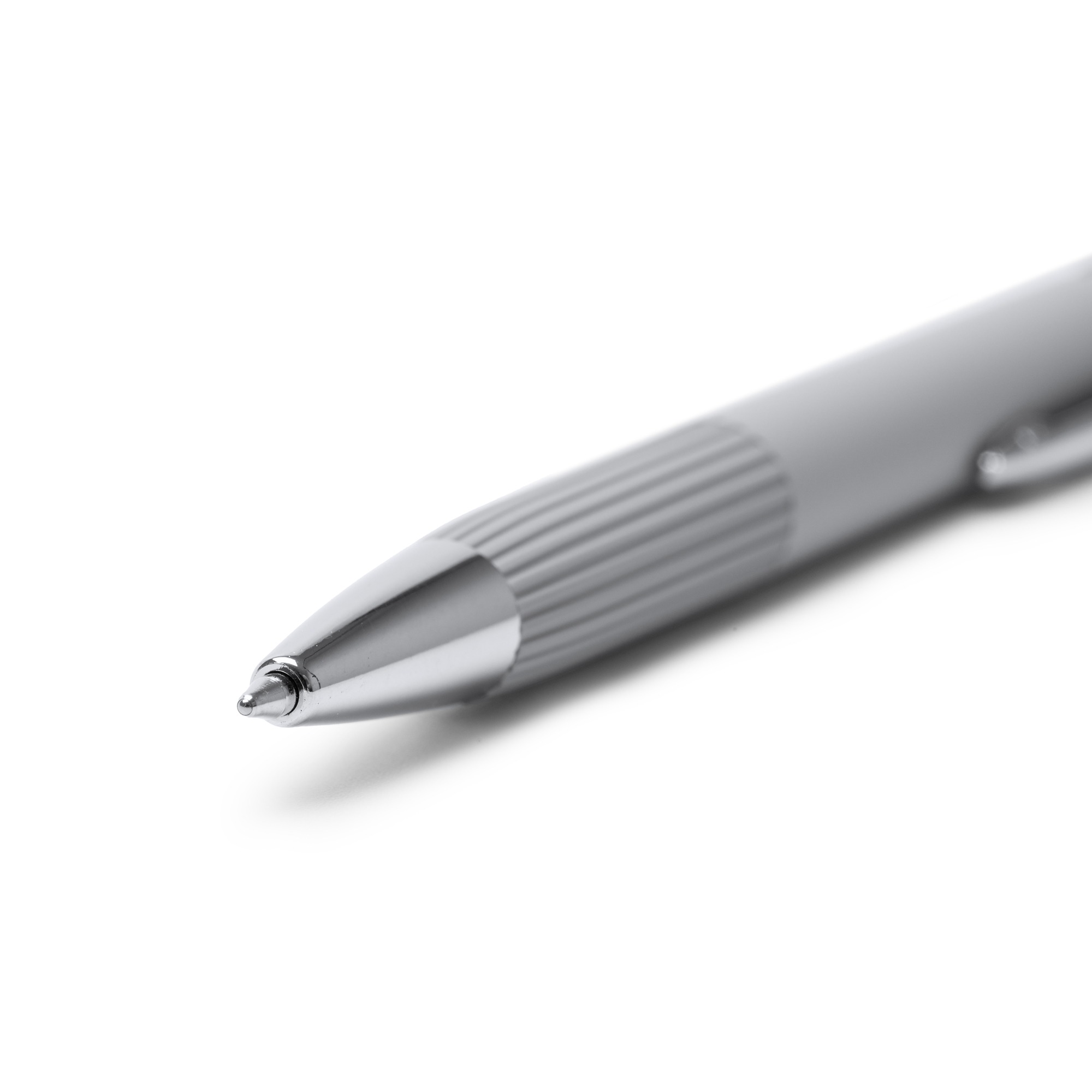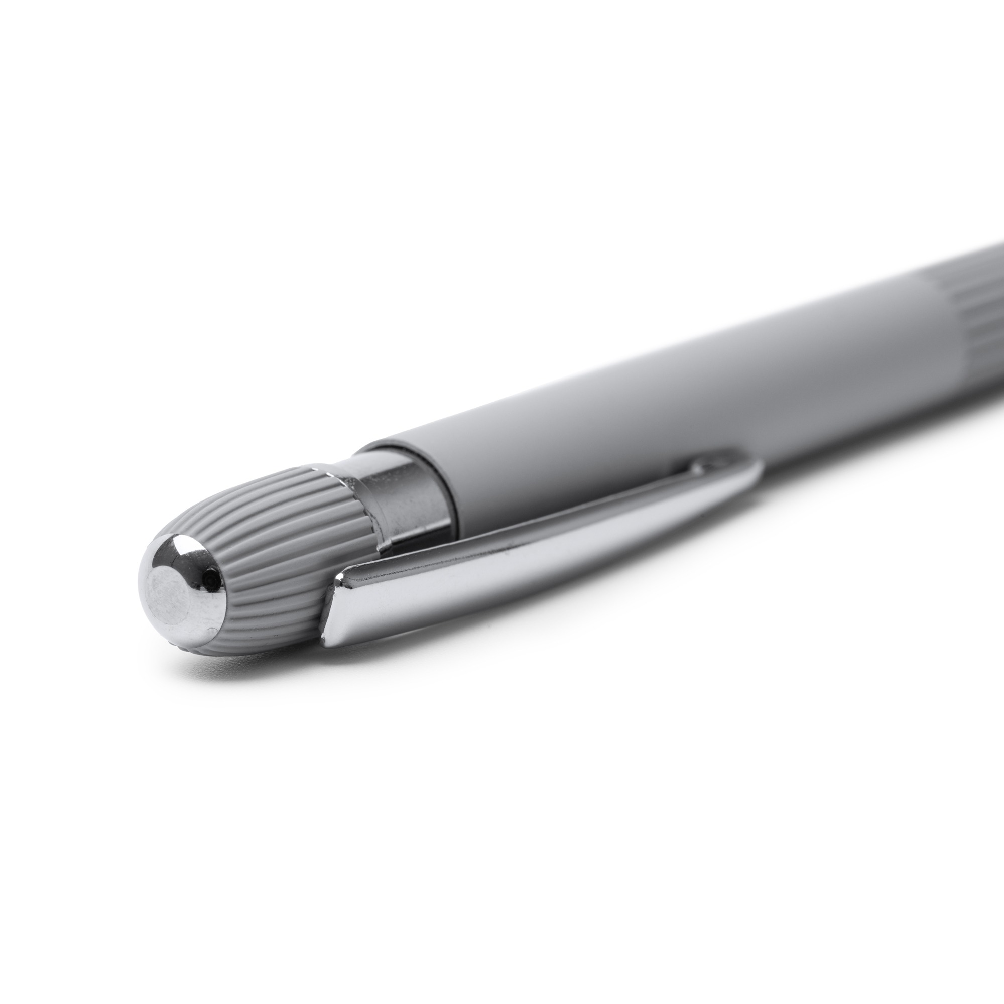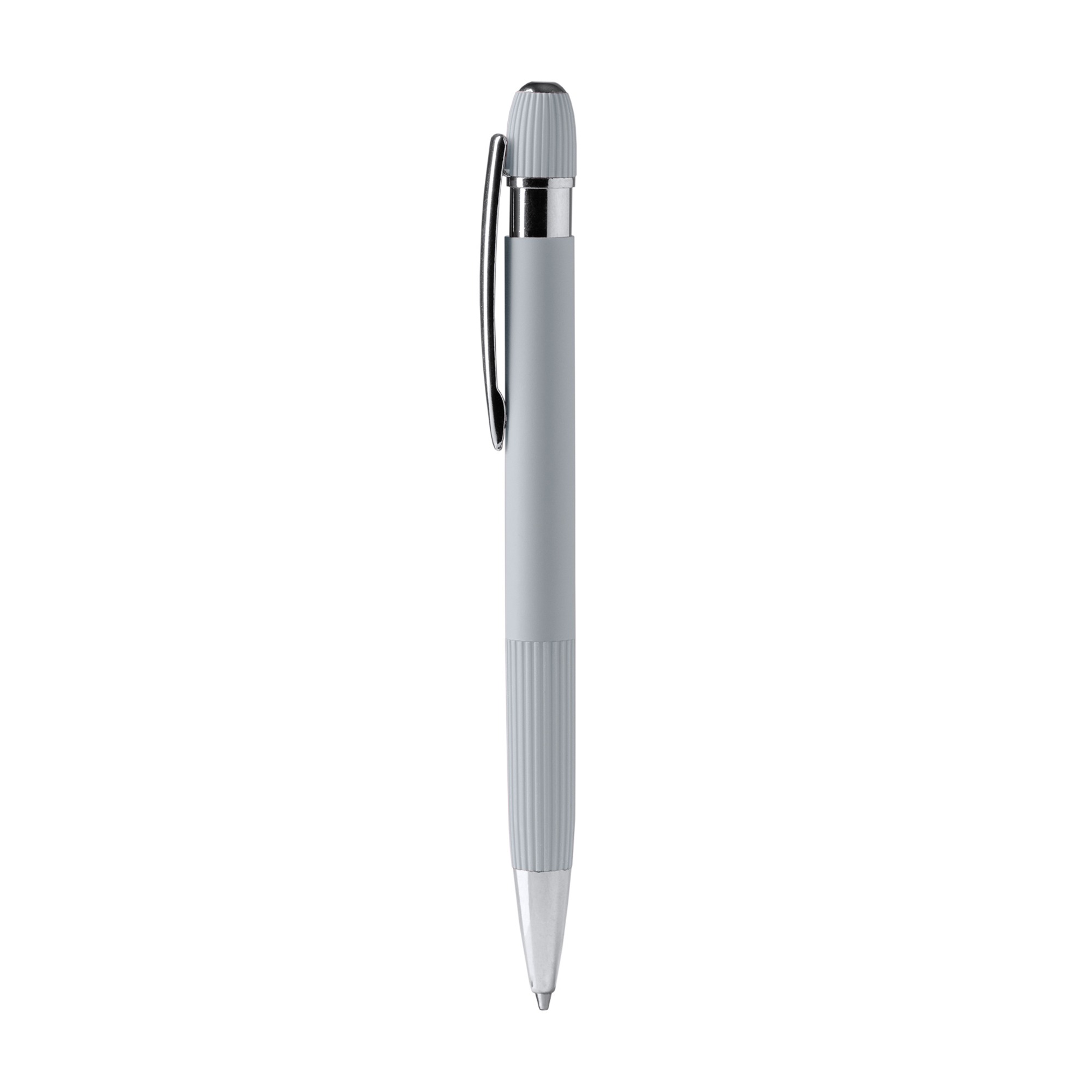 Penna con corpo in alluminio riciclato con impugnatura a righe e finitura touch in gomma opaca. Dettagli in finitura cromata. Ricarica jumbo inchiostro blu.