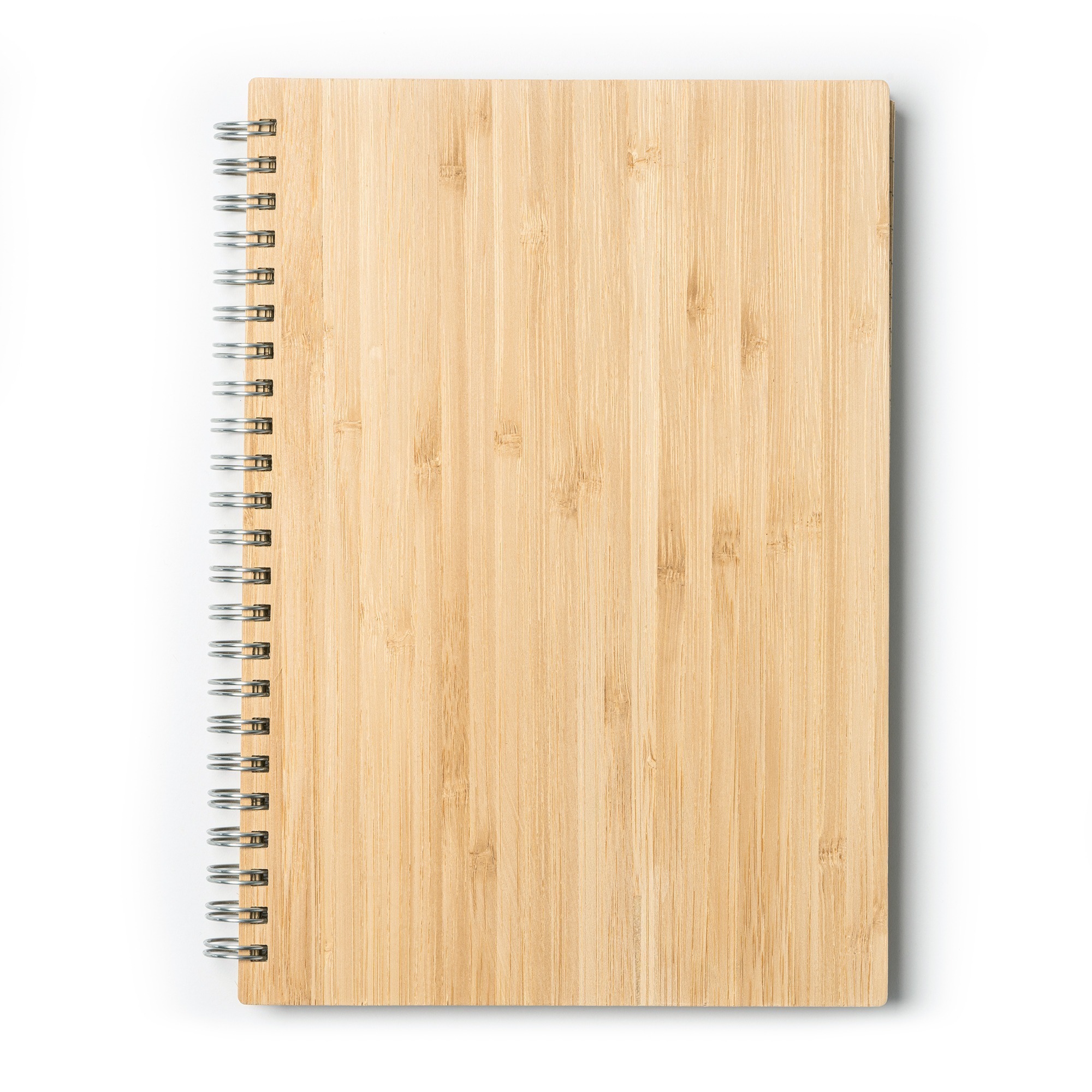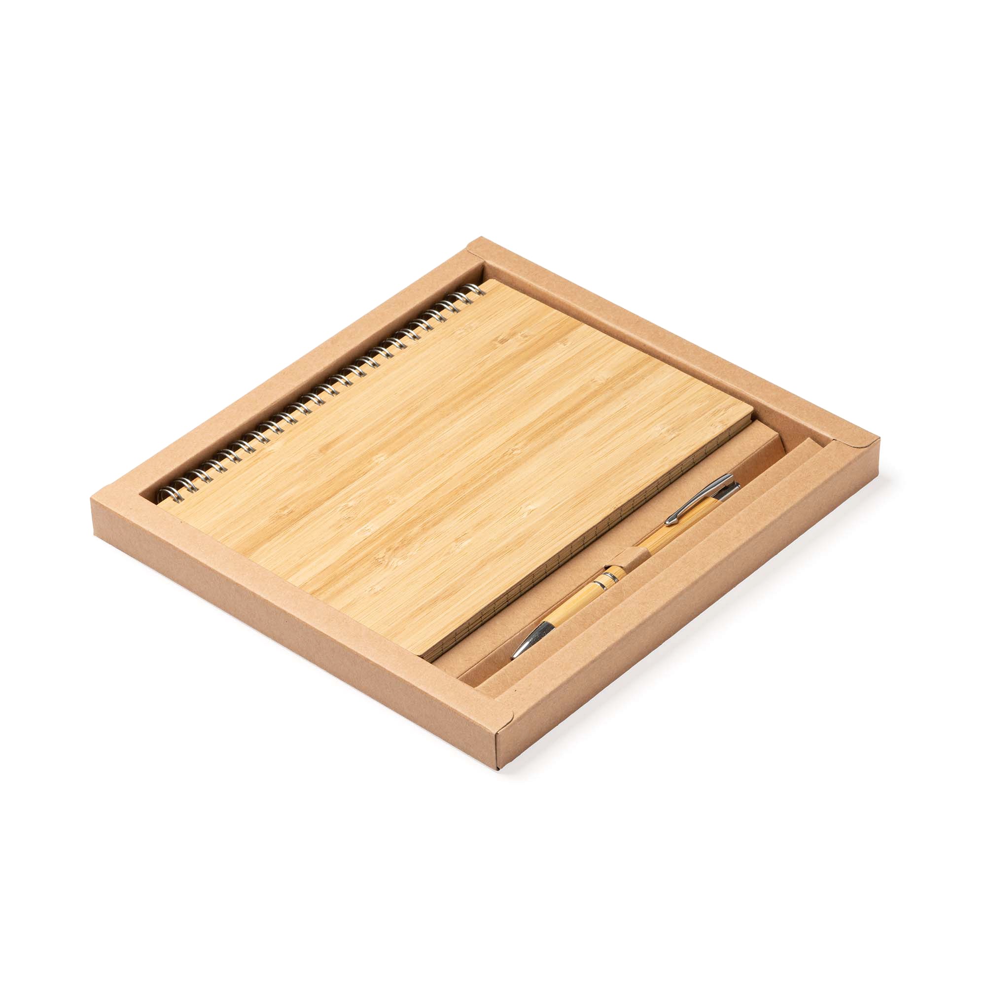 Set di penna e taccuino Bamboo A5. Taccuino con copertina rigida, 80 fogli di carta riciclata a una riga. Biros con dettagli cromati e inchiostro blu.