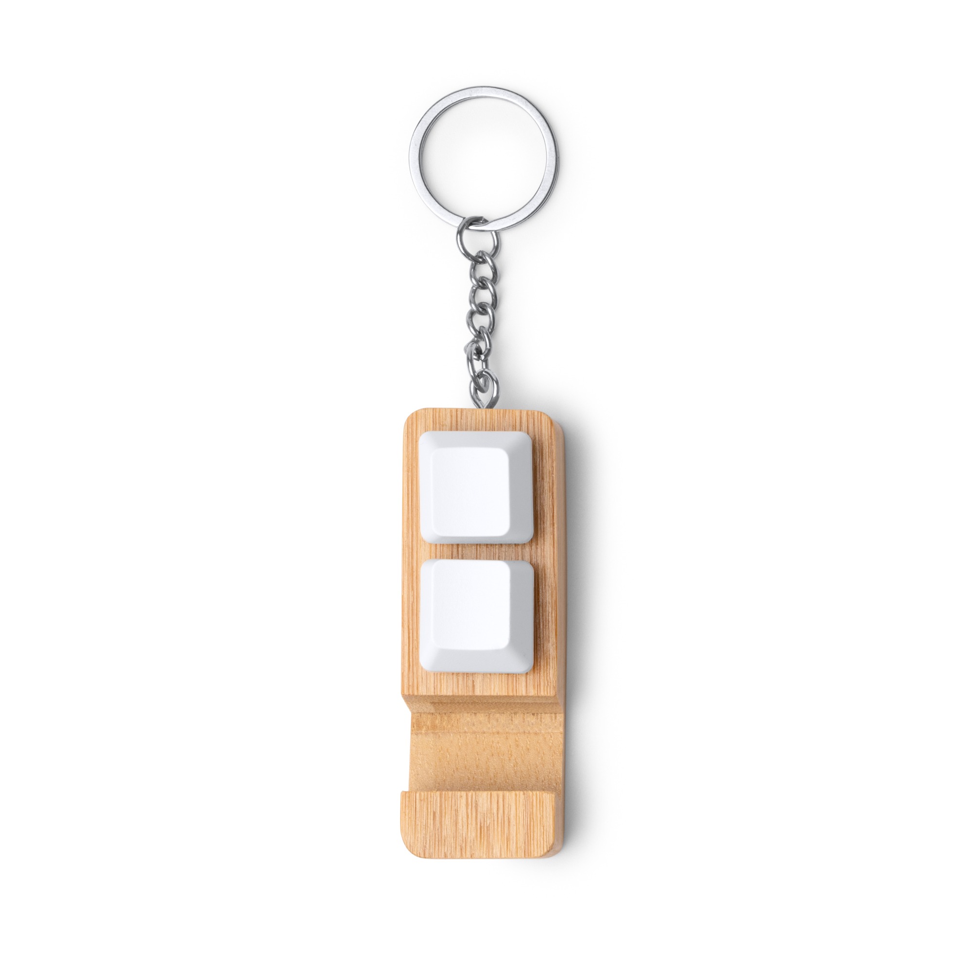 Portachiavi in bambรน con supporto per smartphone e funzione antistress. Il design presenta tasti bianchi che possono essere premuti e utilizzati come antistress.