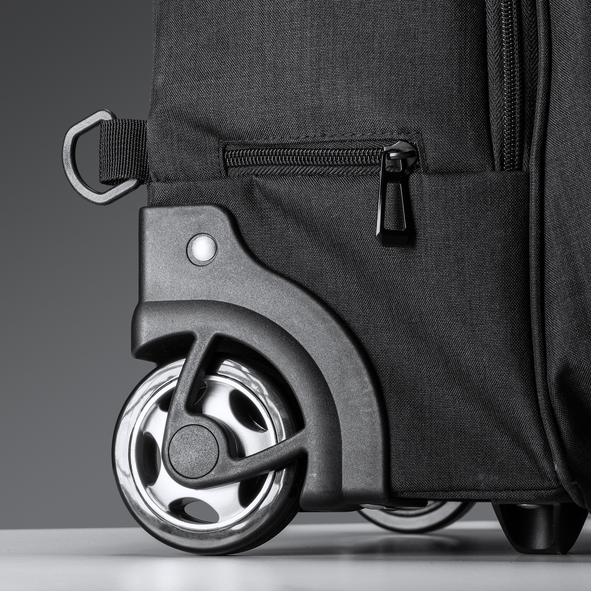 Zaino trolley con ruote realizzato in poliestere mรฉlange 300D. Tasca principale spaziosa con scomparto interno imbottito, ideale per computer portatili fino a 15”. Due tasche con scomparti interni e una tasca frontale. Struttura resistente e di alta qualitร . Spallacci imbottiti e regolabili. Copriruota resistenti alle macchie.