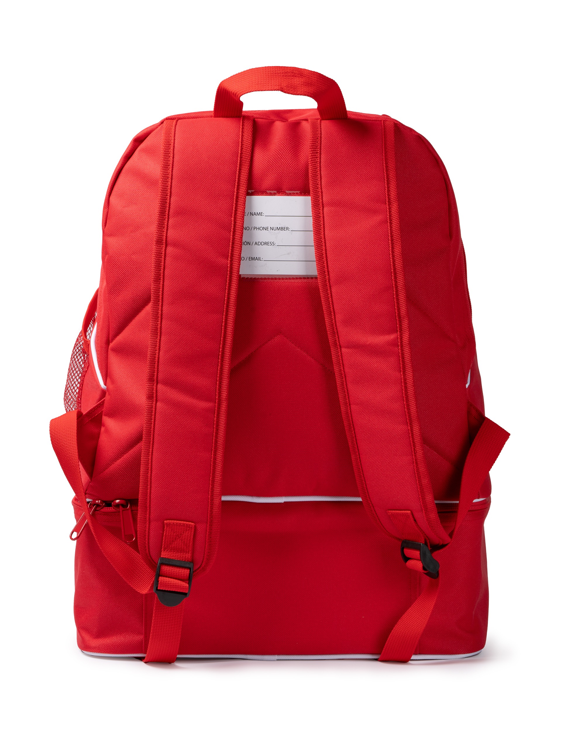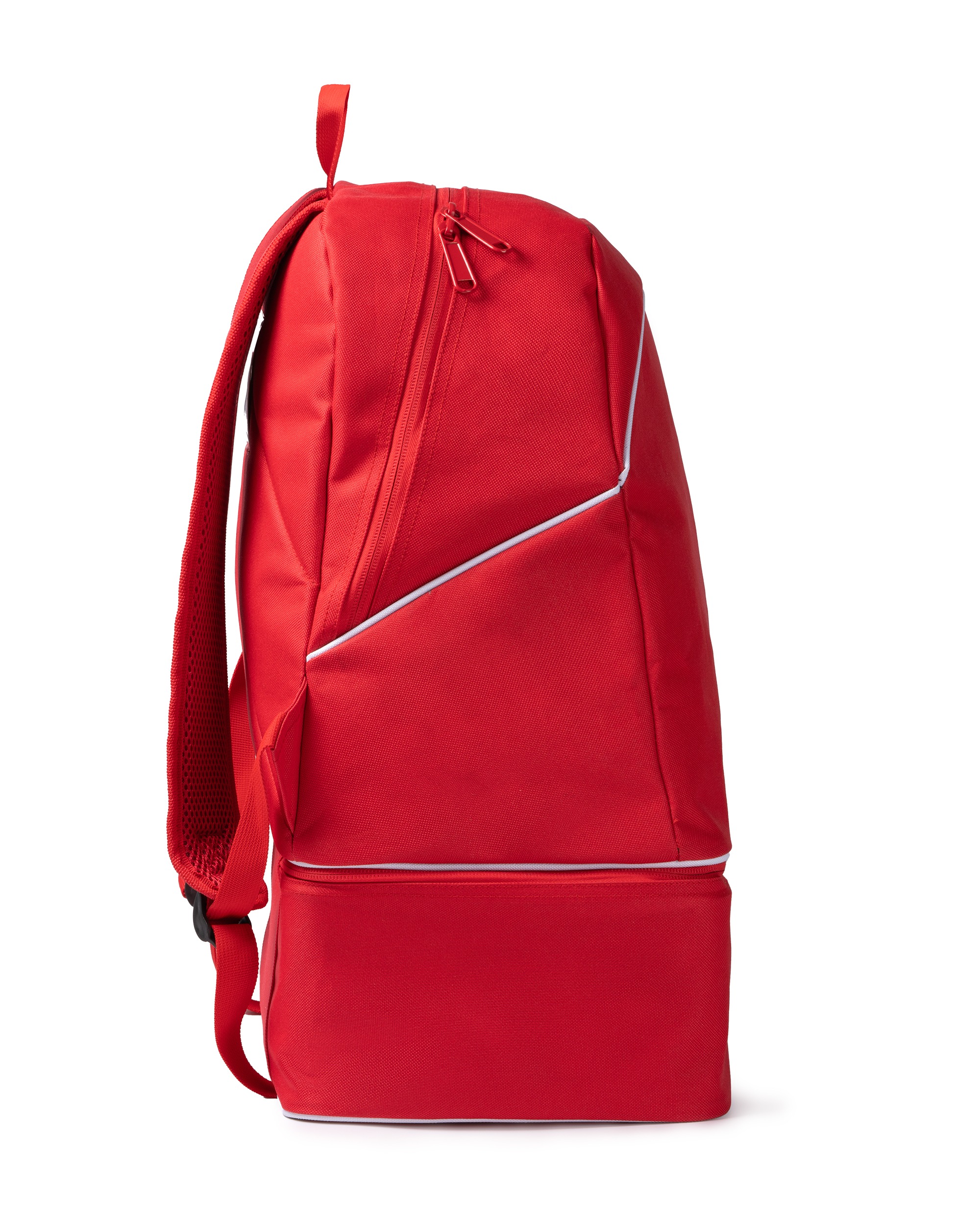 Zaino sportivo con scompartimento rigido per le scarpe. Scompartimento principale con zip e doppia maniglia. Tasca interna in tessuto foderato con chiusura a zip. Parte posteriore e cinghie imbottite. Porta carte di credito in plastica.
