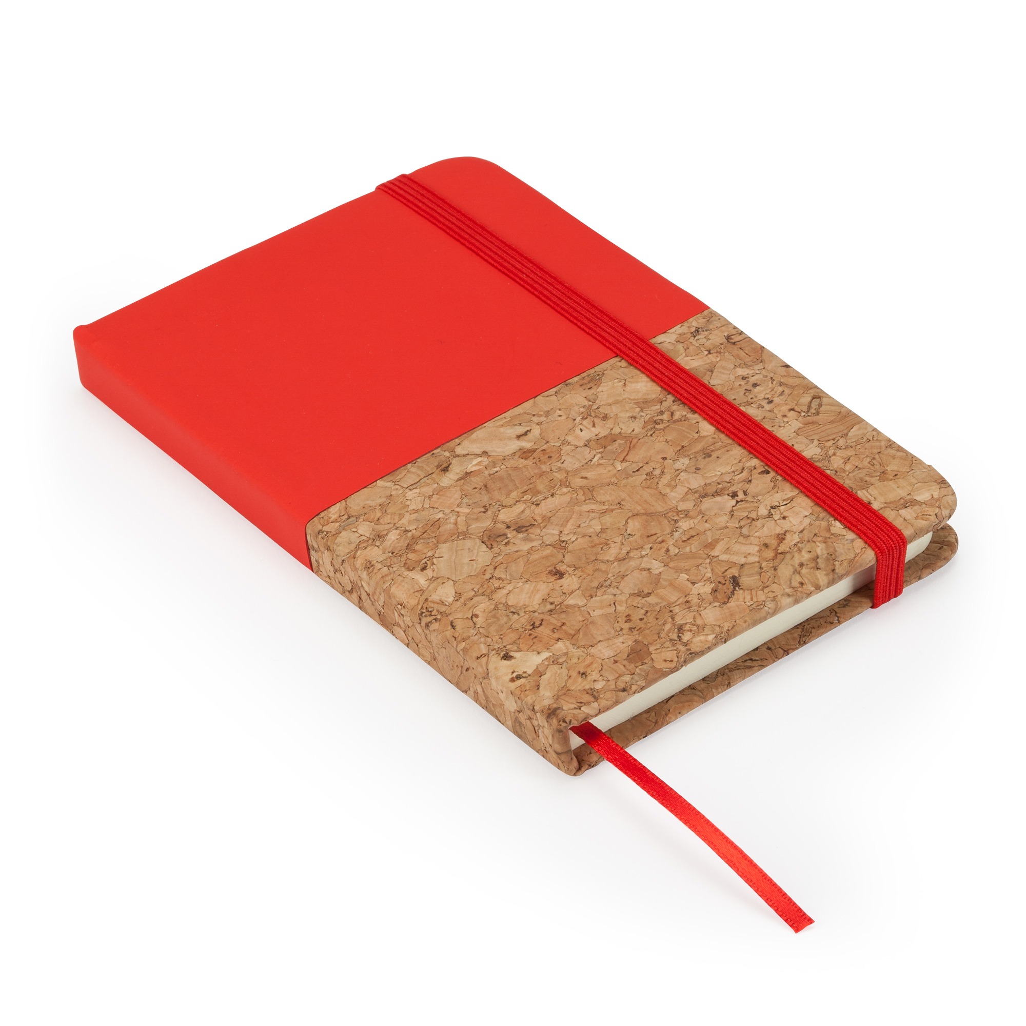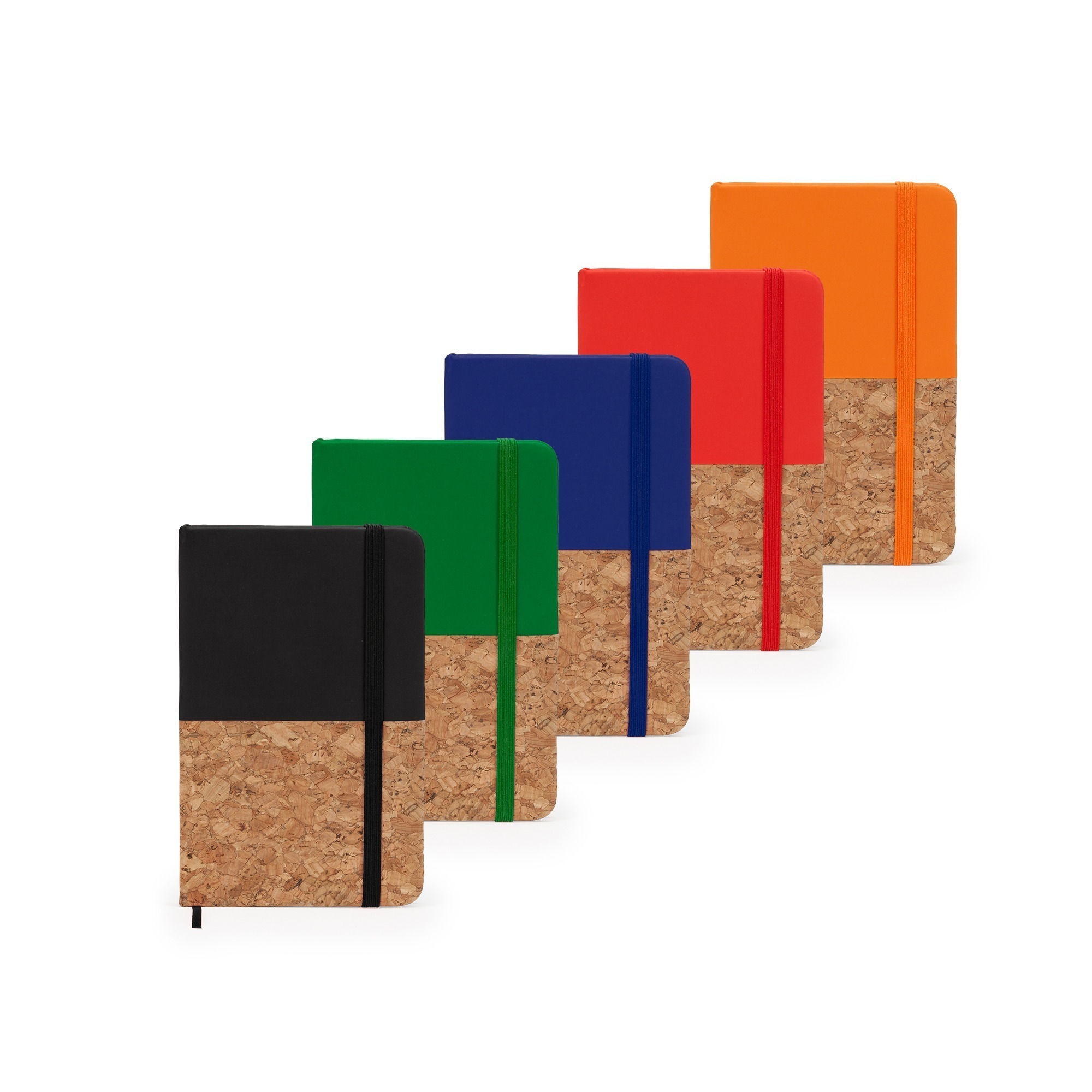Blocco note A6. Copertina rigida mista sughero / similpelle. Segnalibro ed elastico. 80 fogli.
