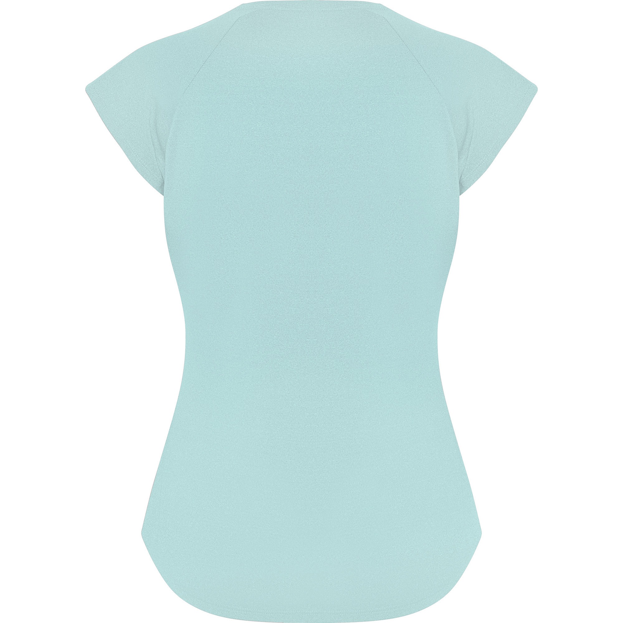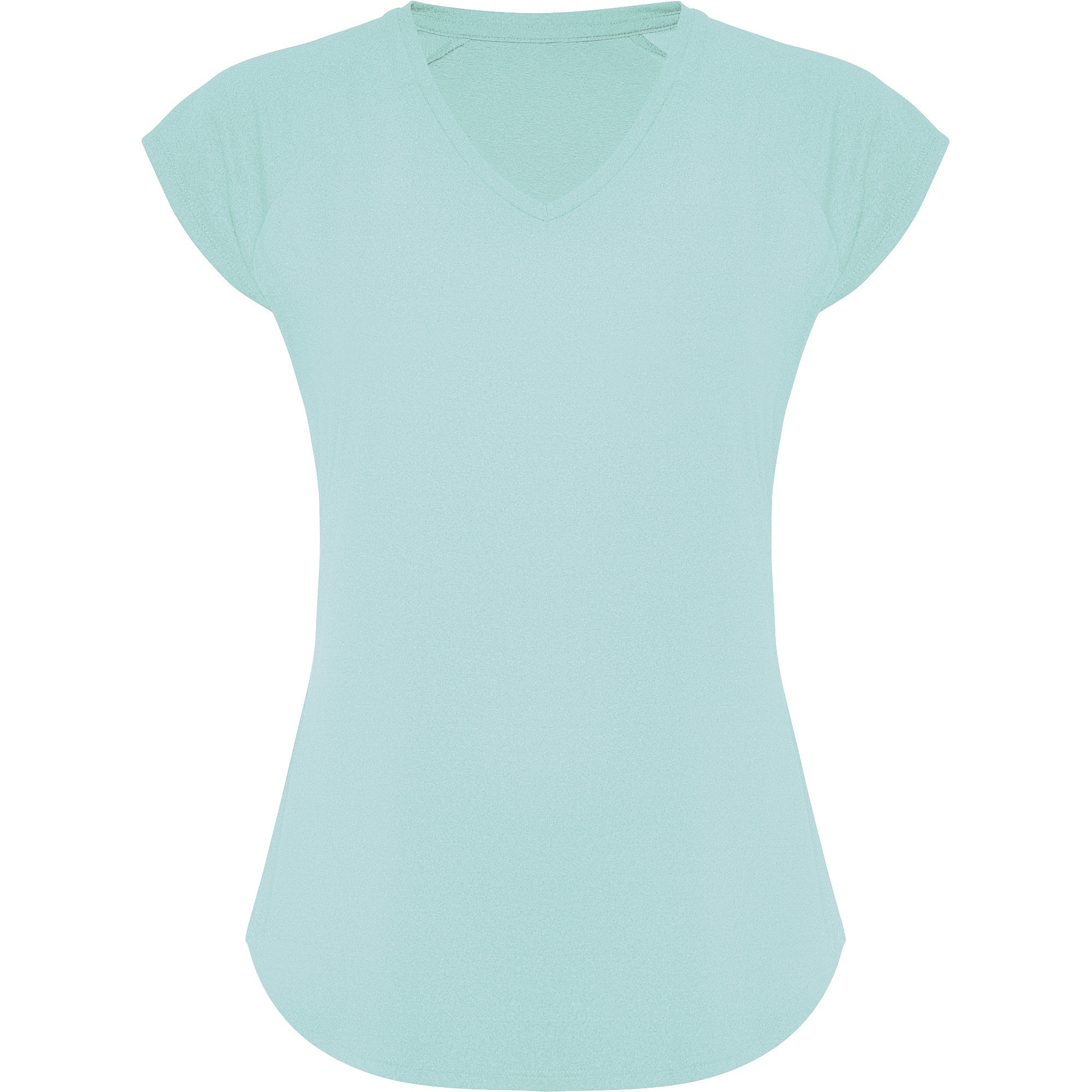 T-shirt tecnica multisport da donna con maniche raglan. Scollo a V. Tessuto in poliestere con tocco di cotone. Taglio aderente. Orlo curvo. Cuciture overlock tono su tono su orlo e maniche. Logo Roly riflettente sull’orlo laterale sinistro.