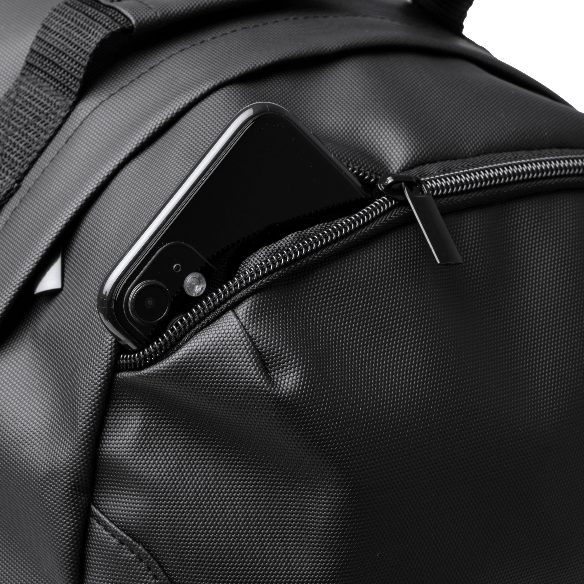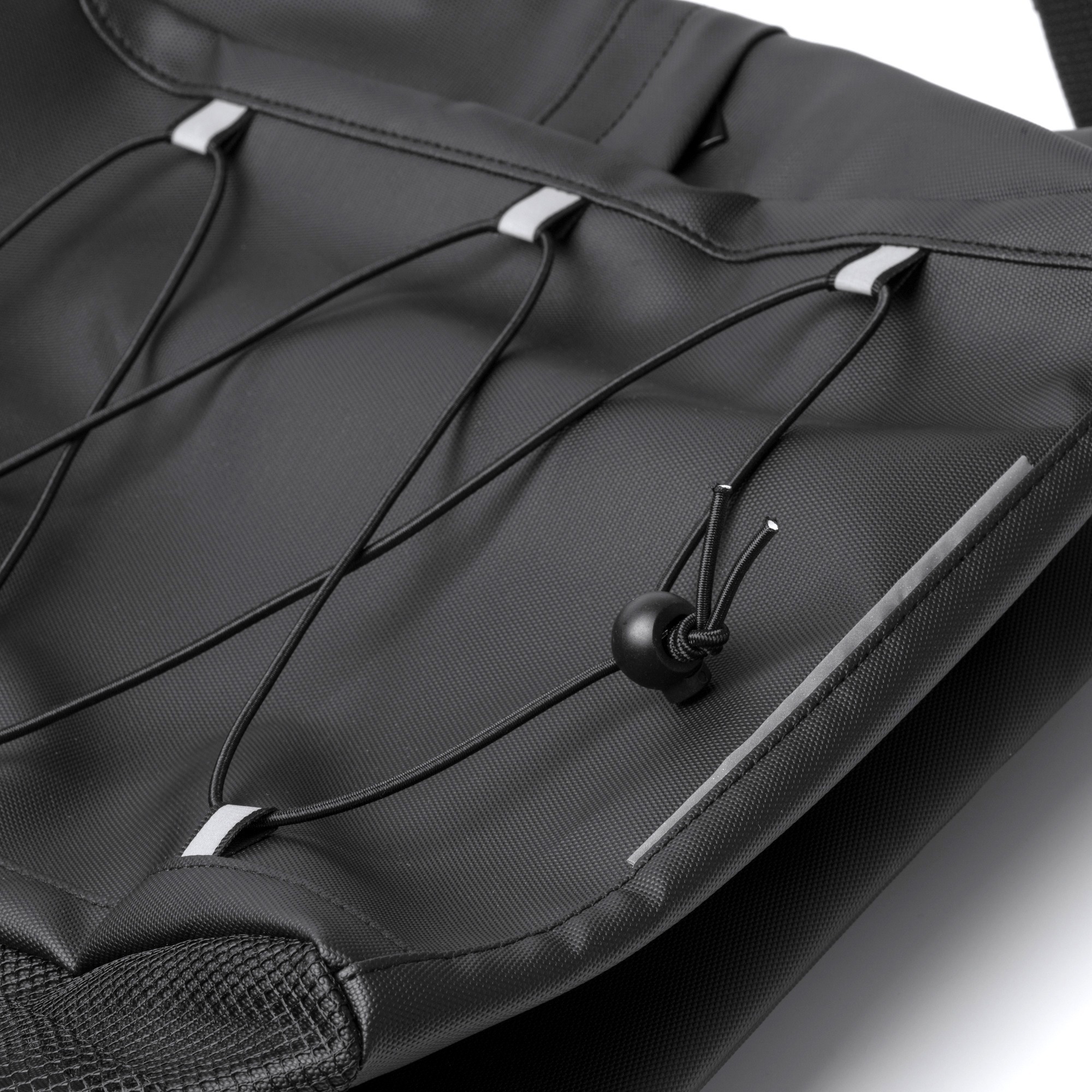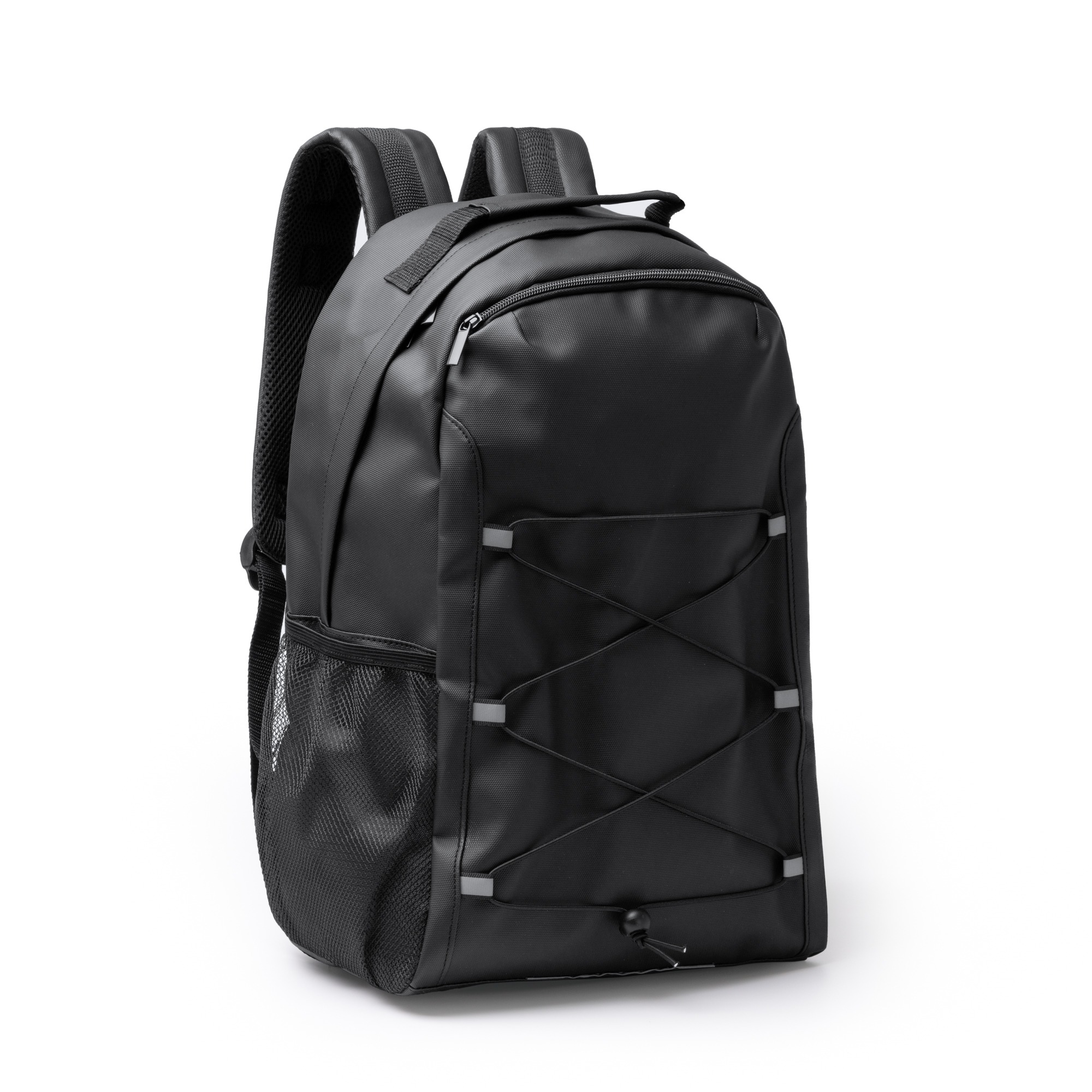Zaino realizzato in pelle PU con dettagli riflettenti. Scomparto principale di grandi dimensioni con tasca interna per laptop da 17″. Parte anteriore con cordoncini elastici e tasca laterale. Maniglie regolabili. Schienale e manici imbottiti. Misura: XL