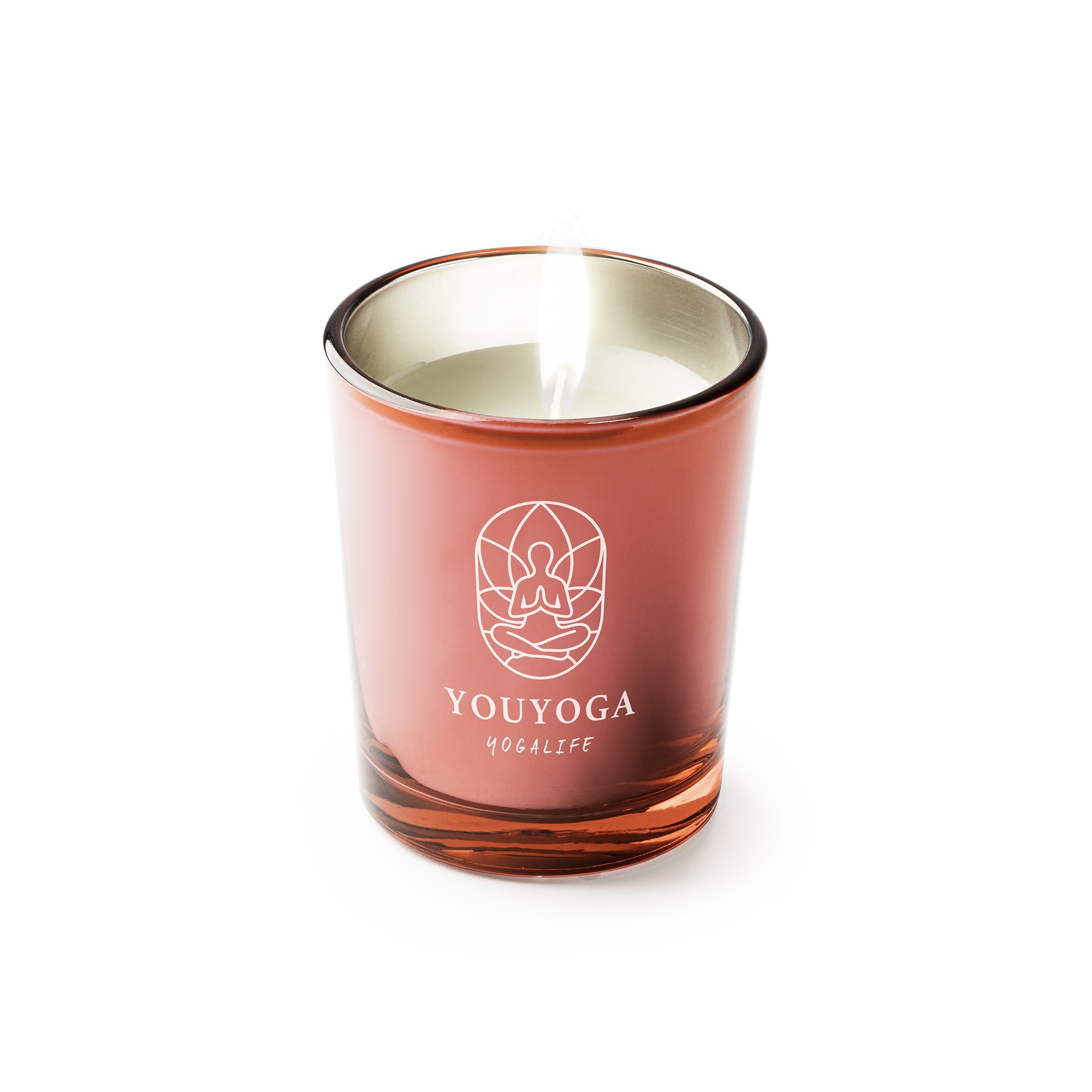 Candela profumata in vaso di vetro colorato con varie fragranze (caffรจ, pino, lavanda, vaniglia e fragola).