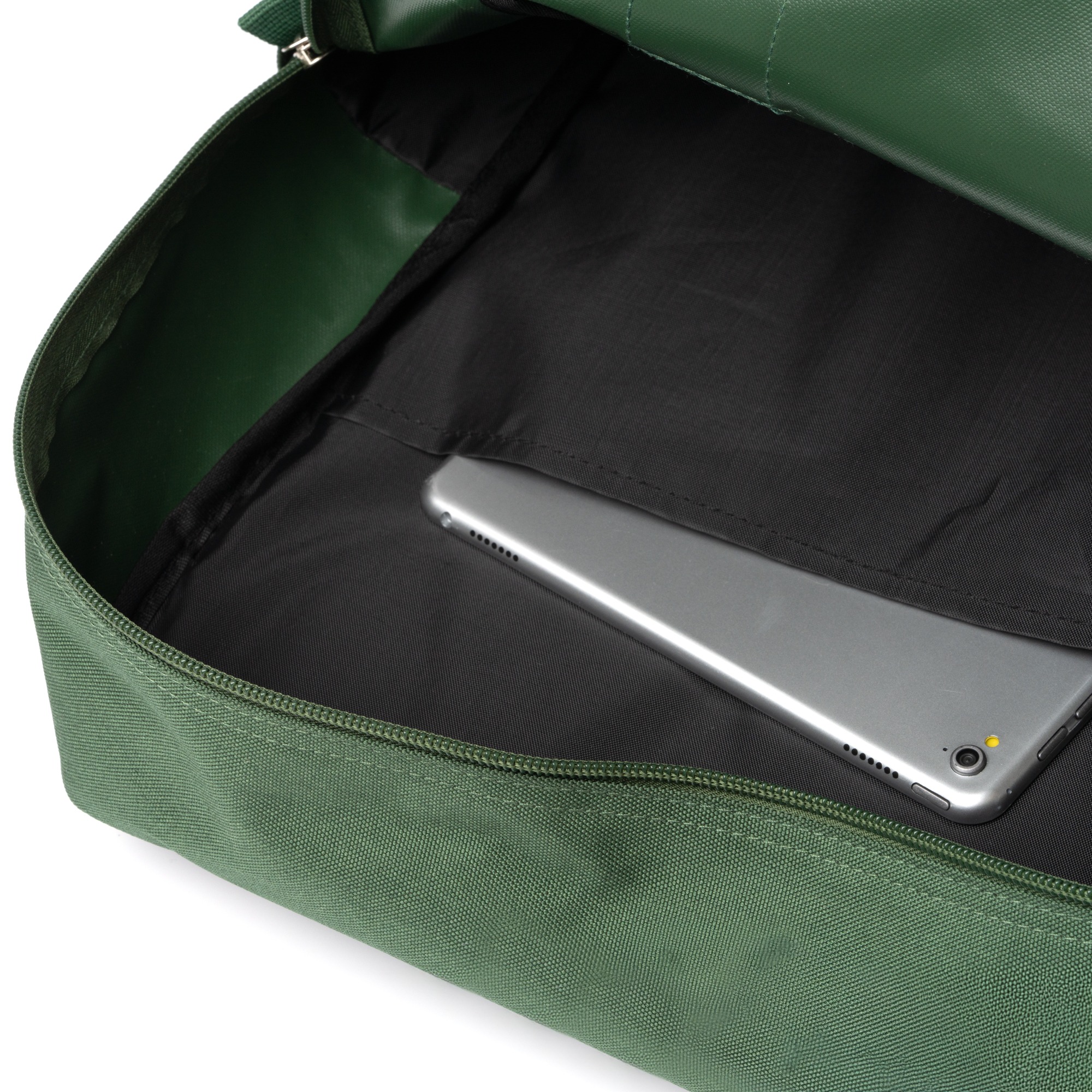 Zaino in poliestere riciclato 600D con scomparto principale. All’interno ha una tasca per trasportare laptop fino a 16″. L’esterno รจ dotato di uno scomparto anteriore con chiusura a cerniera, una doppia maniglia per il trasporto nella parte superiore e manici e schienale imbottiti.
