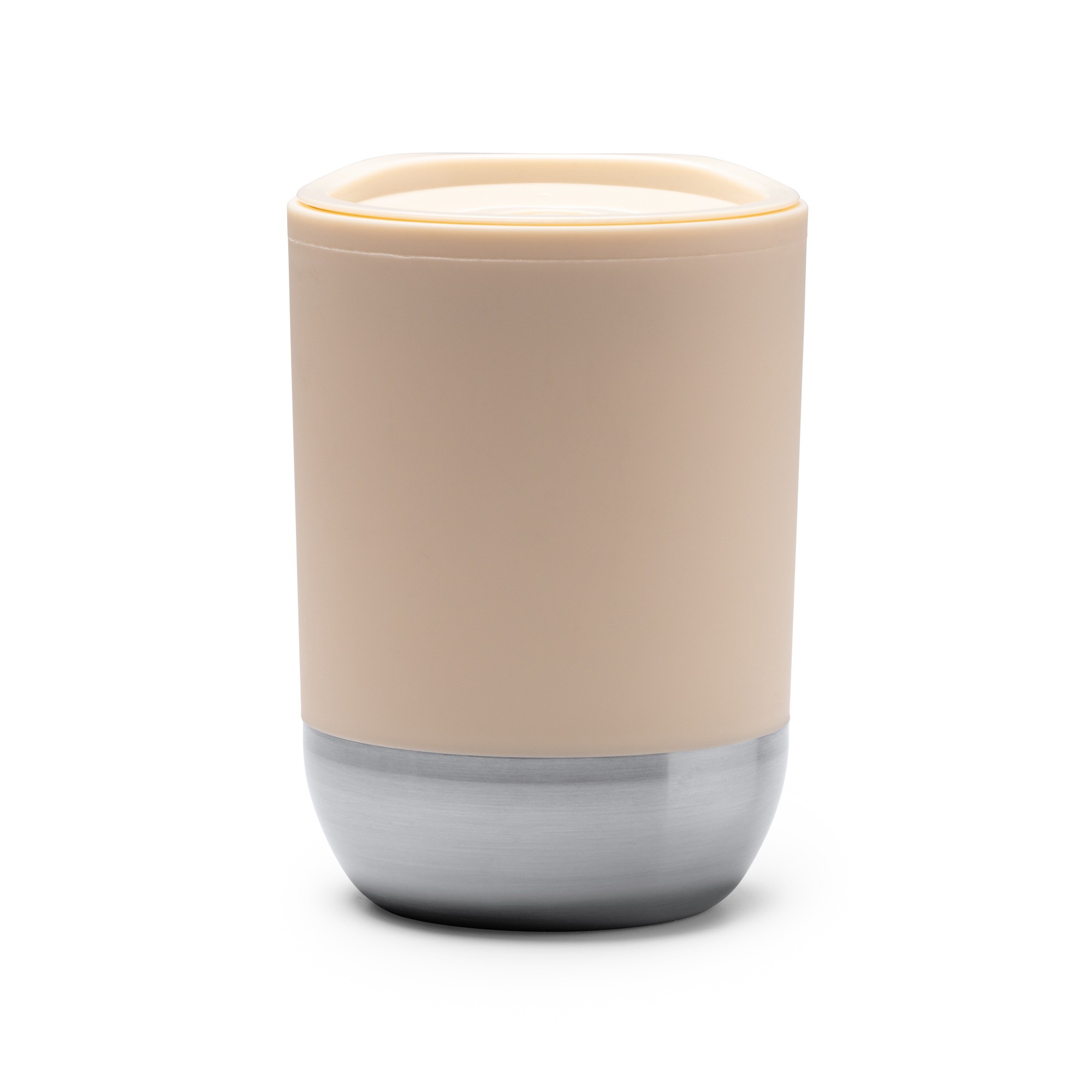Tazza a doppia parete con corpo in PP riciclato e base in acciaio inox 304. Include un coperchio di misurazione. Capacitร : 290 ml Confezione in design ecologico.