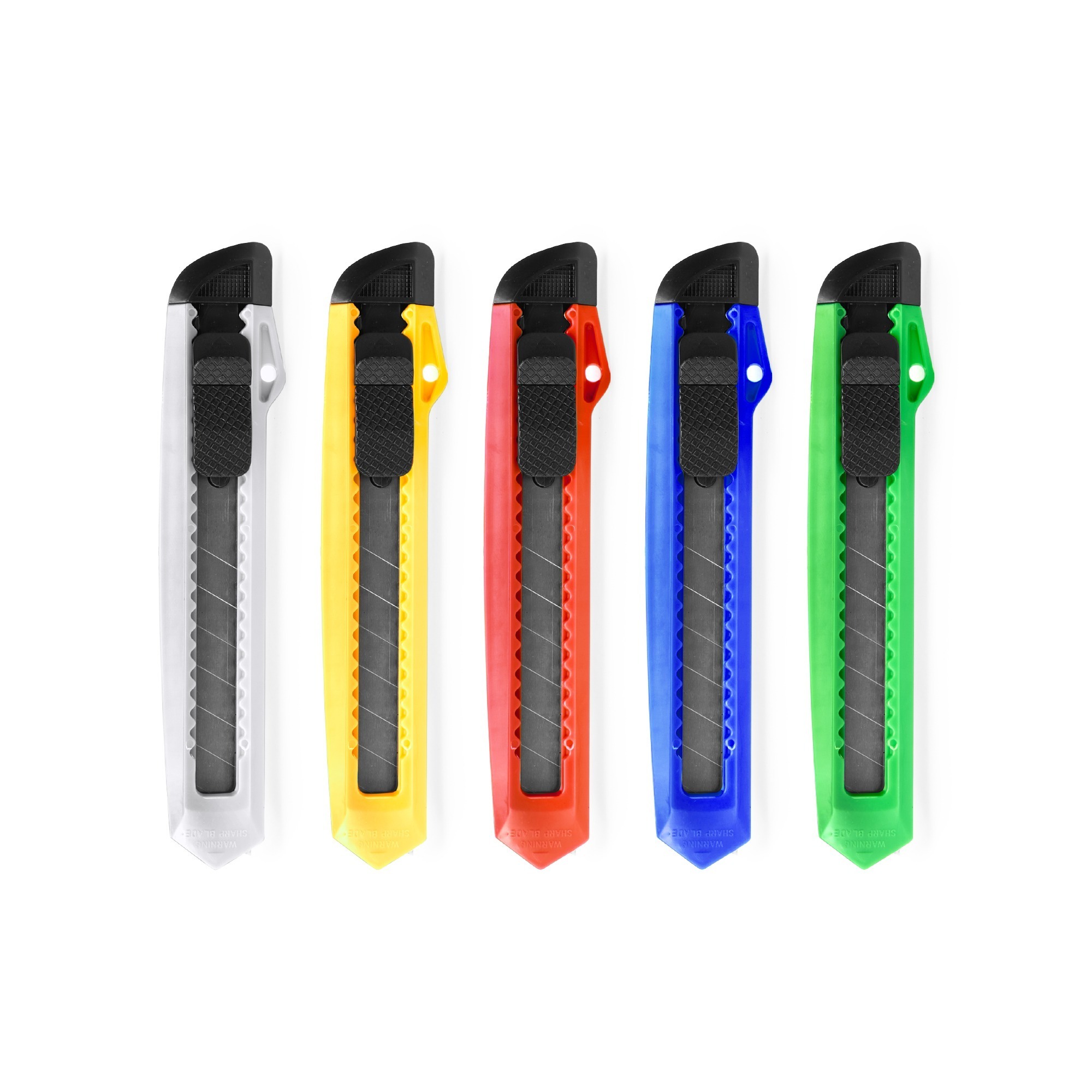 Taglierino a lama larga e corpo in ABS. Impugnatura ergonomica fustellata e cappuccio rimovibile per il taglio e la regolazione della lama.