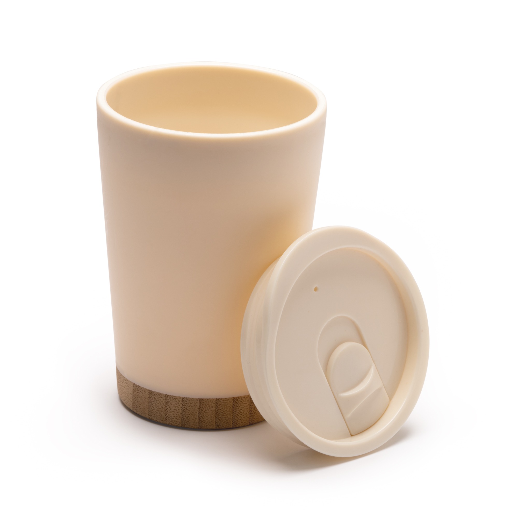 Tazza a doppia parete con corpo in PP riciclato e base in bambรน. Include un coperchio di misurazione. Capacitร : 290 ml. Confezione in scatola con design ecologico.