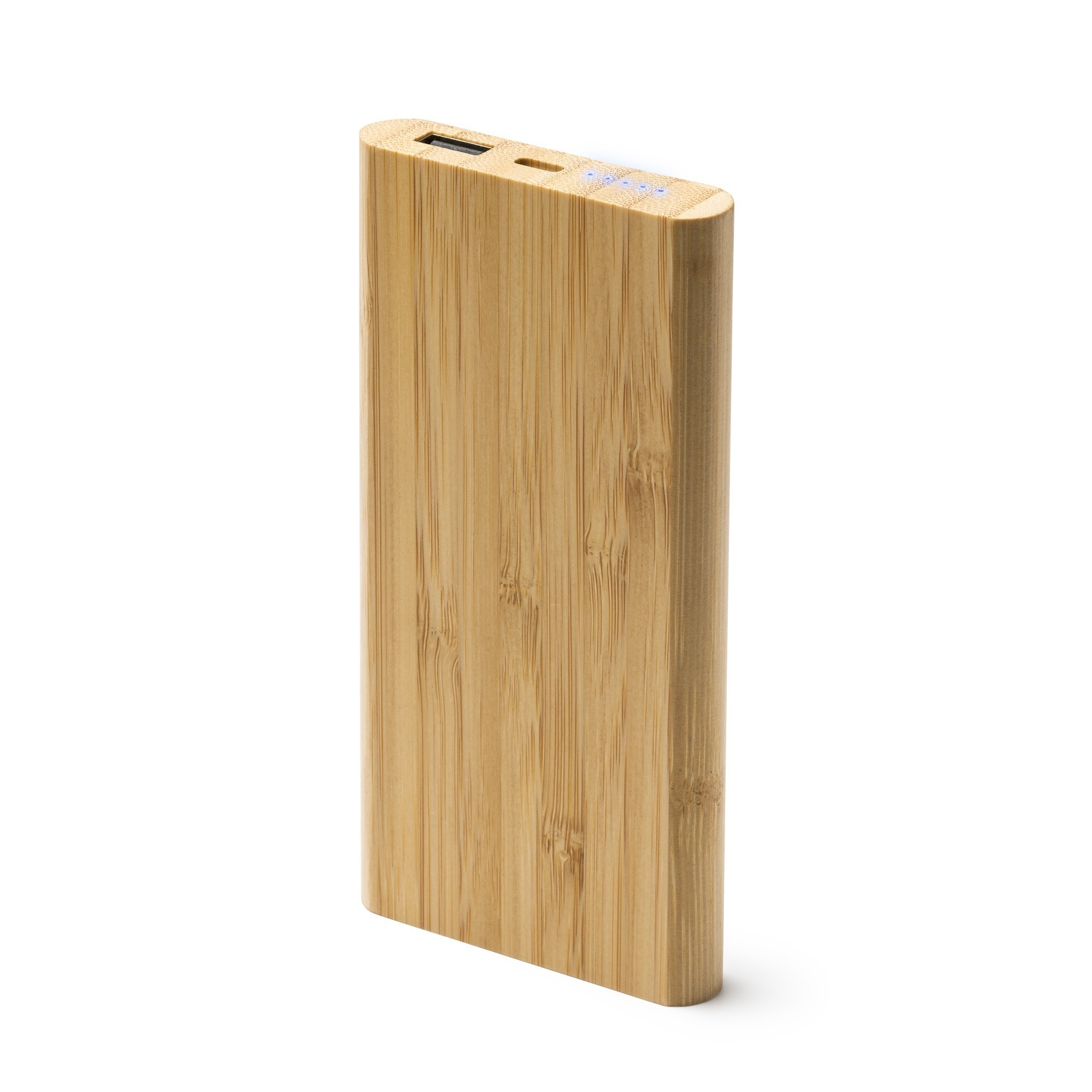 Batteria esterna da 6000 mAh con funzione di ricarica wireless, realizzata con involucro in bambรน. Uscita corrente DC5V/2,1A, wireless DC5V. Include cavo di tipo C.