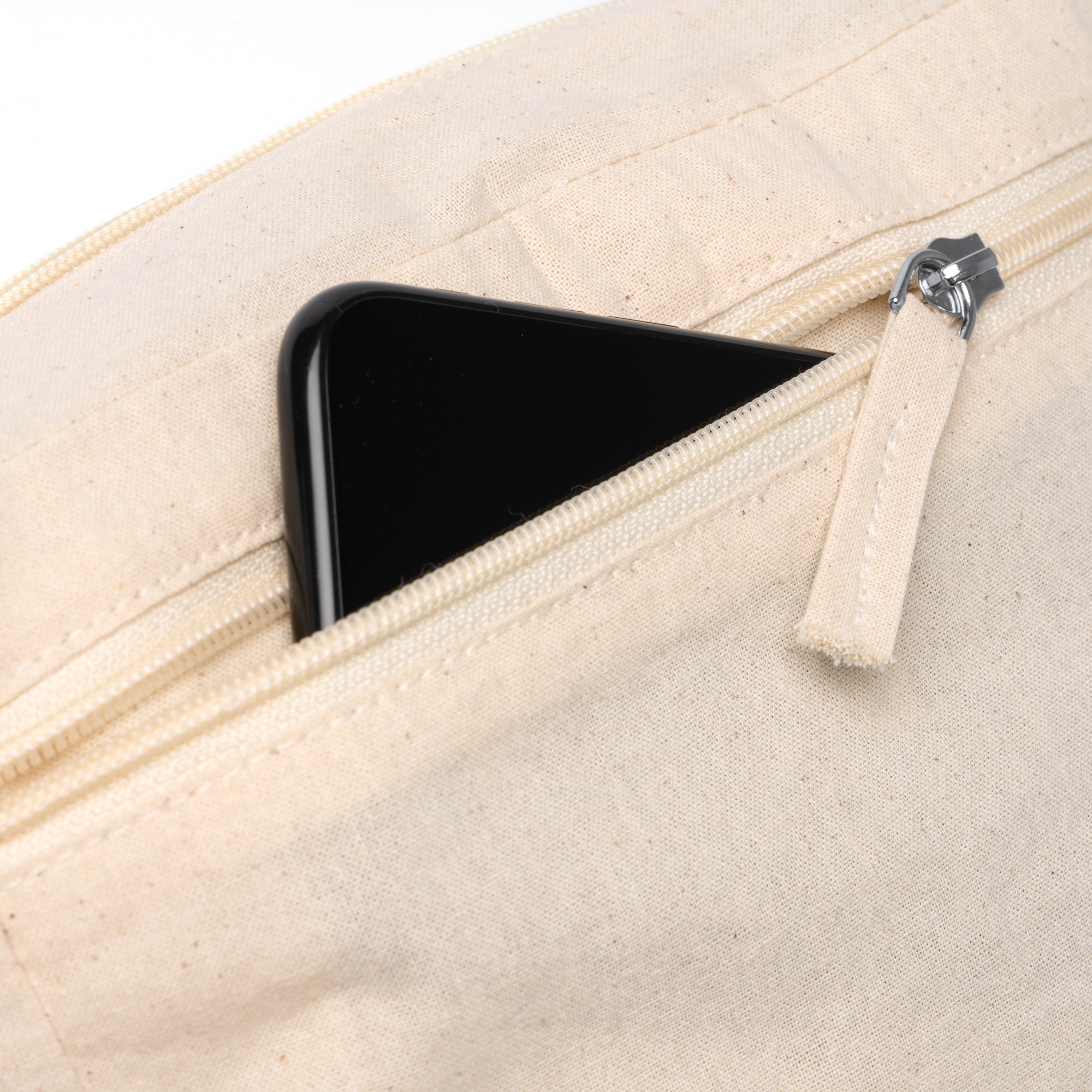 Necessaire 100% cotone 150 g/mยฒ con chiusura a zip. Doppia tasca, principale e laterale.