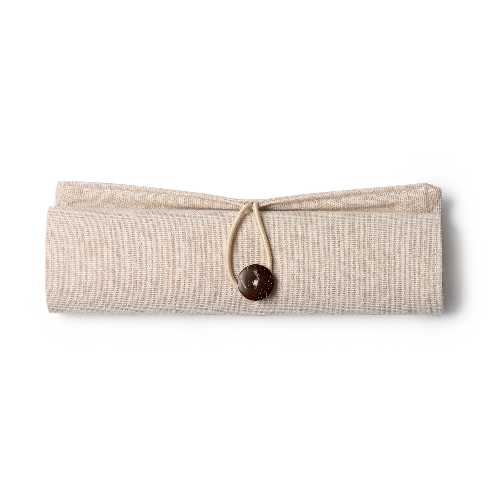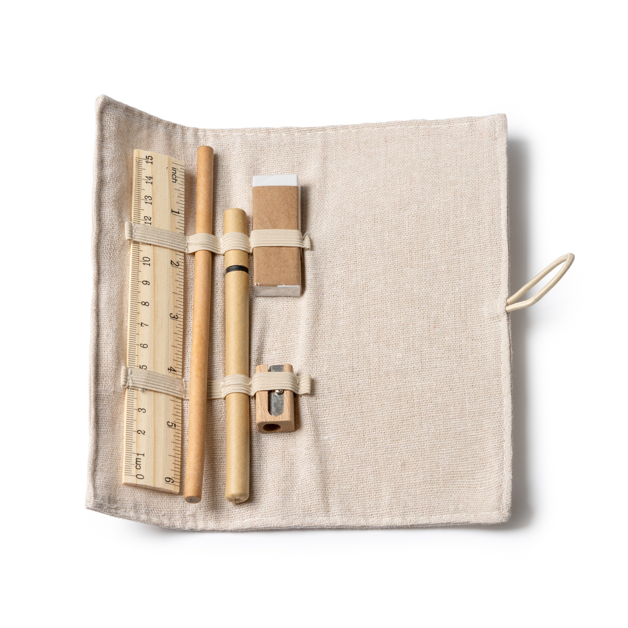 Set da scrittura con righello in bambรน, matita in carta, penna in cartone, temperamatite in legno e gomma. Confezione in juta e cotone.