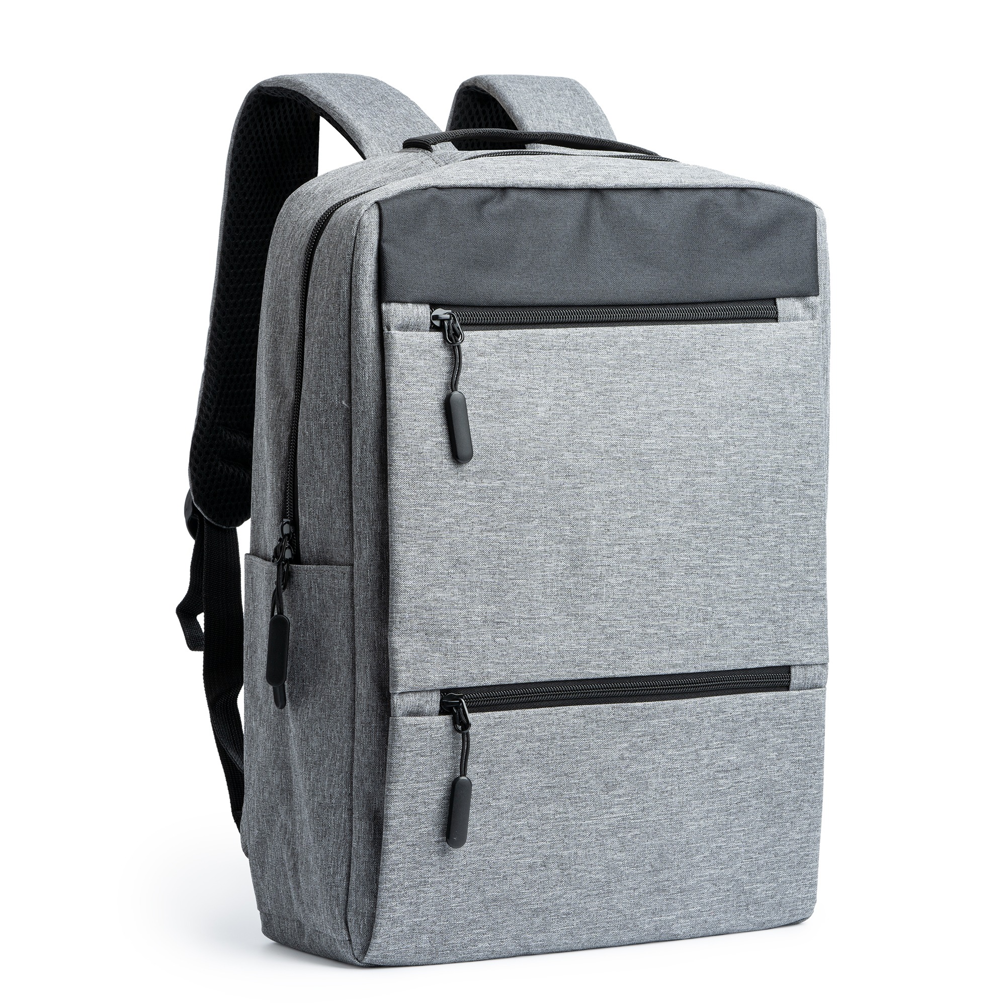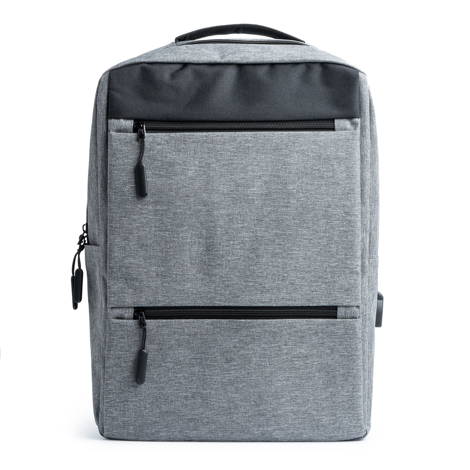 Zaino realizzato in poliestere 300D. Design innovativo con finitura OXFORD. Tasca principale imbottita, ideale per il computer portatile, e due tasche anteriori con eleganti linguette. Porta USB integrata per il collegamento di un alimentatore portatile (non incluso). Spallacci e schienale imbottiti.