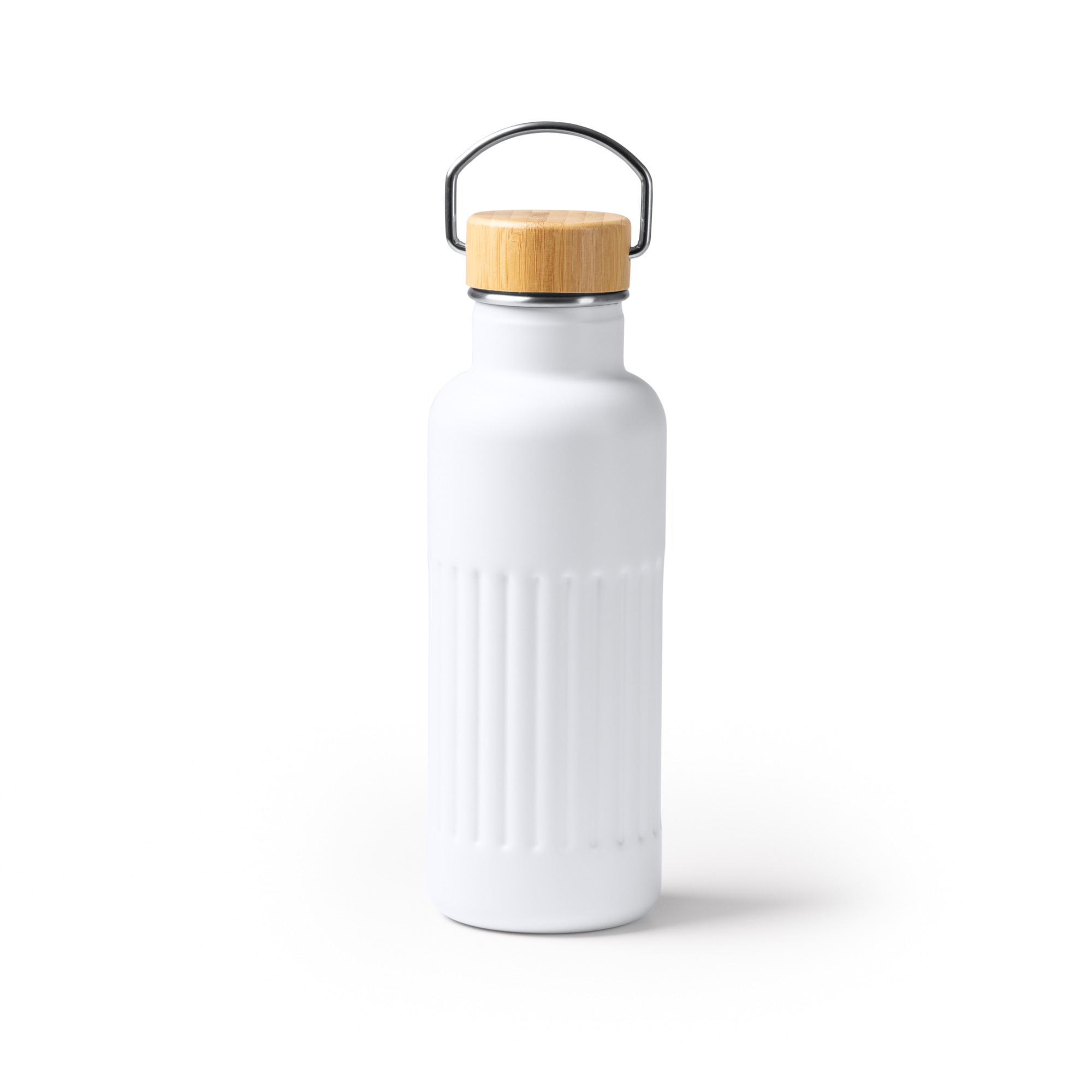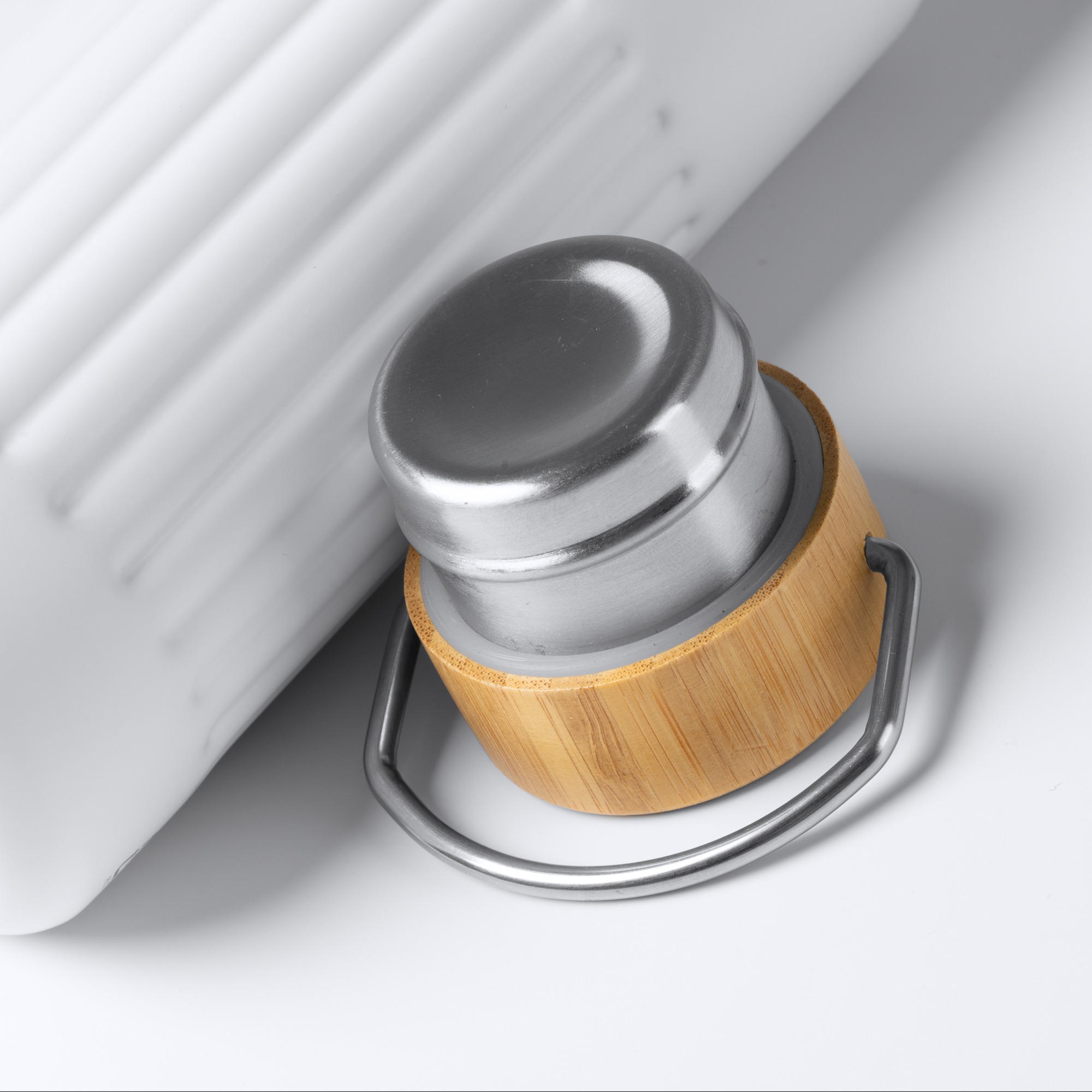 Bottiglia termica in acciaio inossidabile 304 riciclato con design smussato a doppia parete e coperchio in bambรน. Capacitร : 500 ml. Confezione in scatola con design ecologico.