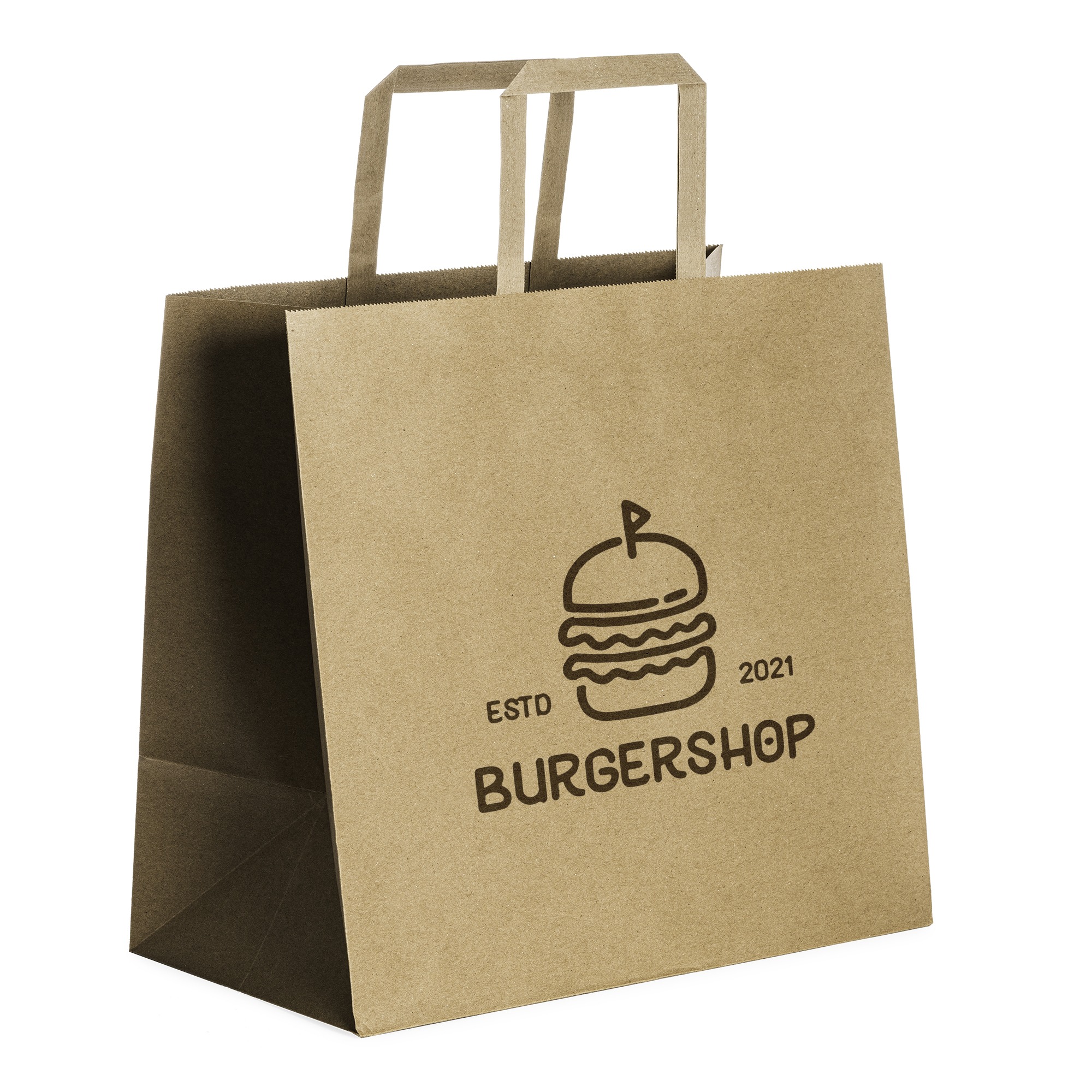 Shopper di carta da 80 g/mยฒ in finitura naturale. Manici corti piatti rinforzati. Ideale per hotel e ristoranti (take away).