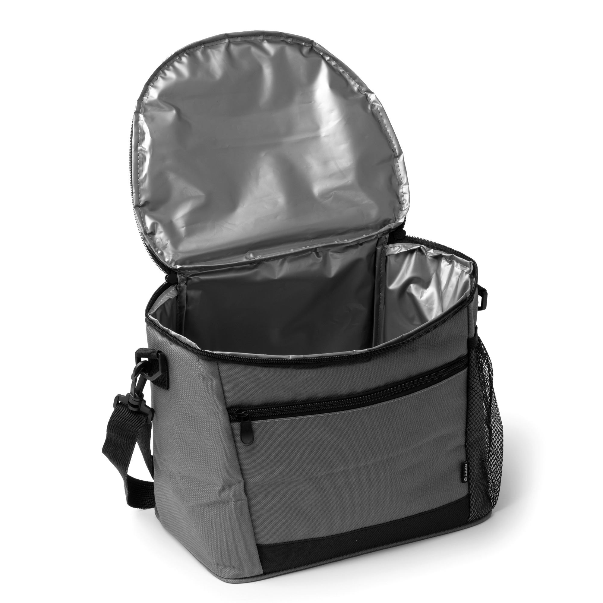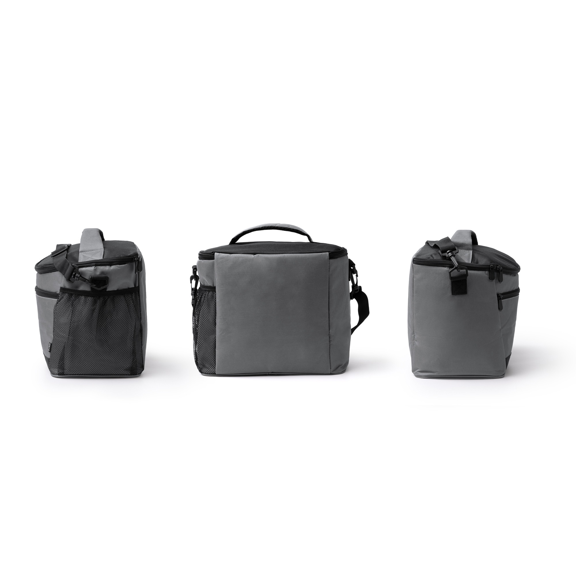 Borsa grande in materiale isolante in RPET 600D. Tasca frontale e tasca laterale con chiusura a zip. Interno isotermico. Tracolla regolabile.