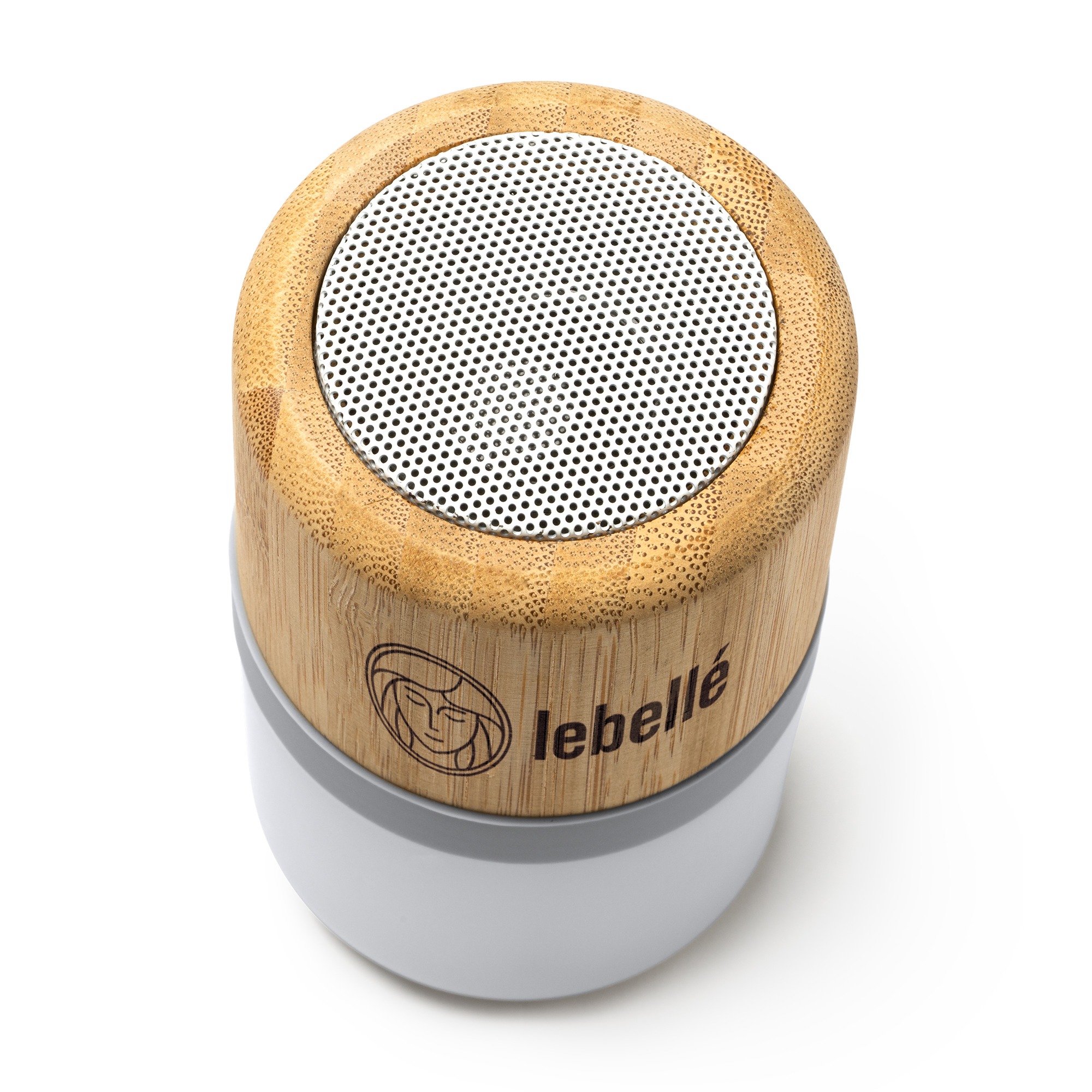 Fantastica cassa wireless con corpo in bambรน e luce LED multicolore con 4 modalitร . 3W di potenza e batteria ricaricabile. Cavo di ricarica incluso.