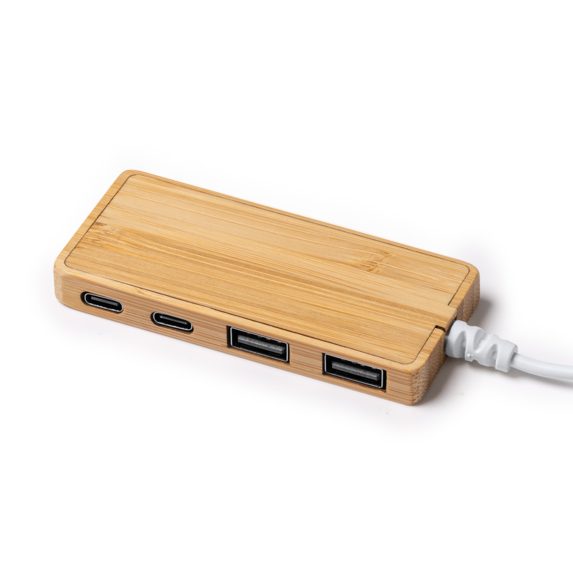 Porta hub USB in bambรน. Connessione di ingresso di tipo C. Due porte di uscita USB e due di tipo C. Confezione in scatola di design ecologico.