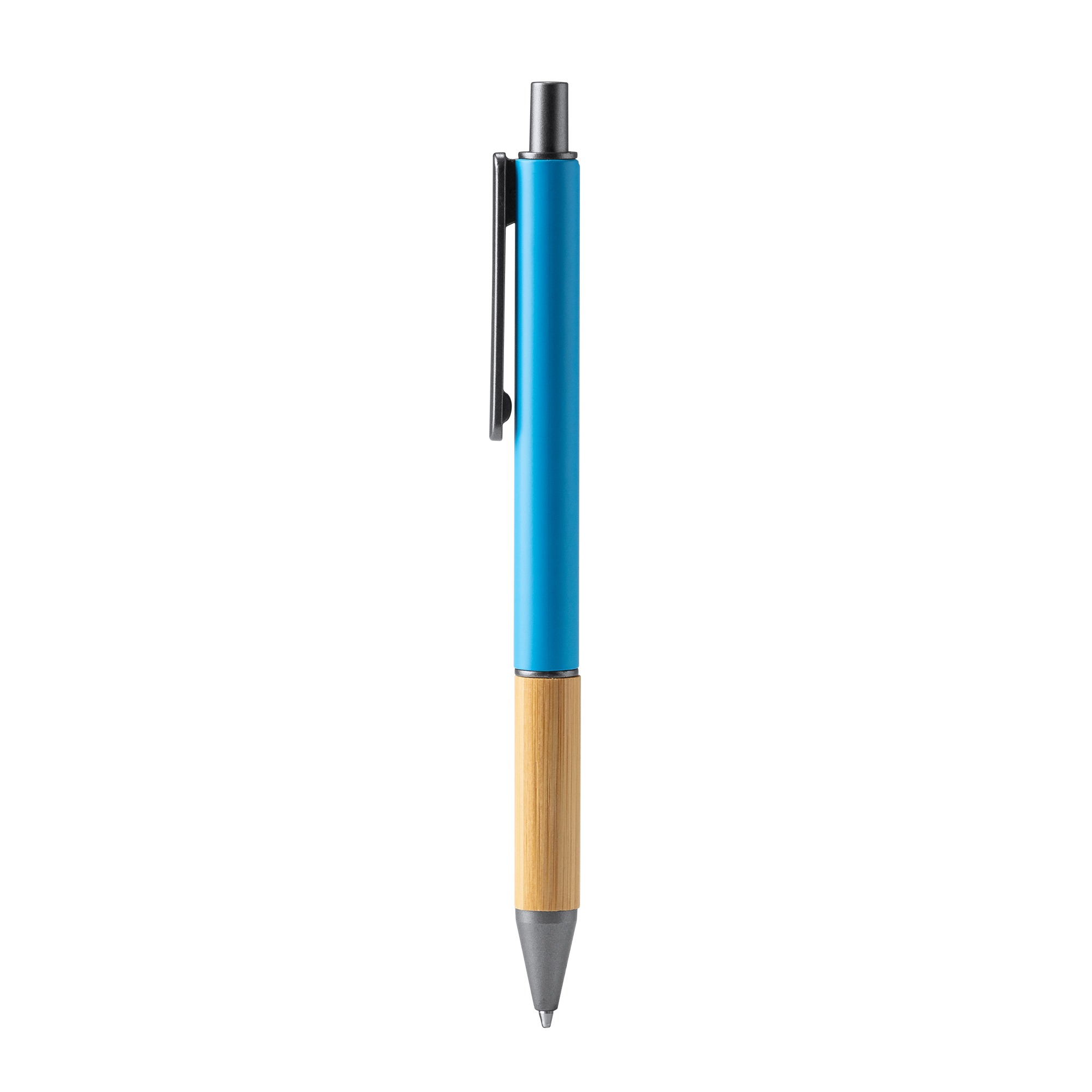 Penna a sfera con finitura opaca, impugnatura in bambรน e dettagli in colore scuro. Inchiostro blu.