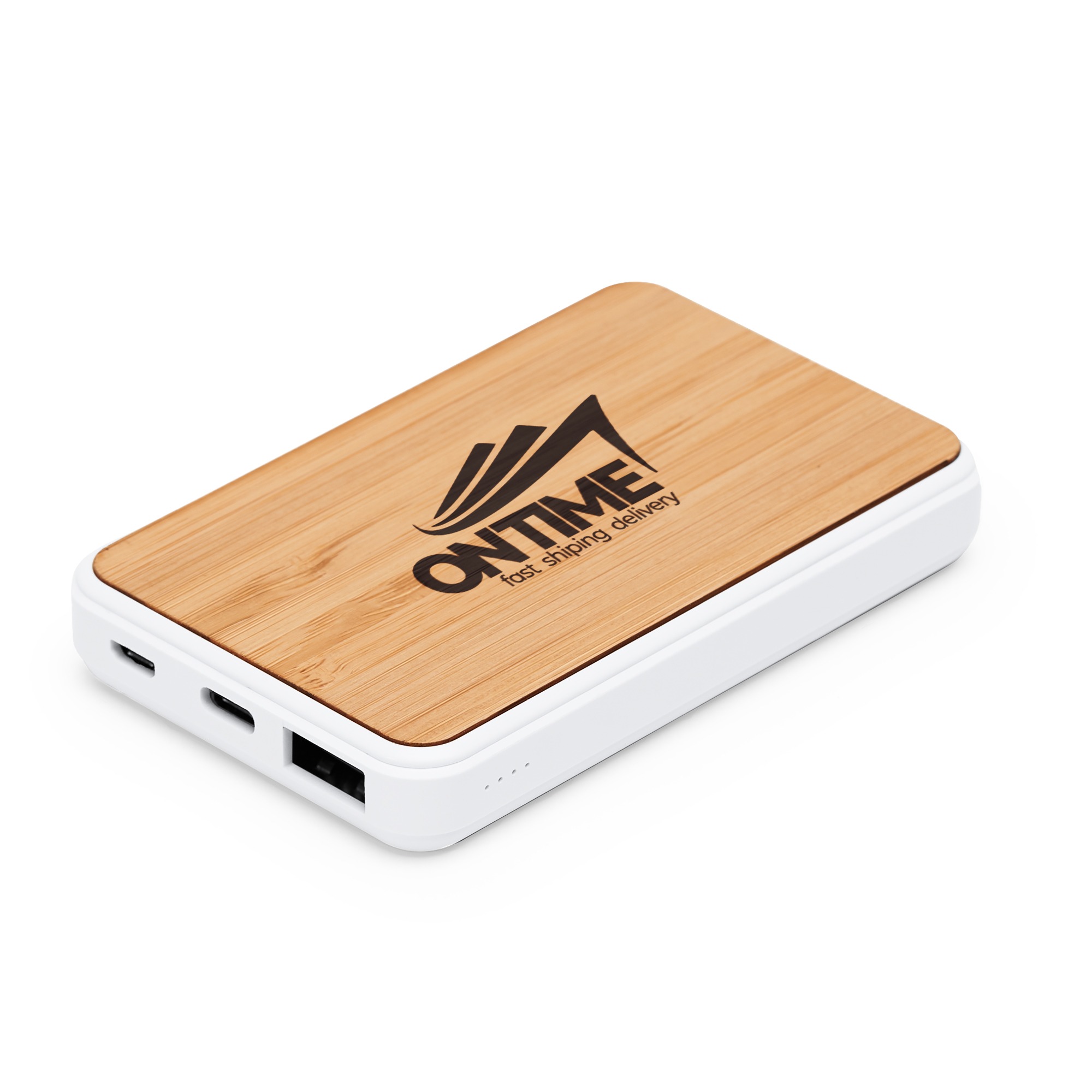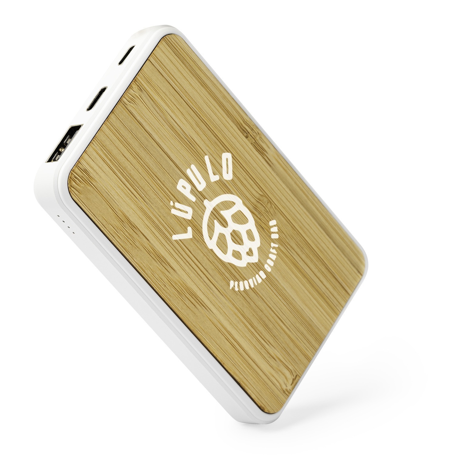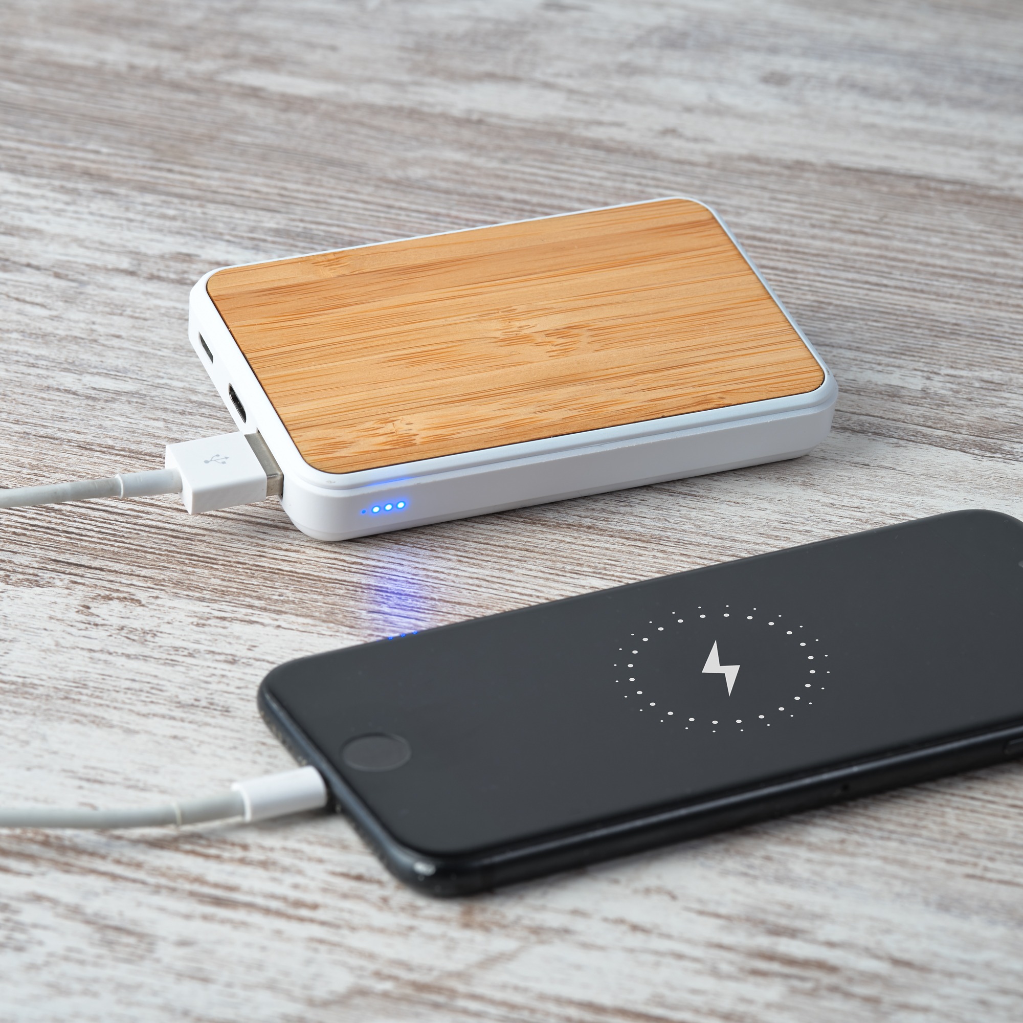 Batteria esterna da 5000 mAh, con corpo rettangolare in ABS bianco e superficie in bambรน. Uscita di corrente USB DC5V/2.1A. Include cavo micro USB.