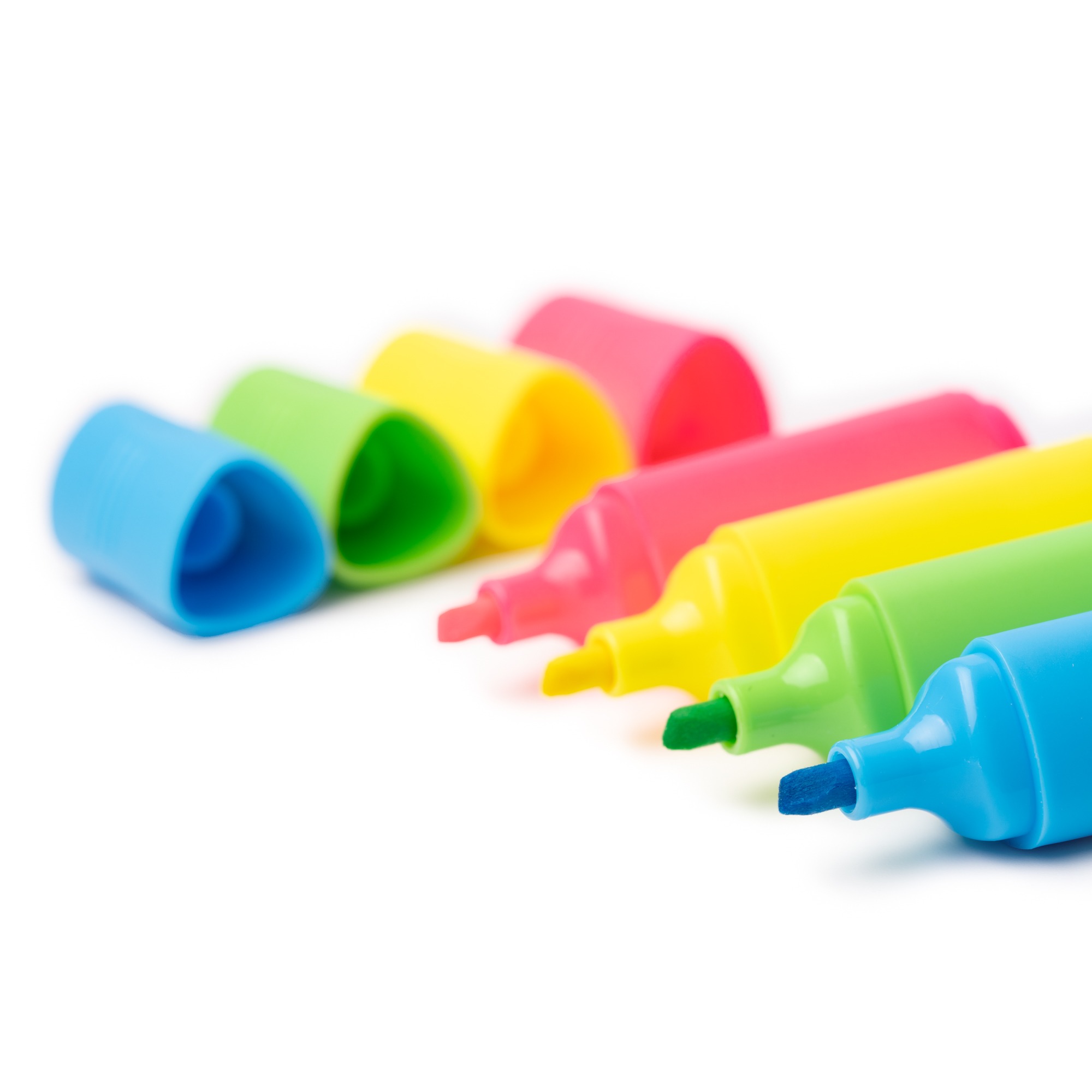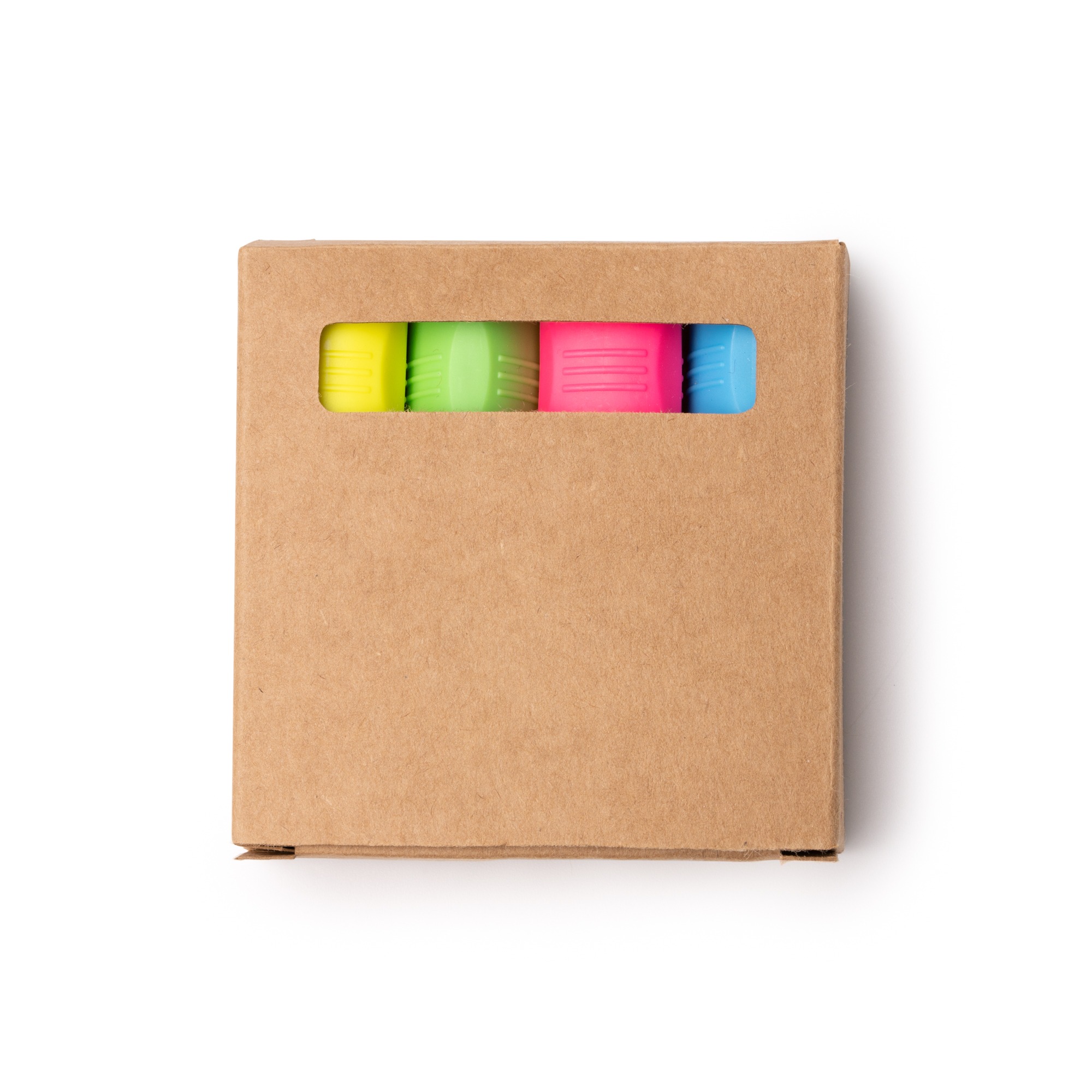 Set di evidenziatori triangolari in quattro colori: verde, giallo, rosa e blu.