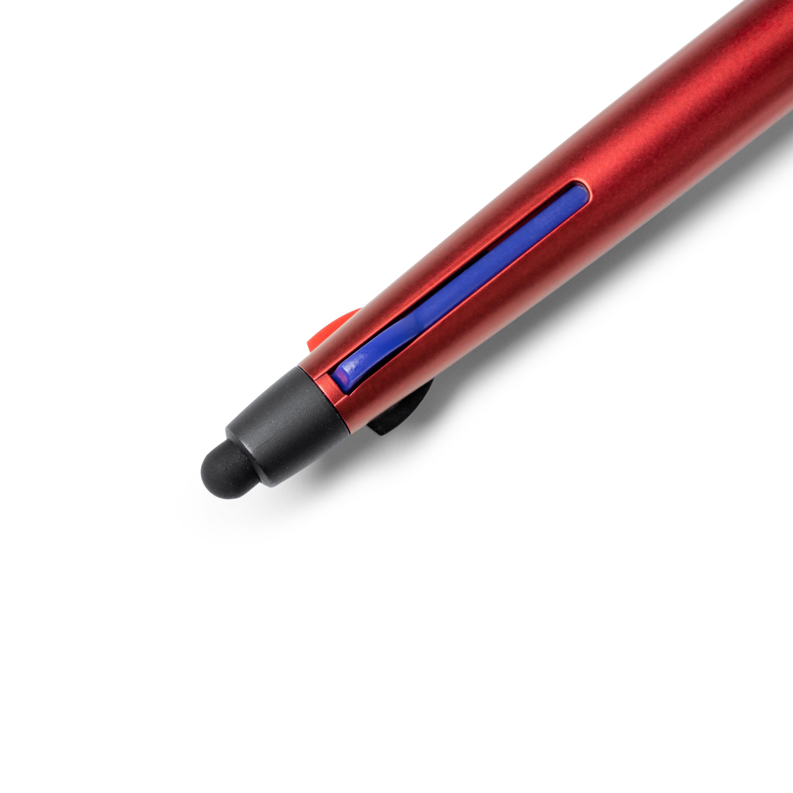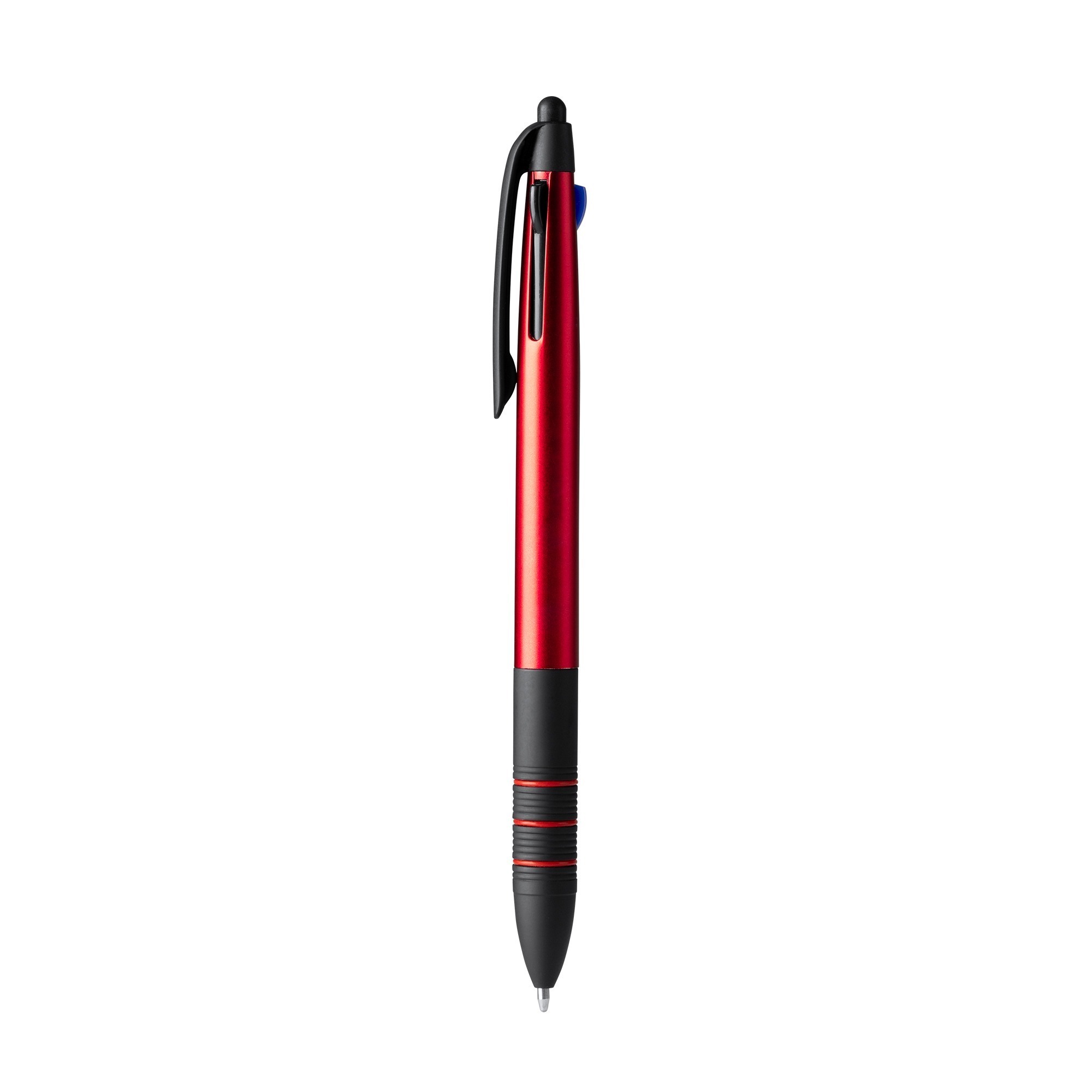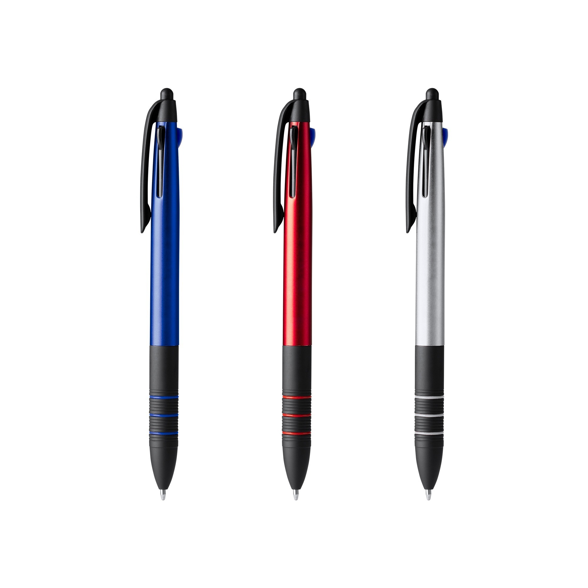 Penna a sfera retrattile a 3 inchiostri. Corpo in ABS con dettagli in nero e impugnatura morbida. Pennino touchscreen. Inchiostro blu, nero e rosso.