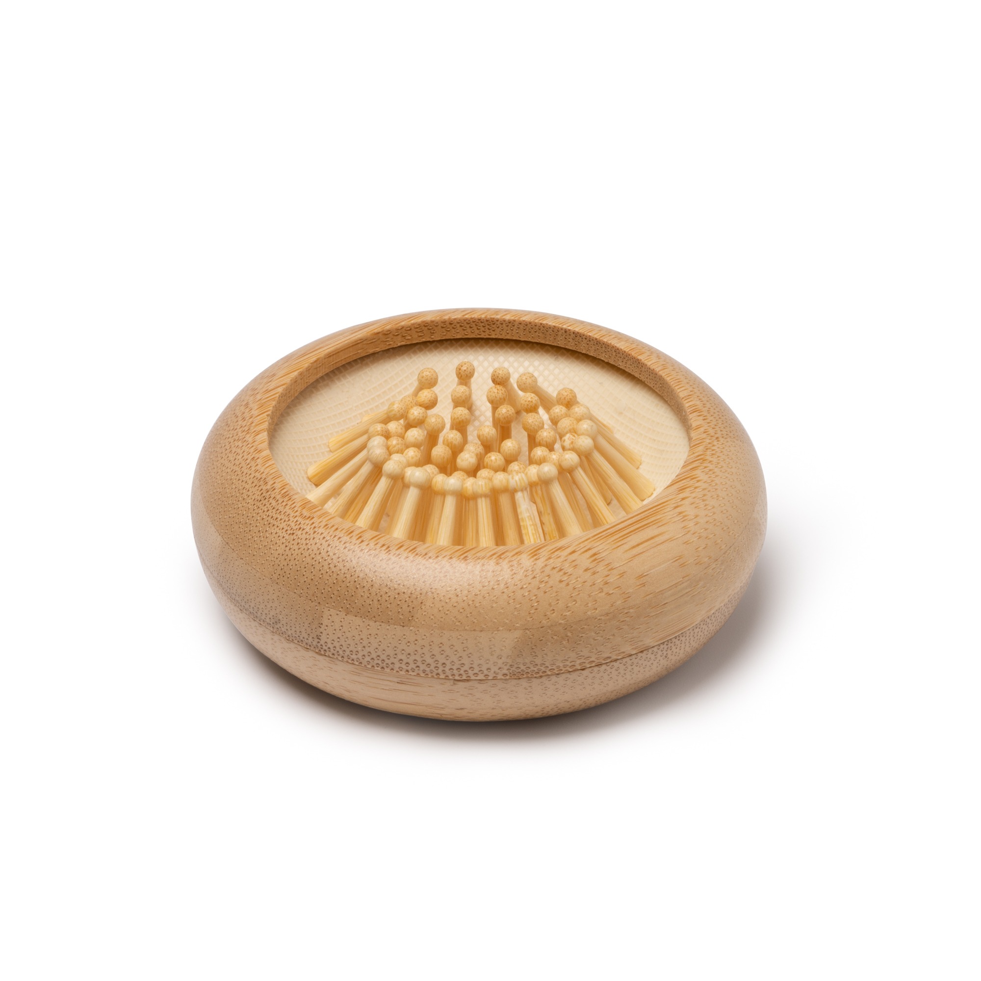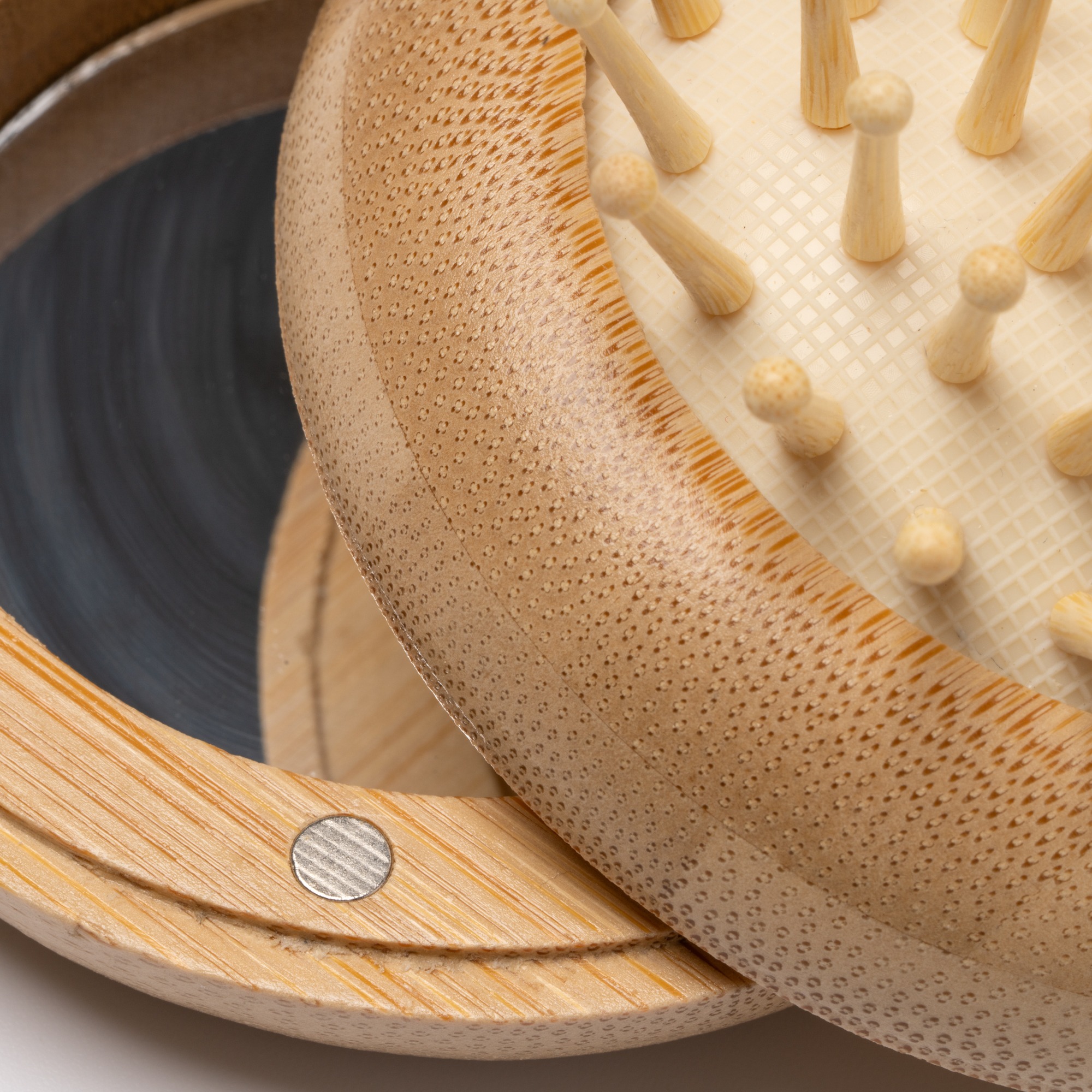 Spazzola pieghevole con corpo e setole in bambรน, dotata di uno specchio sul retro. Perfetta per una cura dei capelli pratica e sostenibile anche in viaggio.