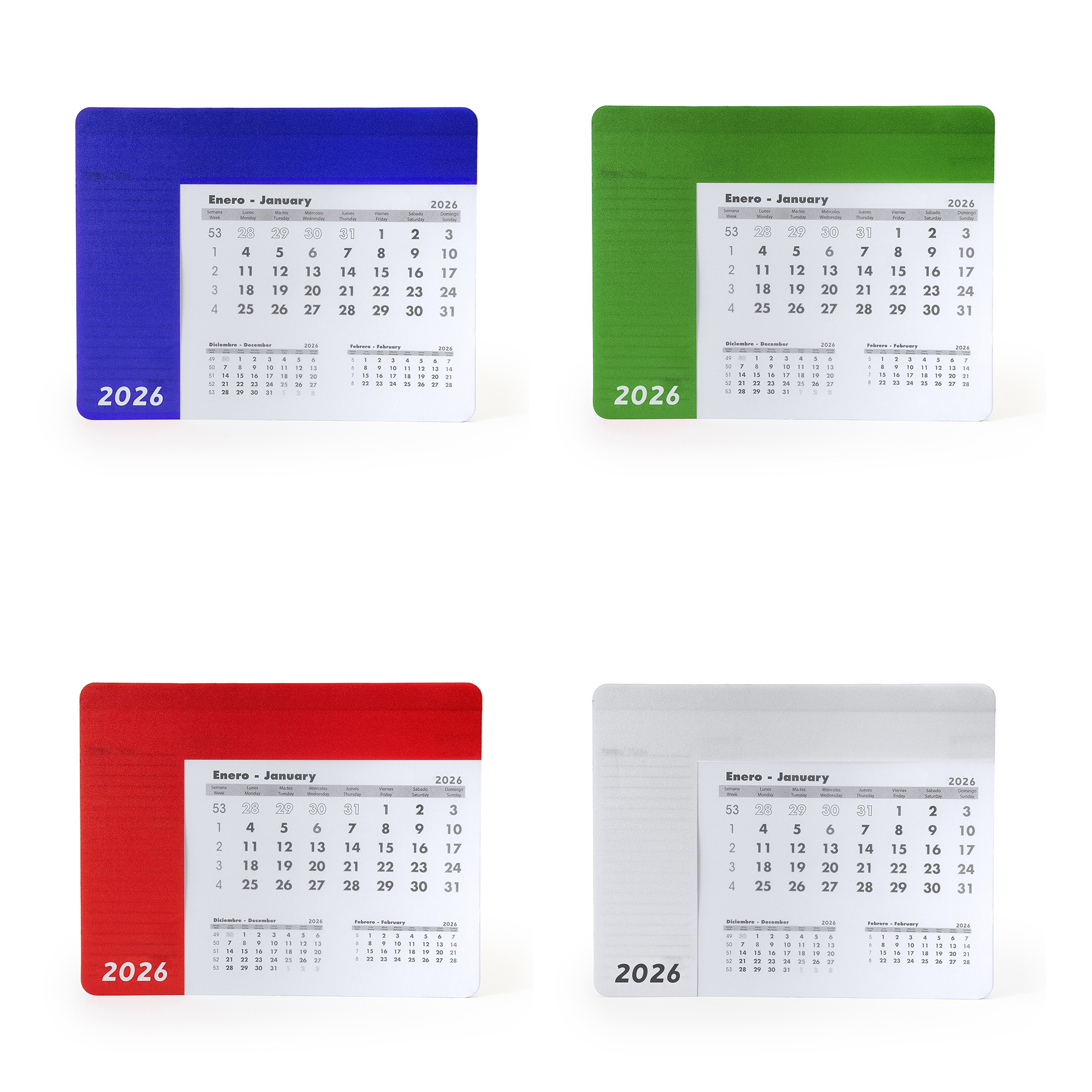 Tappetino per mouse rettangolare con calendario. Rivestimento colorato e trasparente, permette di vedere la relativa scheda del mese. Sollevando il rivestimento si accede al calendario di 12 schede in spagnolo e inglese, le cui pagine vengono staccate. Su ogni foglio mensile compaiono il mese corrente, il mese precedente e il mese successivo. Base nera antiscivolo. Peso carta 80 g/mยฒ. Spessore rivestimento 0,3 cm.