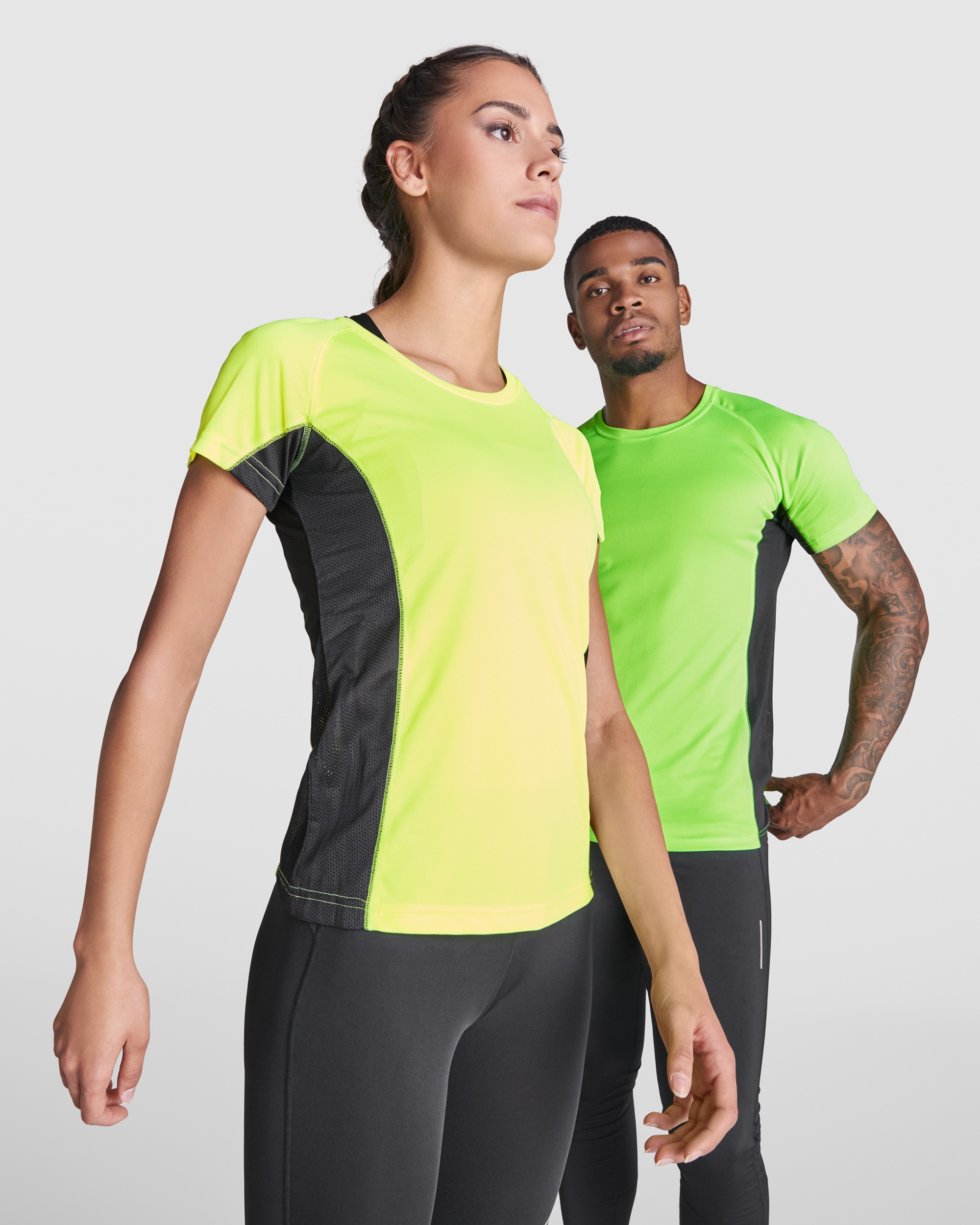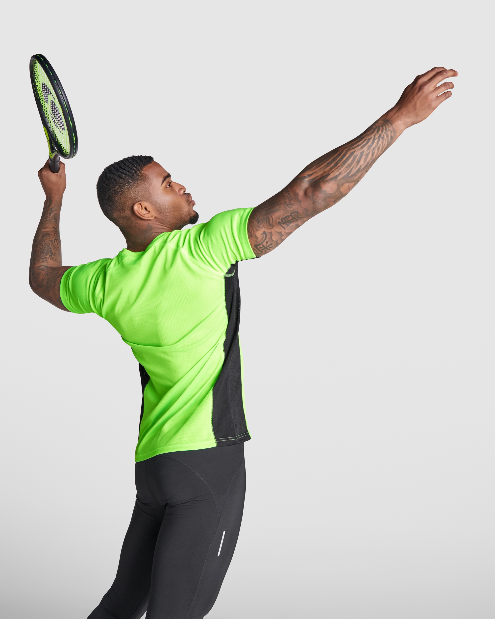 T-shirt tecnica con due tessuti in poliestere, maniche corte stile raglan. Tessuto principale occhio di pernice ,fasce laterali e interni della manica in tessuto microforato. Girocollo con copri cuciture di rinforzo interne. T-shirt in tessuto confortevole che si adatta facilmente al corpo.