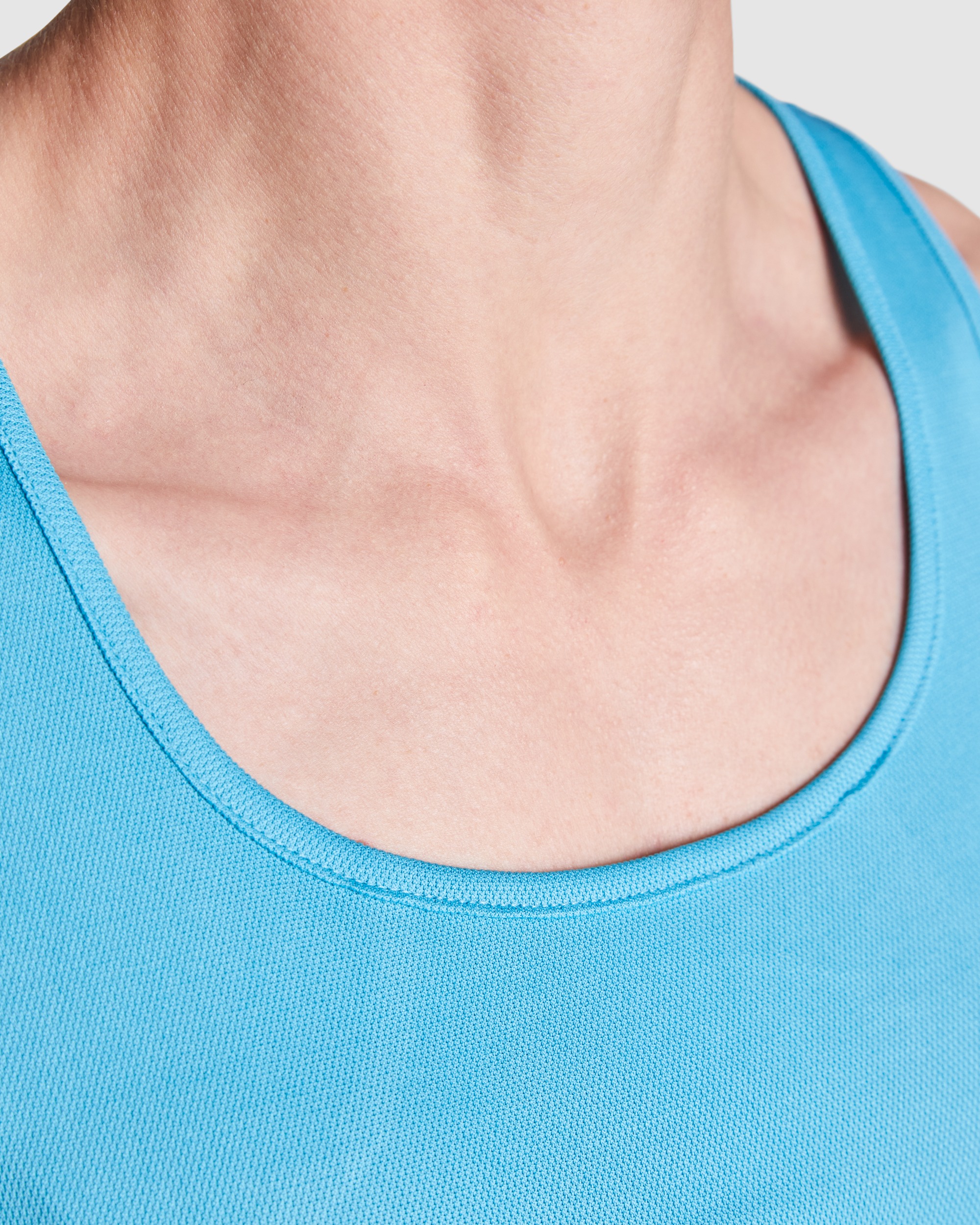 Canotta sportiva con giromanica e scollo doppia cucitura. Spalline incrociate sulla schiena e cuciture laterali.
